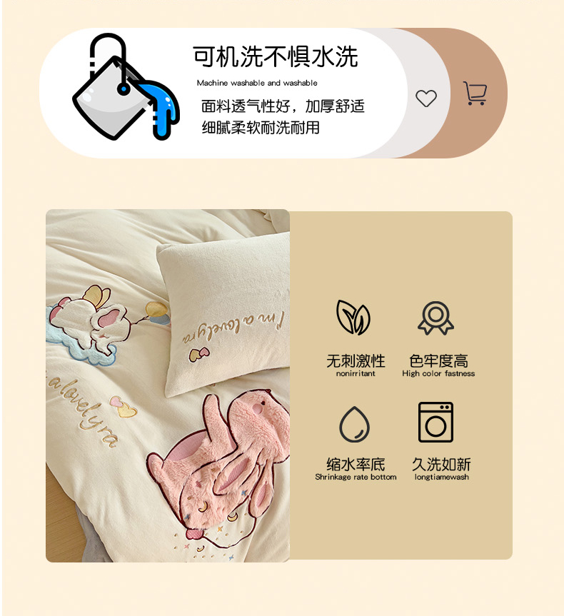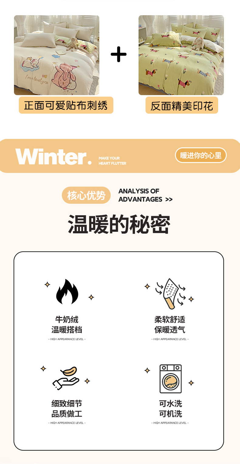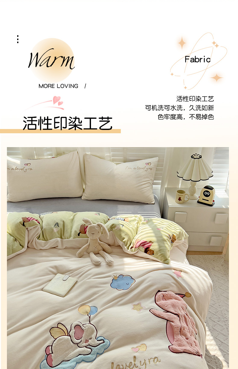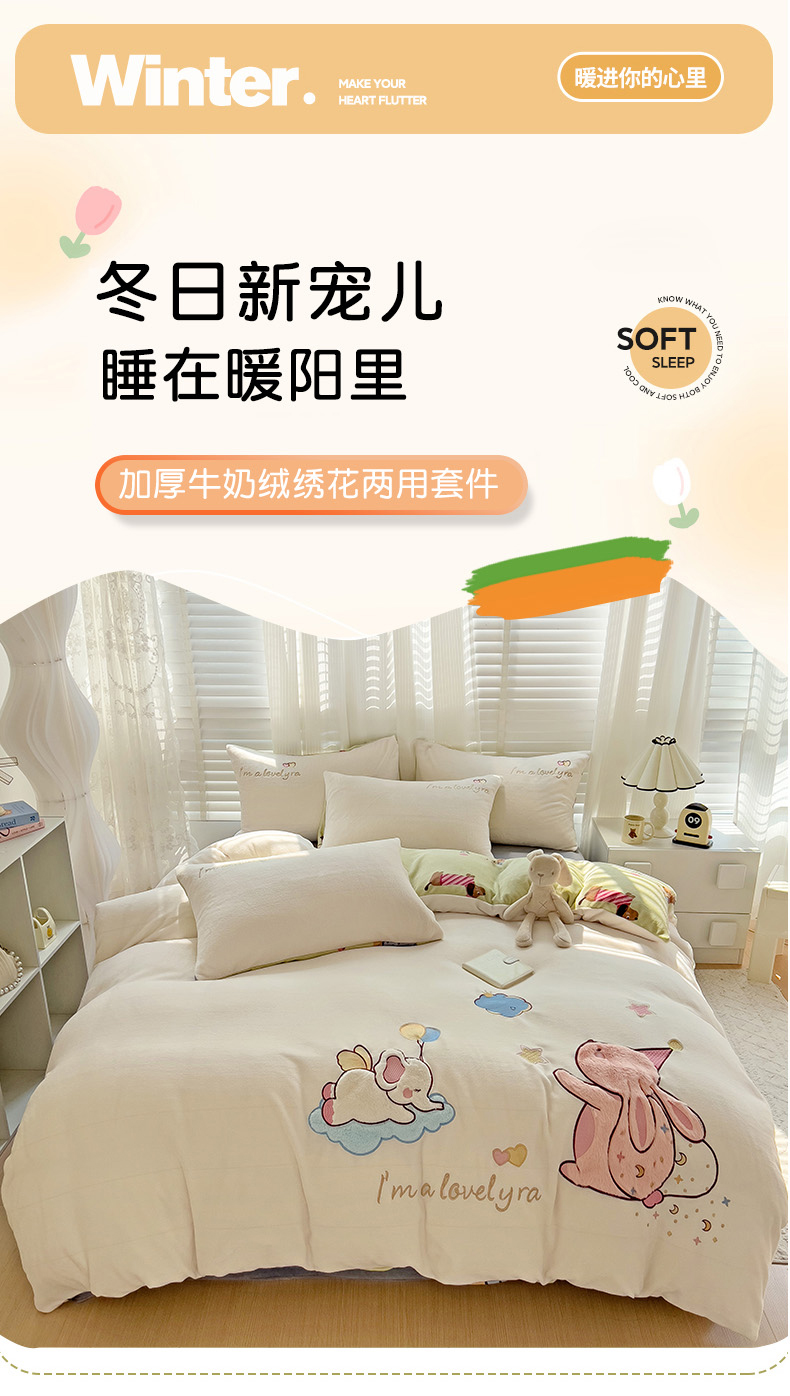 当前位置: 91家纺网 > 商品网购 > 床品套件 > 四件套 > 牛奶绒四件套 > 2024新款一套两款式加厚牛奶绒贴布刺绣加印花四件套 可爱兔-白贴布绣-狗狗乐园印花