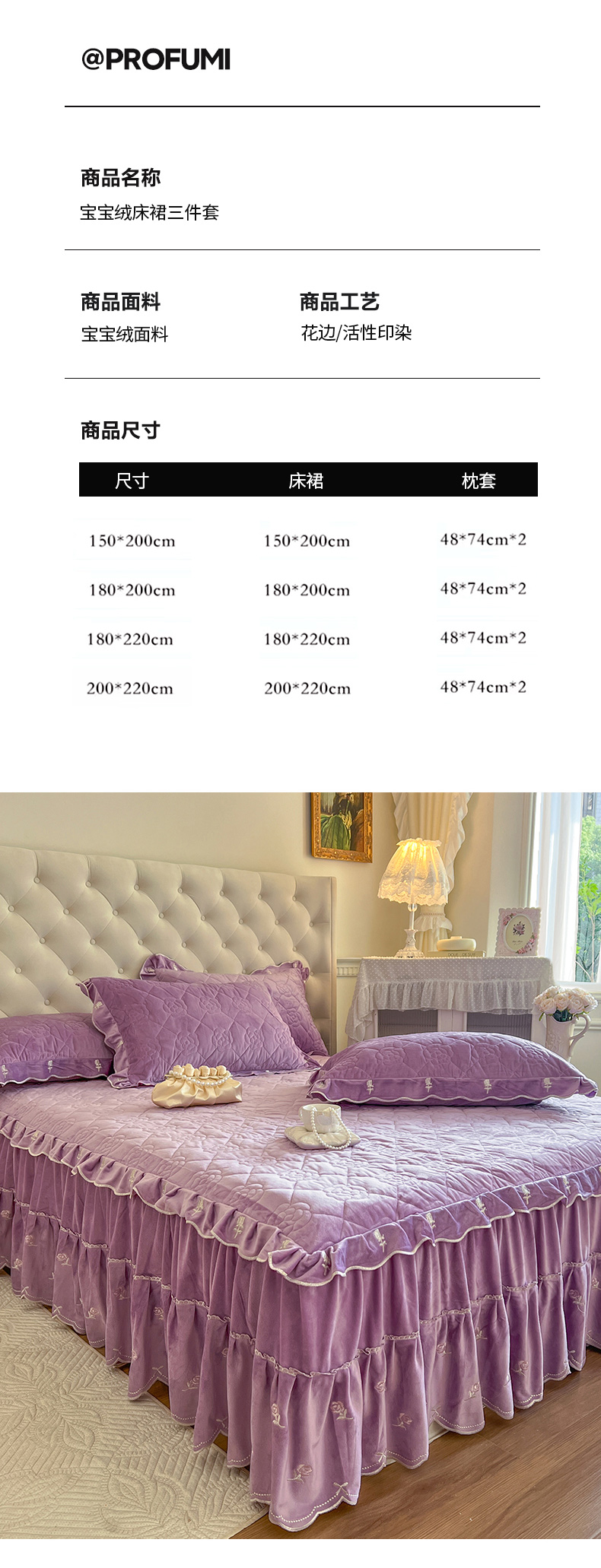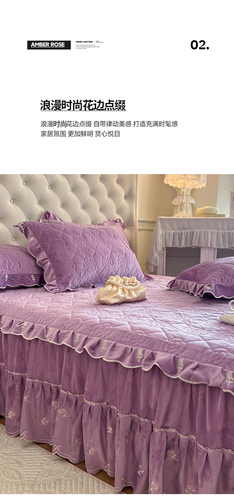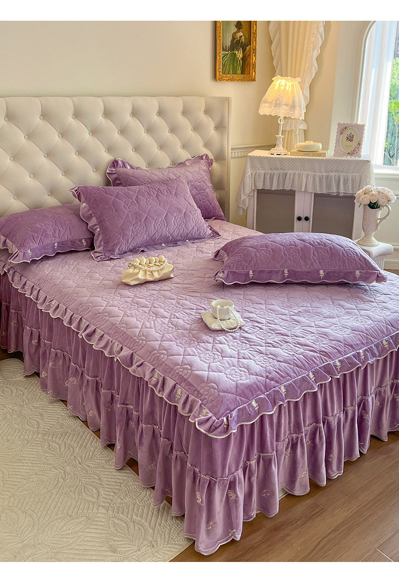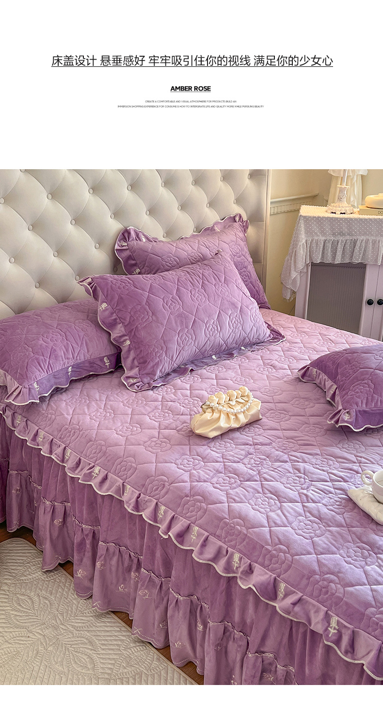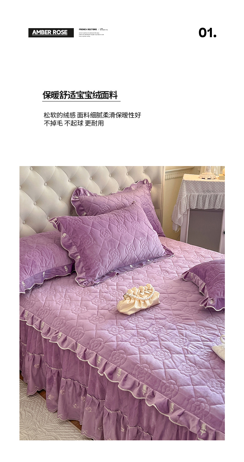 商品名称:网红馆(ck家纺) 2025新款高克重加厚保暖时尚花边宝宝绒乐伊系列床裙三件套 乐伊-紫