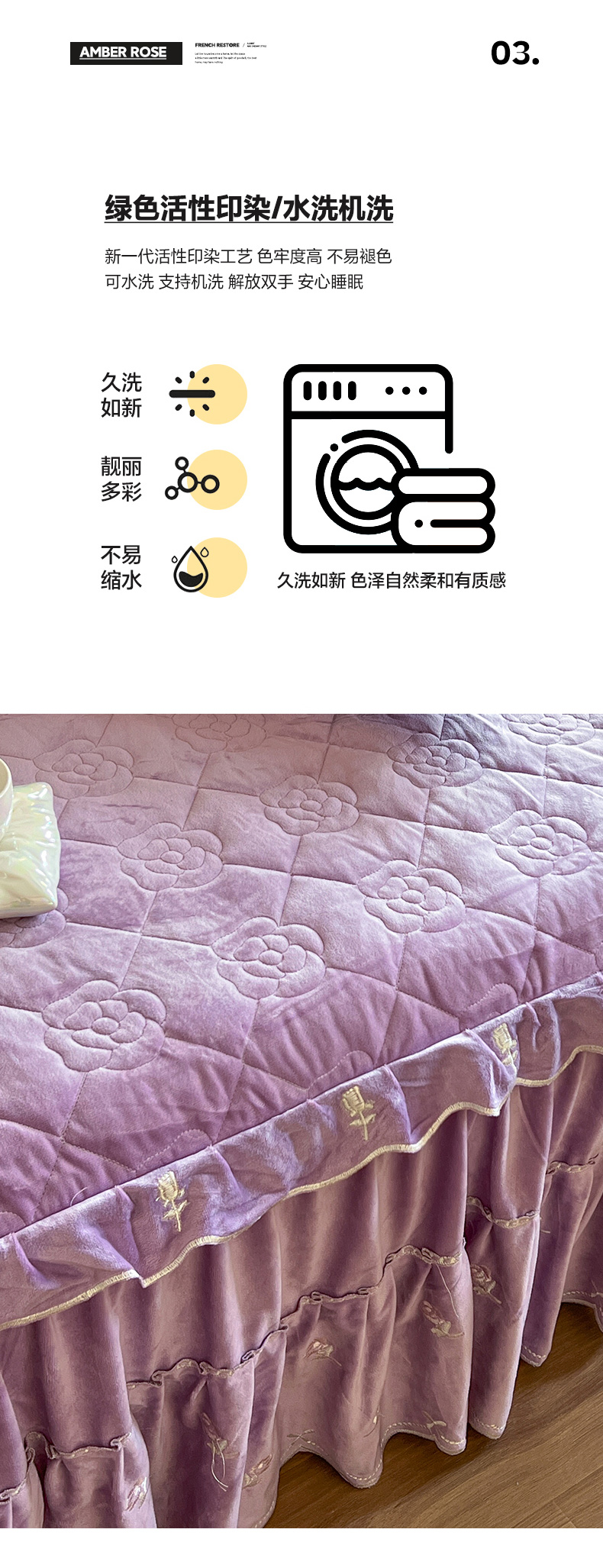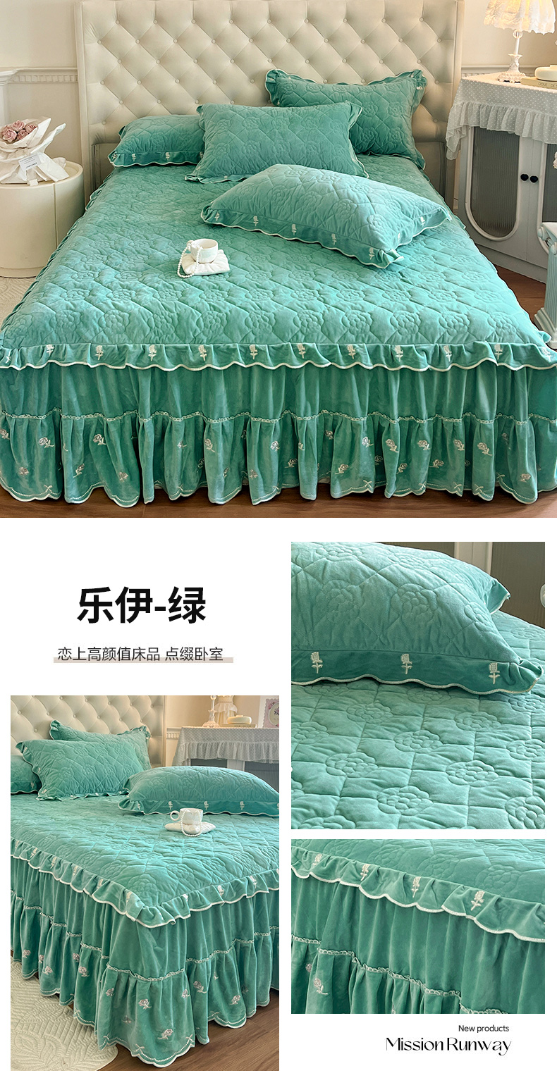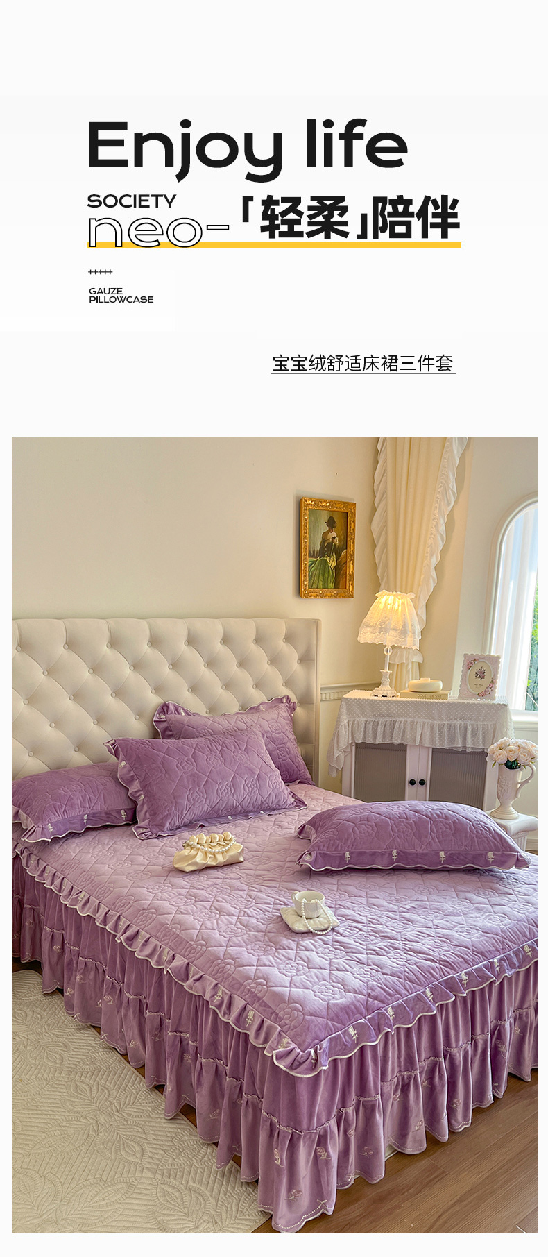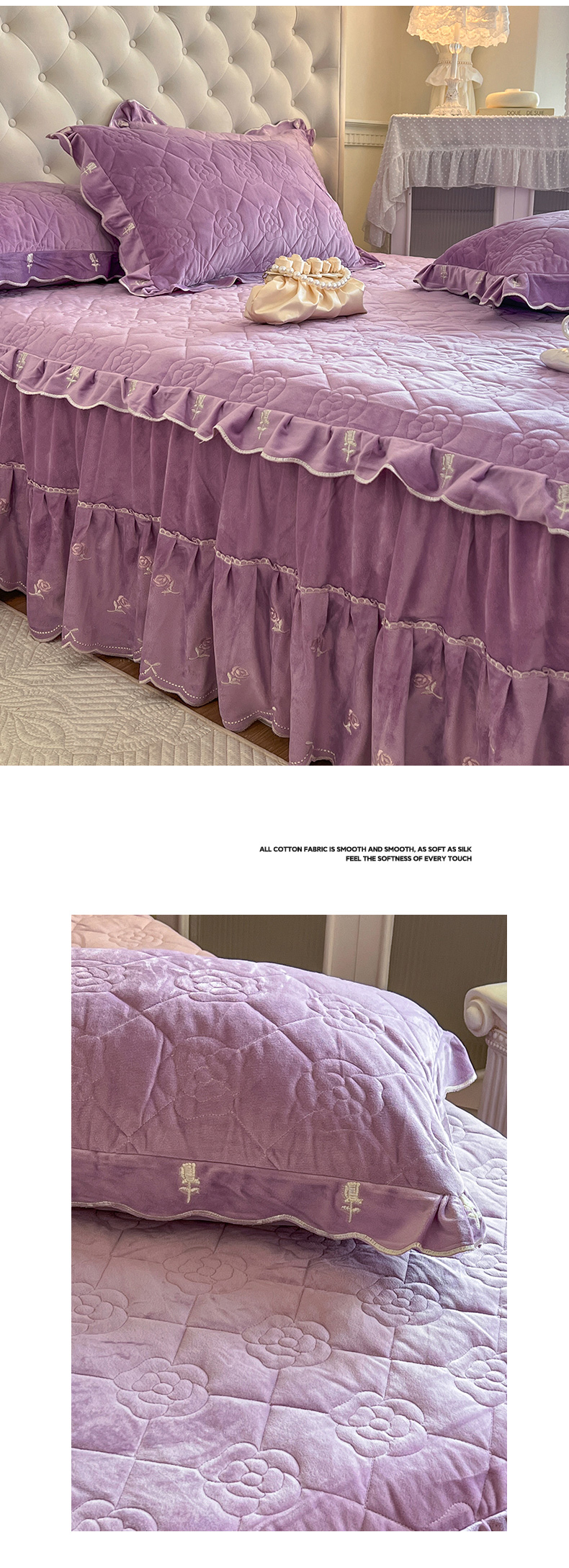 商品名称:网红馆(ck家纺) 2025新款高克重加厚保暖时尚花边宝宝绒乐伊系列床裙三件套 乐伊-紫