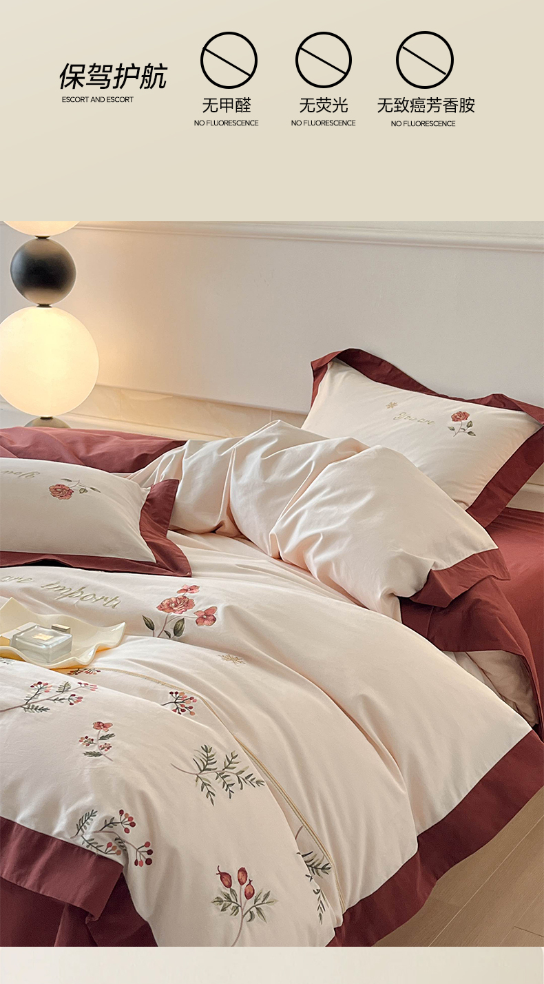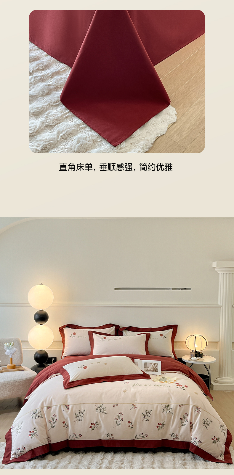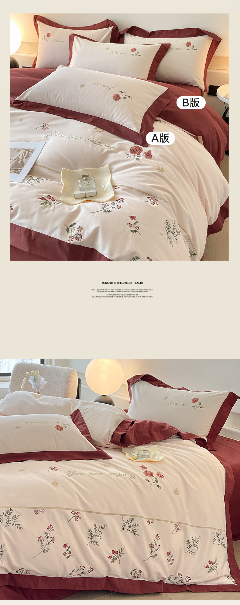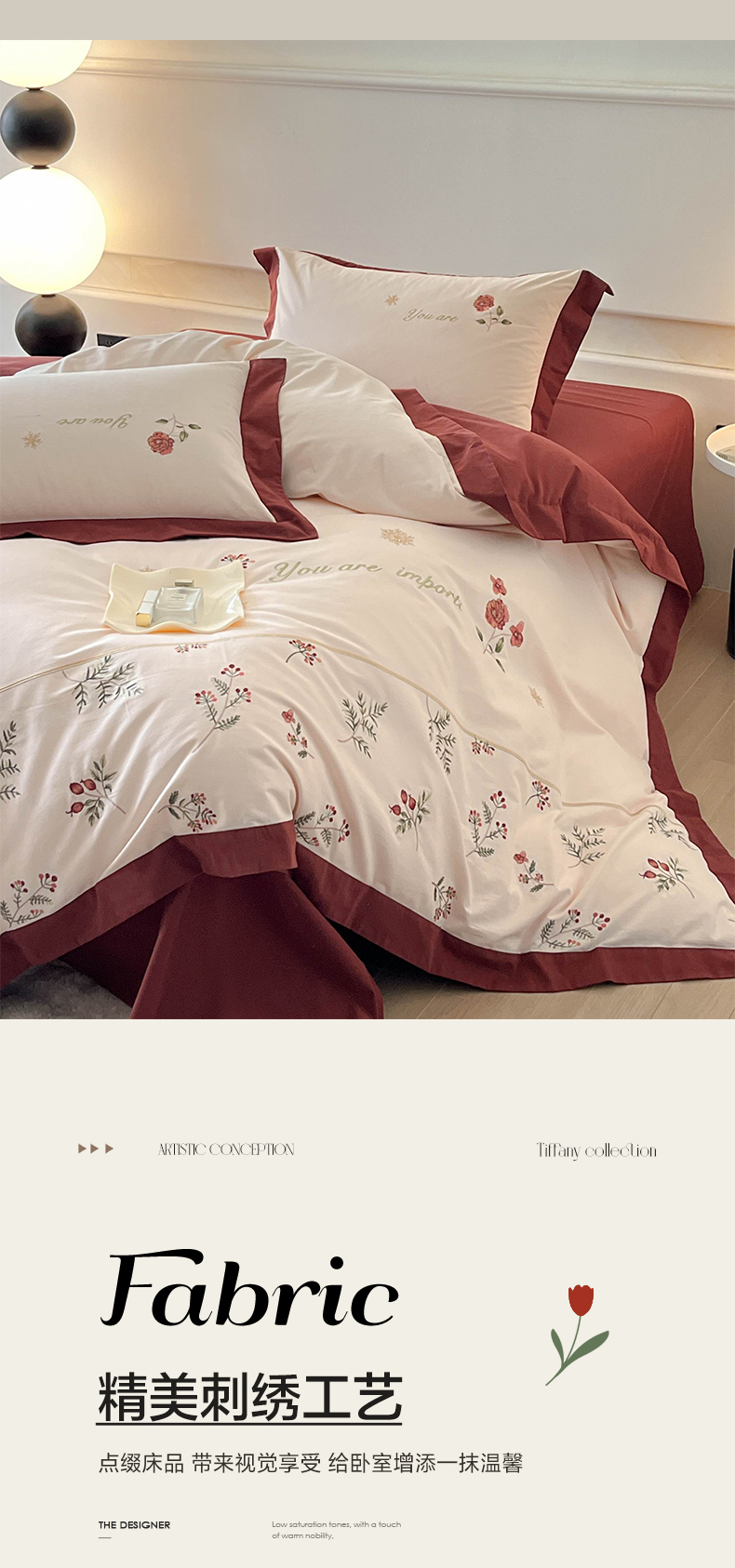 遇见家居生活馆 2024新款A类全棉磨毛刺绣四件套-丽莎 丽莎-洛可红