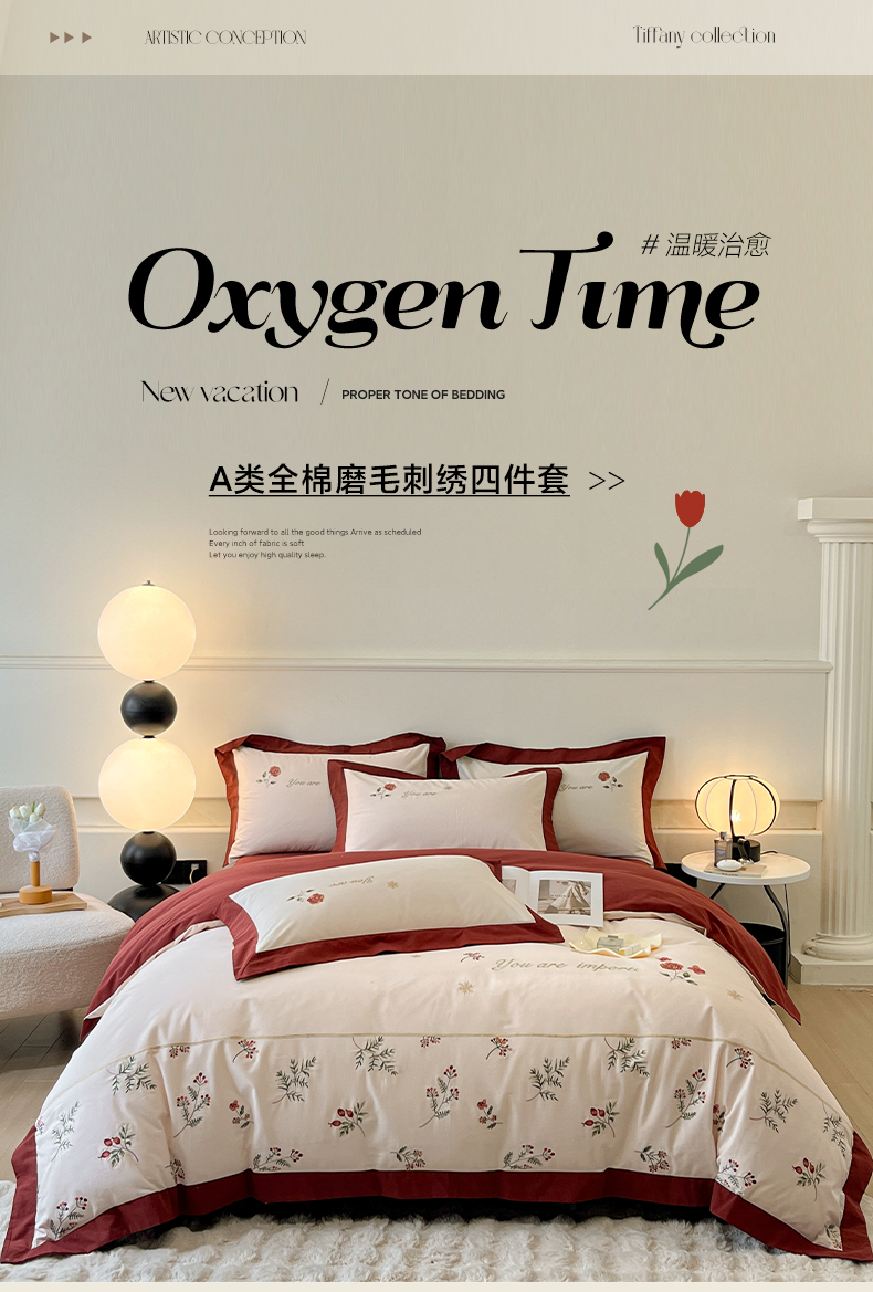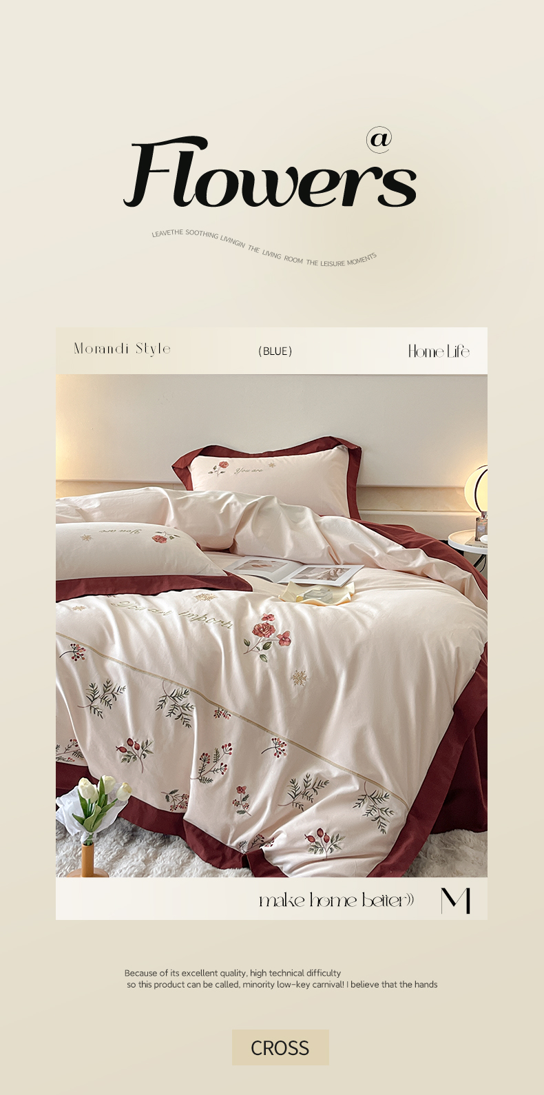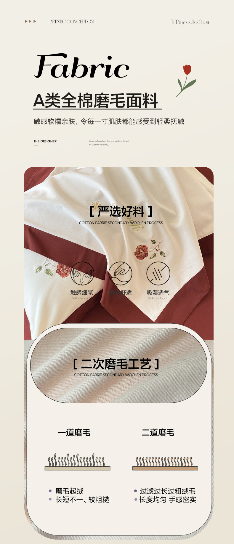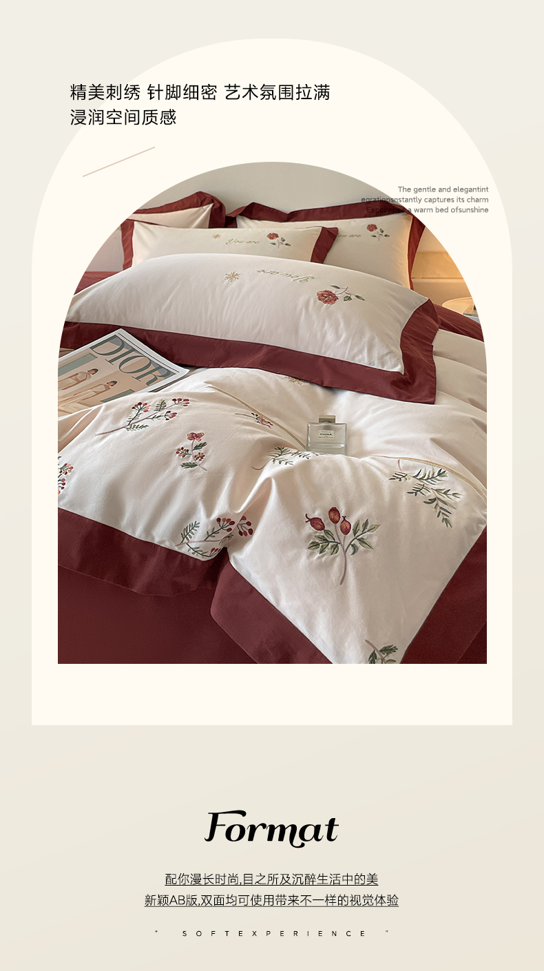 遇见家居生活馆 2024新款A类全棉磨毛刺绣四件套-丽莎 丽莎-洛可红