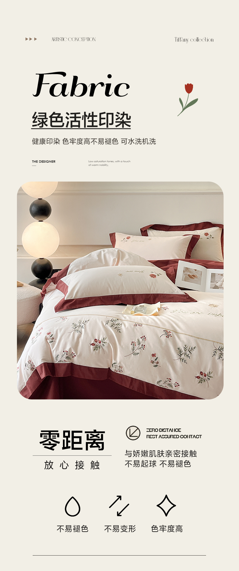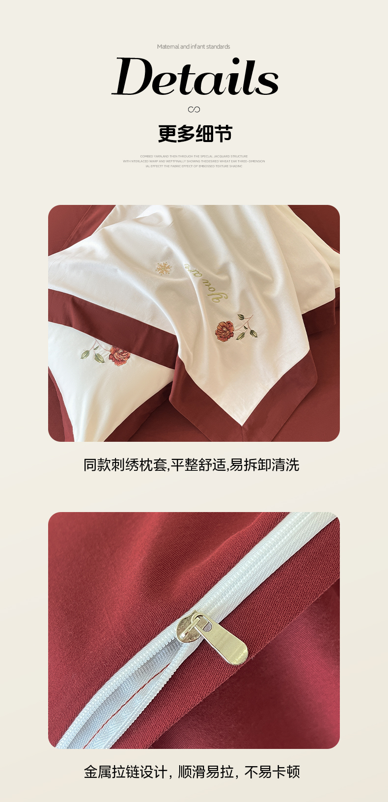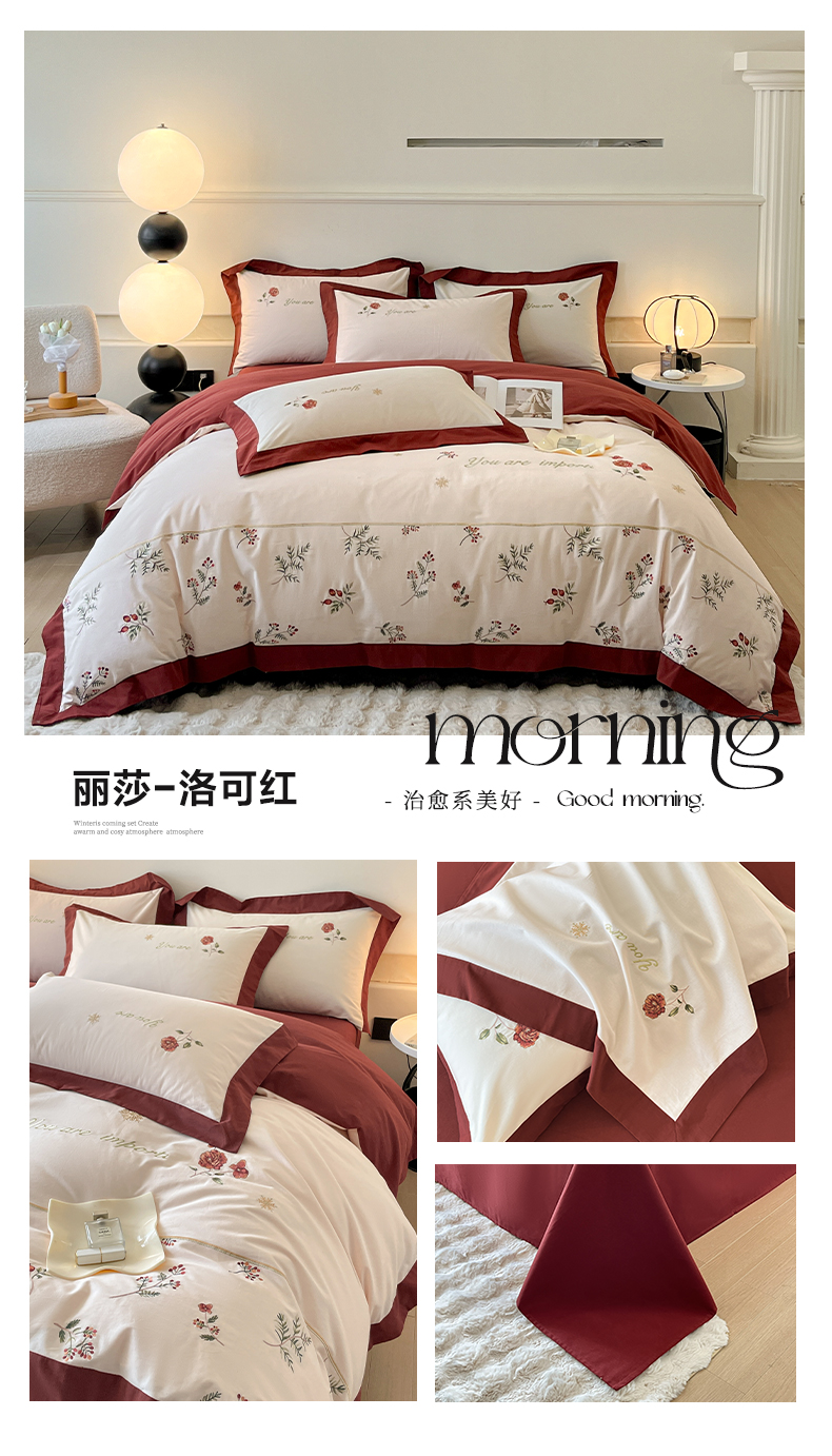 商品名称:遇见家居生活馆 2024新款A类全棉磨毛刺绣四件套-丽莎 丽莎-洛可红