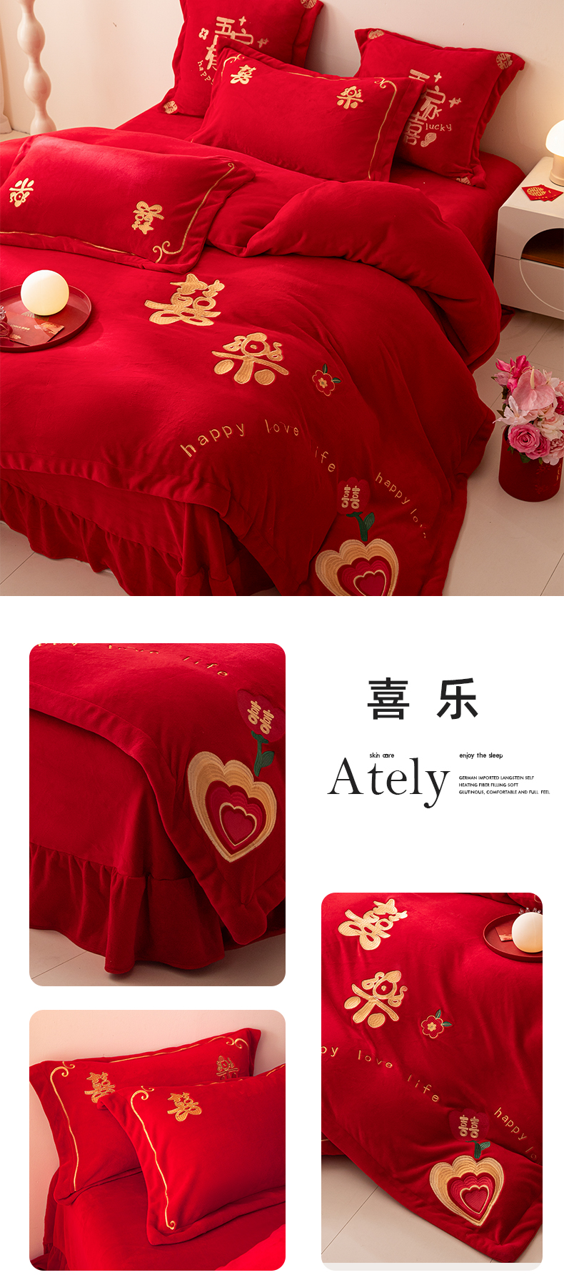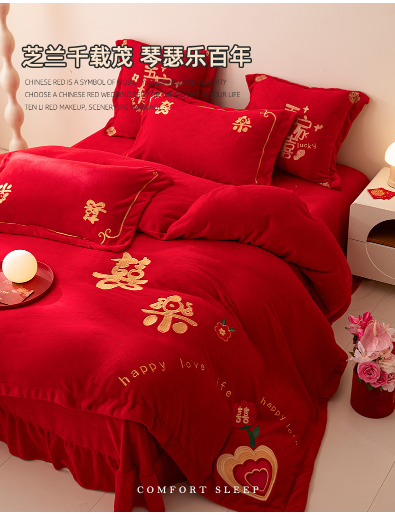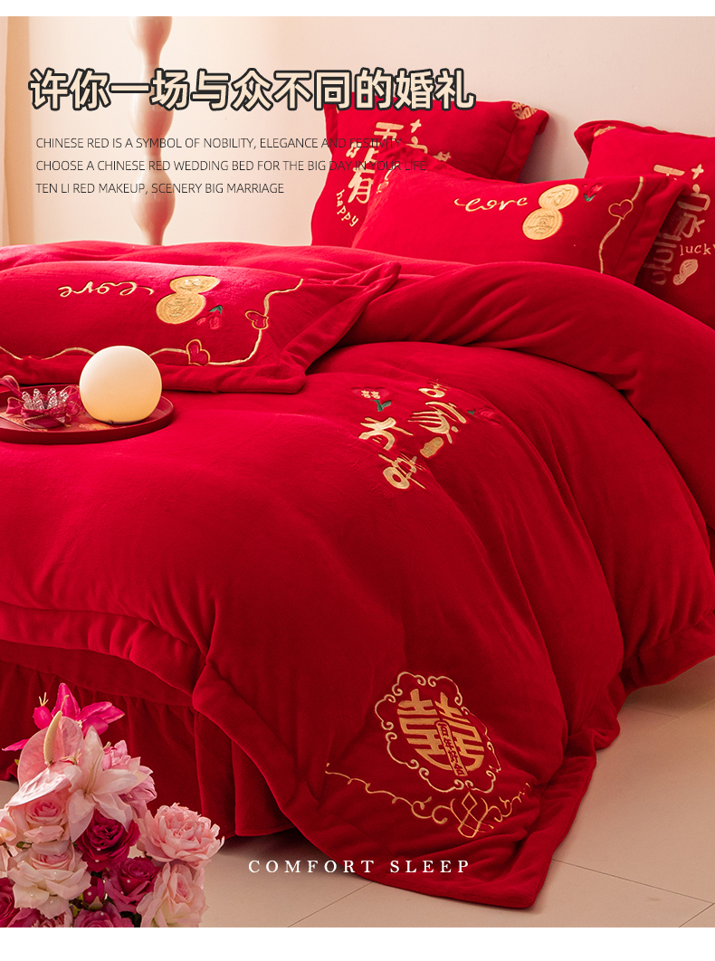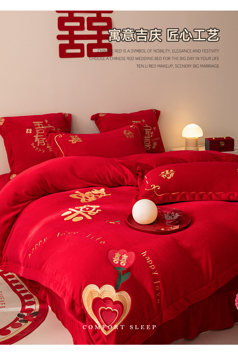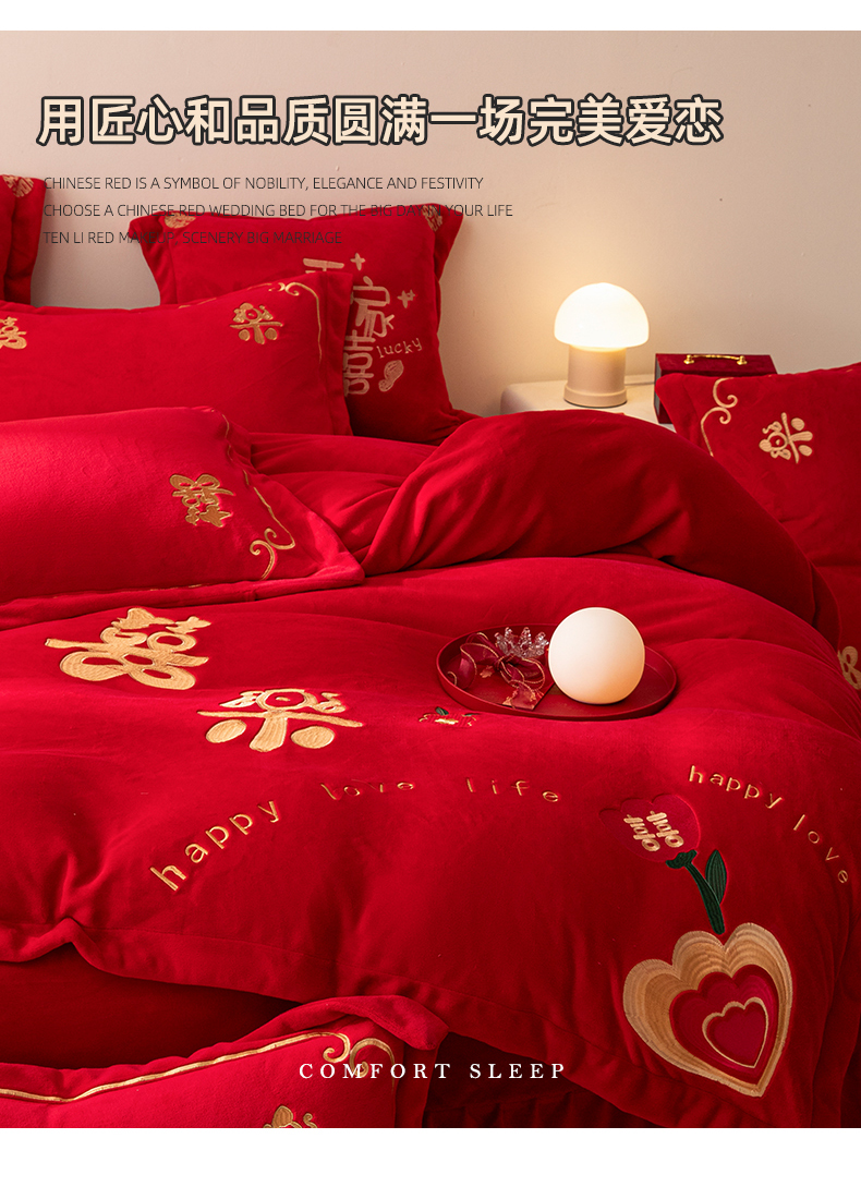当前位置: 91家纺网 > 商品网购 > 床品套件 > 四件套 > 牛奶绒四件套 > 2025新款高克重花边贴布款牛奶绒婚庆刺绣四件套 牛奶绒婚庆-喜乐