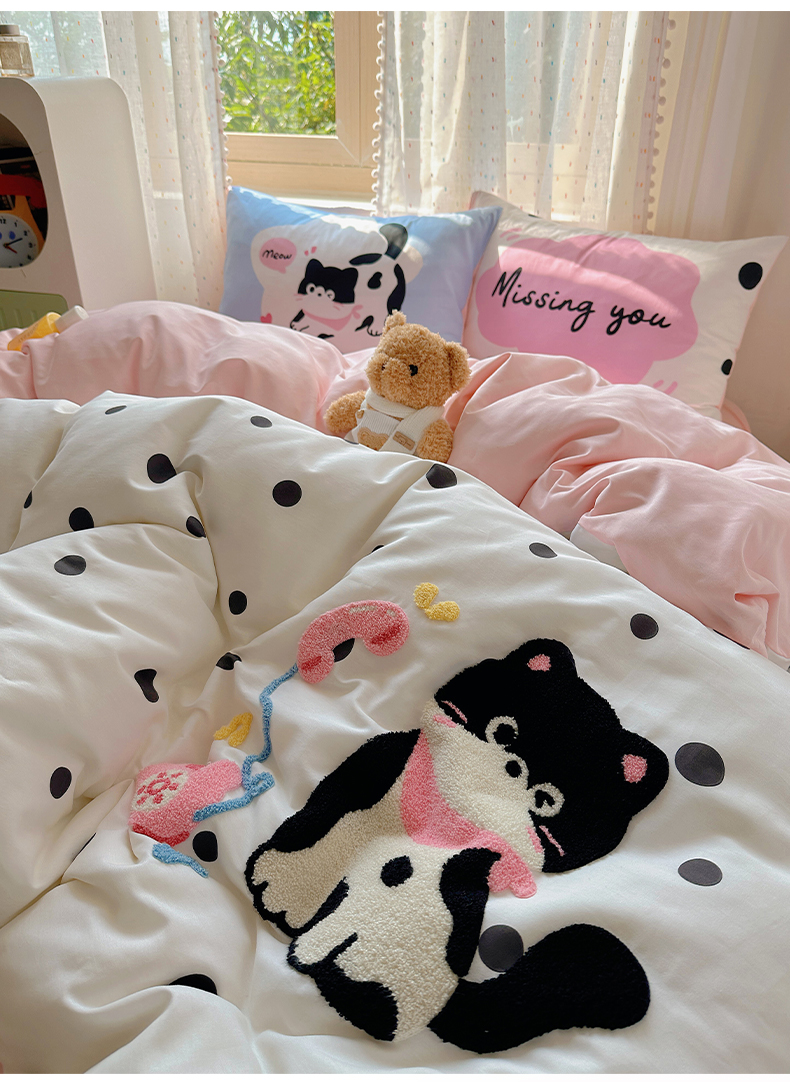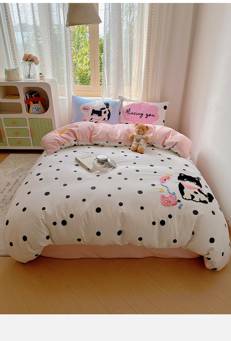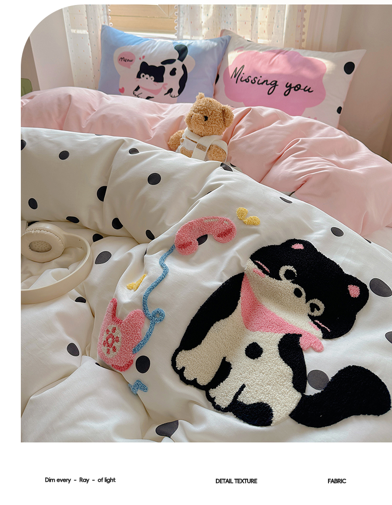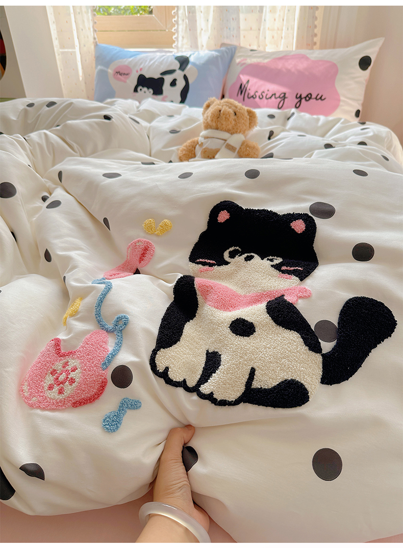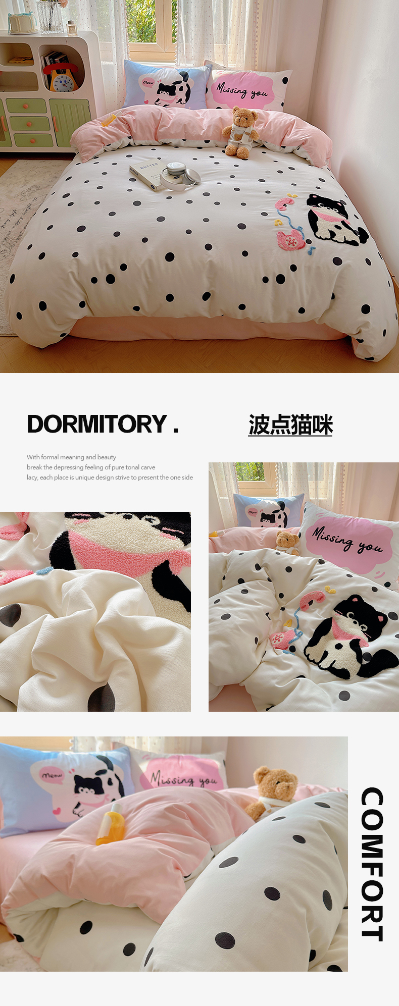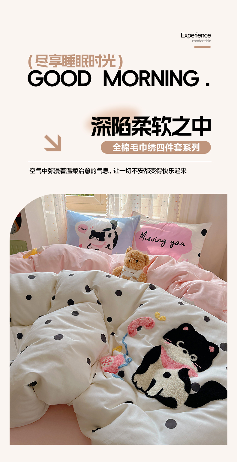 美乐迪家纺 2025新款全棉绣花毛巾绣四件套 波点猫咪