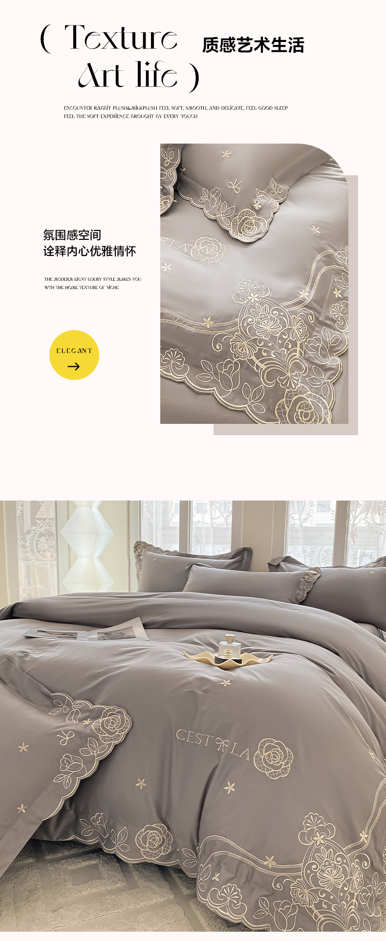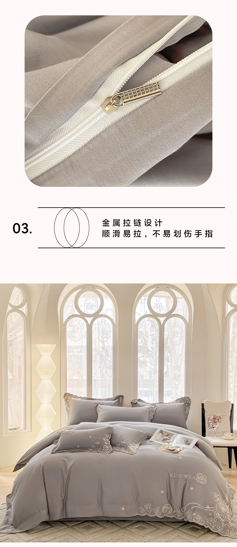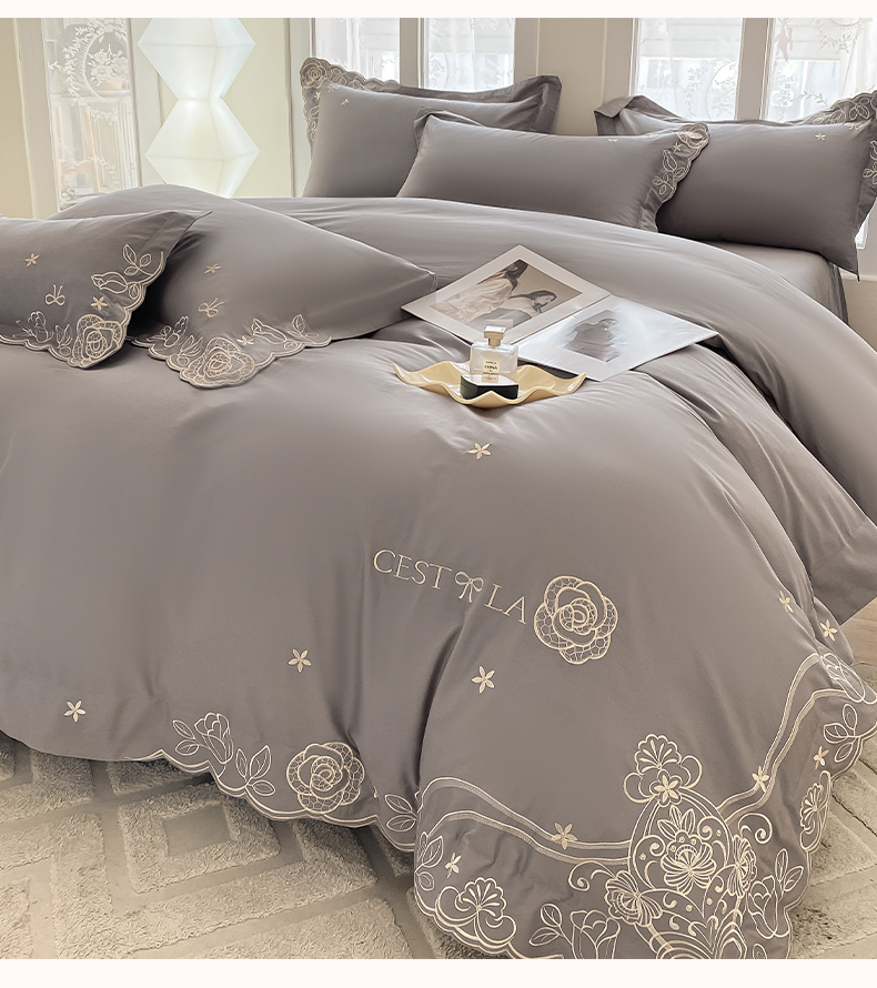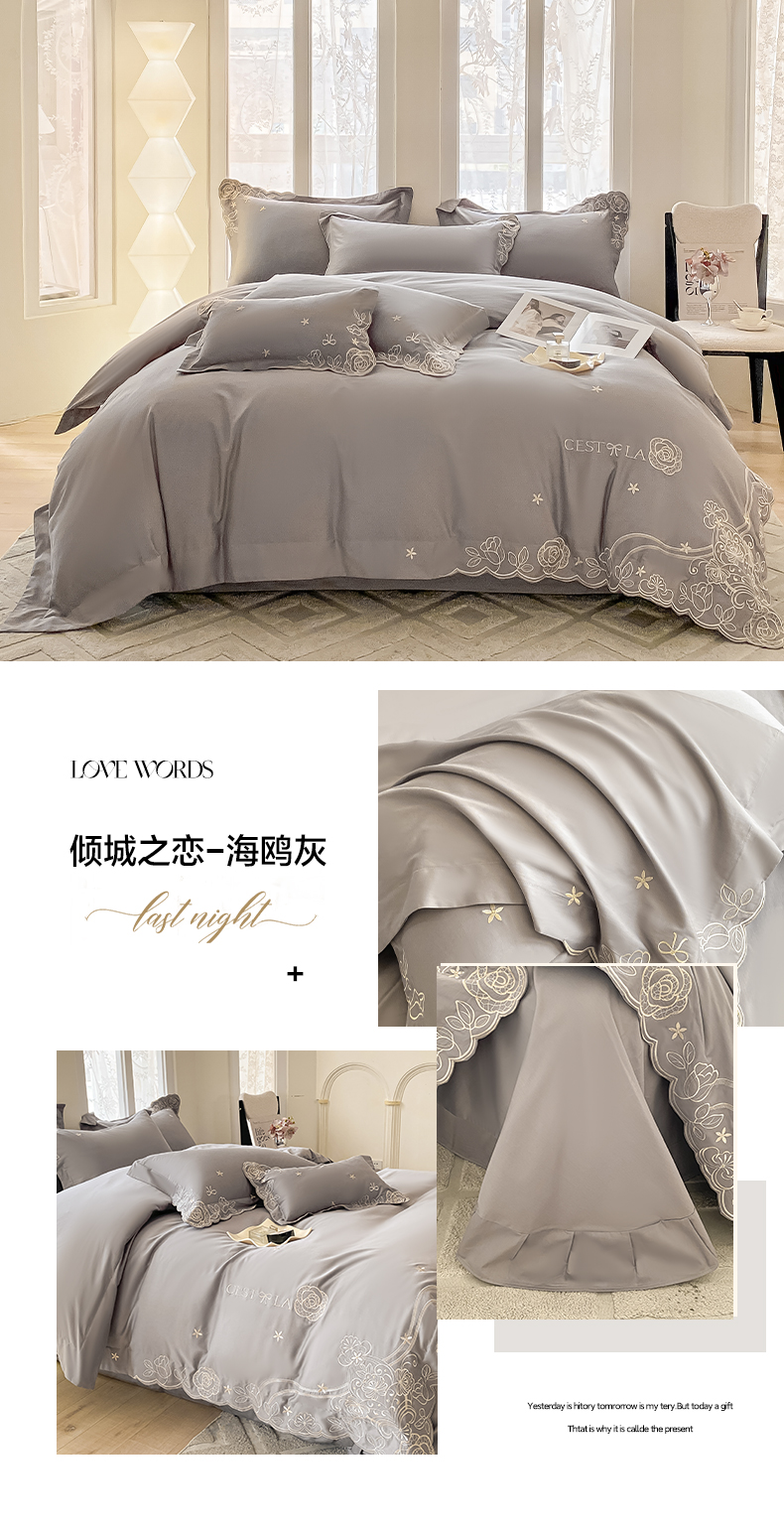 祺瑞佳家纺 2025新款A类100%双面纯棉法式刺绣花四件套全棉长绒棉四季款床单床笠——倾城之恋 倾城之恋-海鸥灰