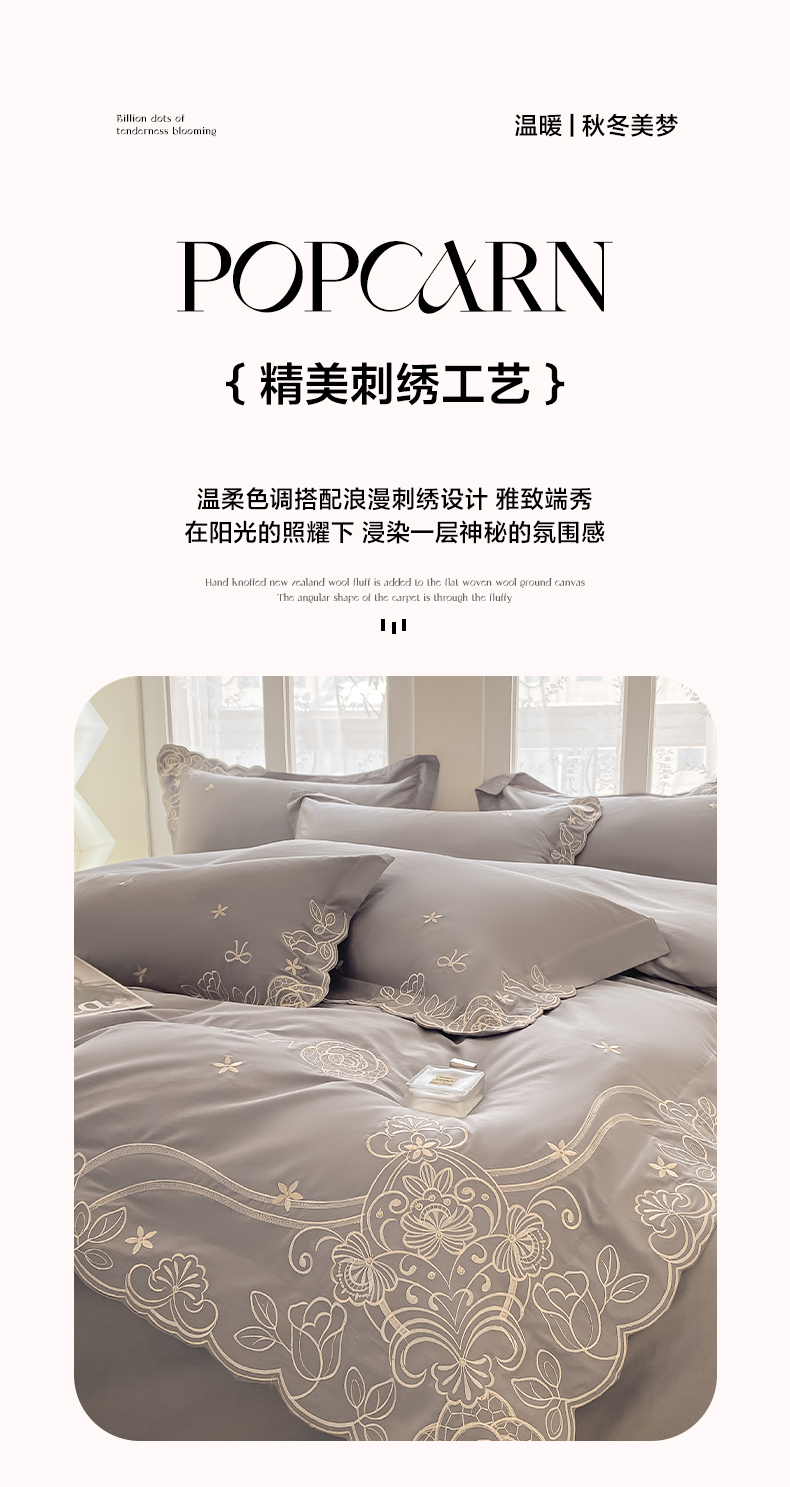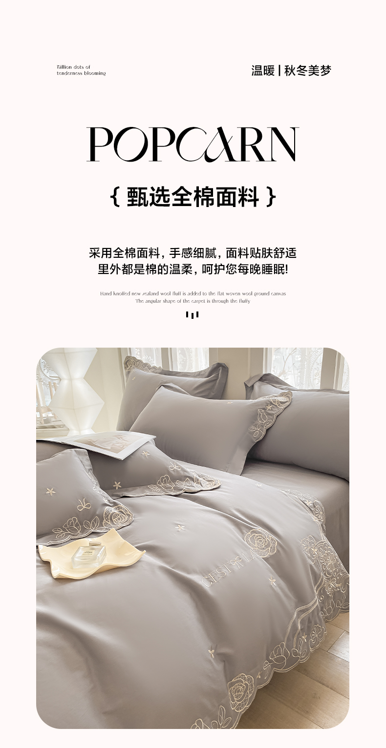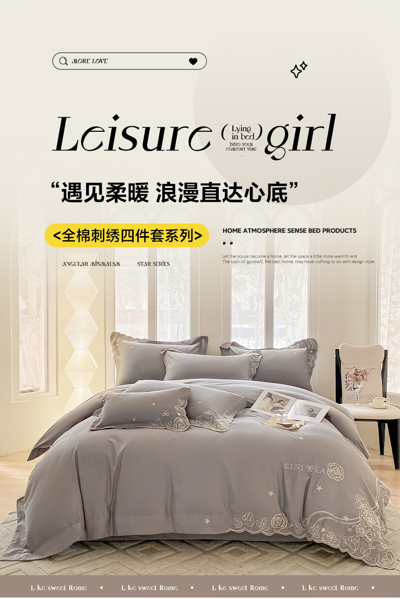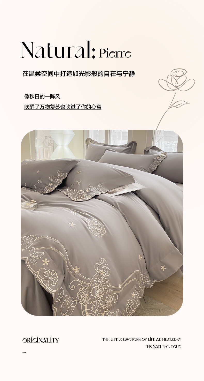 祺瑞佳家纺 2025新款A类100%双面纯棉法式刺绣花四件套全棉长绒棉四季款床单床笠——倾城之恋 倾城之恋-海鸥灰
