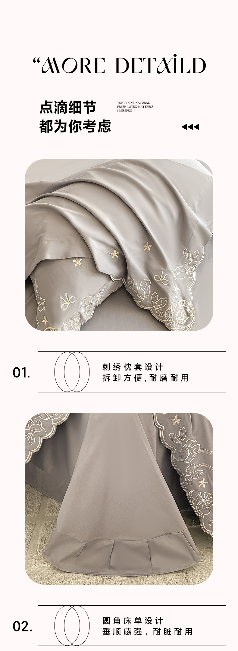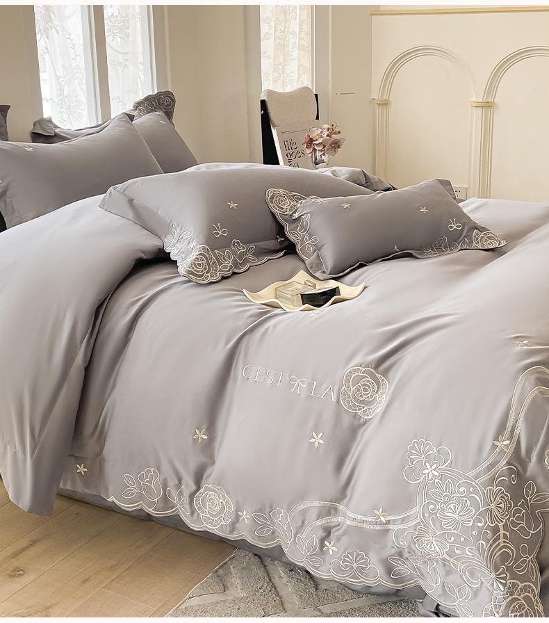 商品名称:祺瑞佳家纺 2025新款A类100%双面纯棉法式刺绣花四件套全棉长绒棉四季款床单床笠——倾城之恋 倾城之恋-海鸥灰