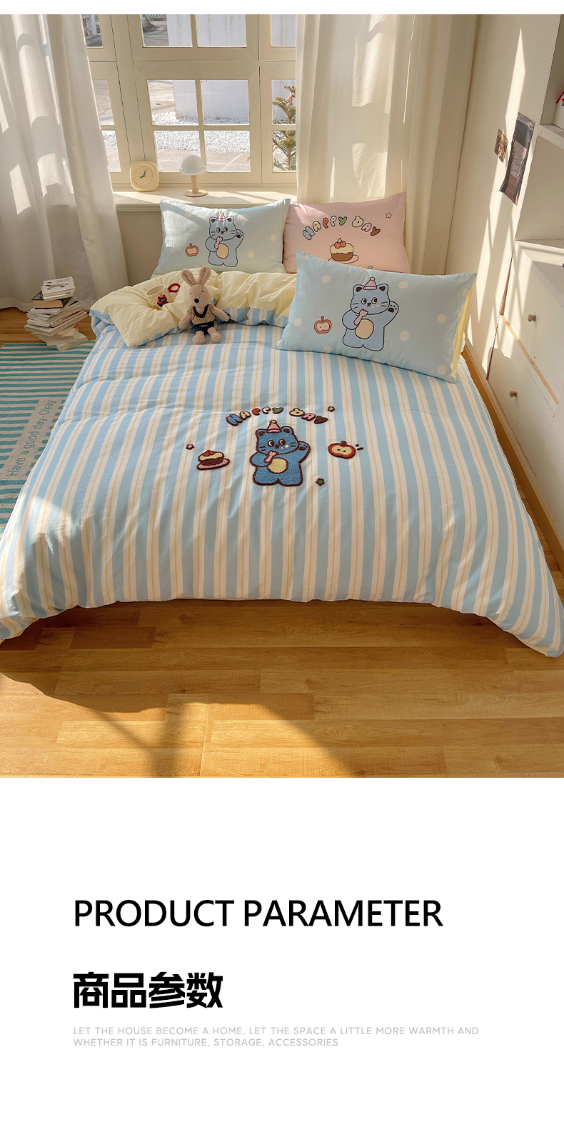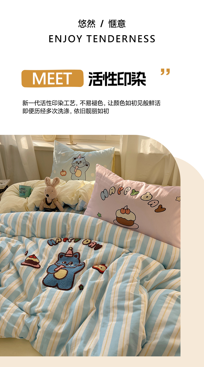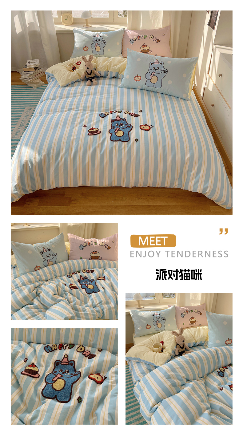 商品名称:美乐迪家纺 2025新款休闲风系列全棉毛巾绣四件套 派对猫咪