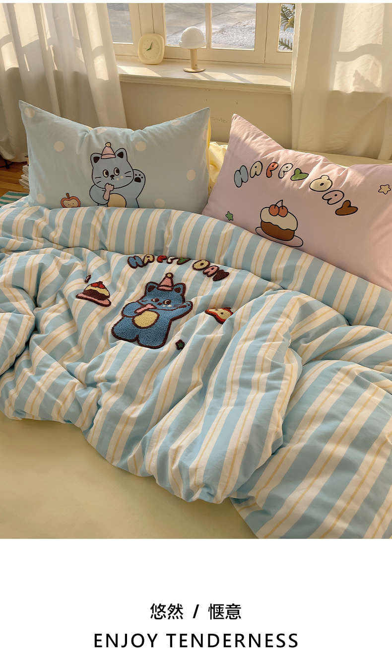 美乐迪家纺 2025新款休闲风系列全棉毛巾绣四件套 派对猫咪