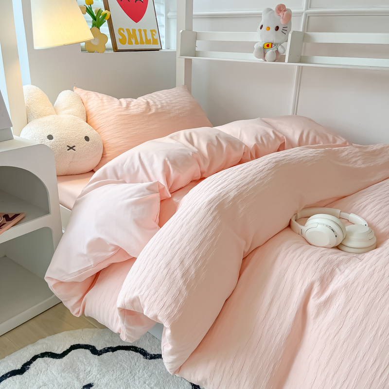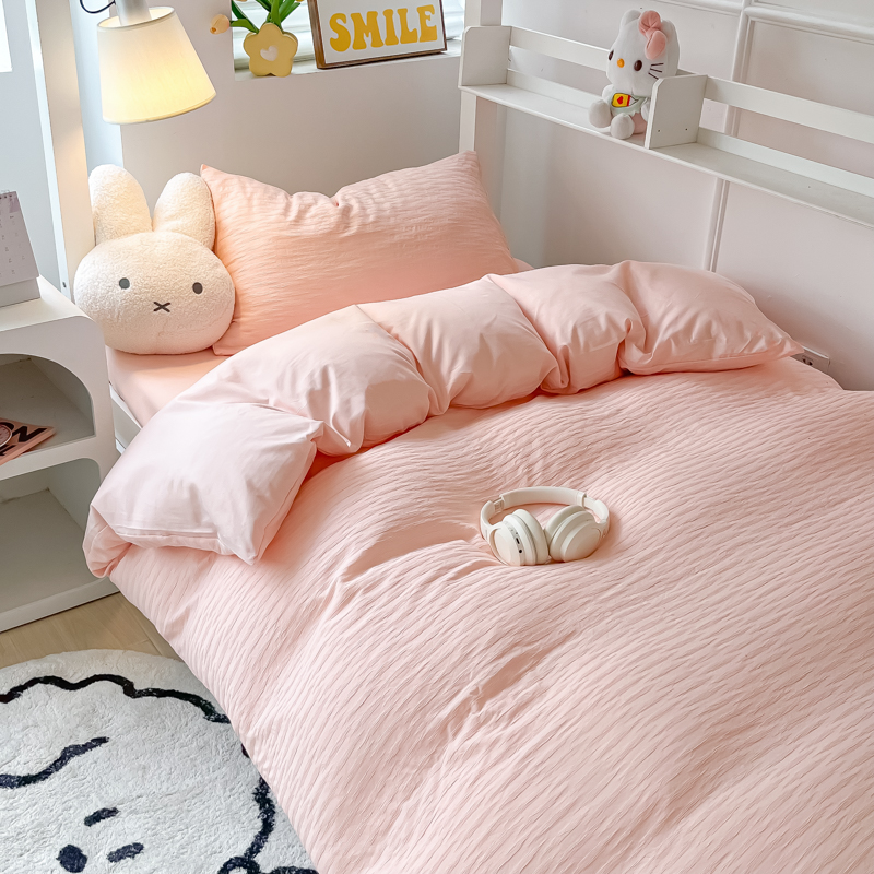 • 91家纺网 家纺一手货源 找家纺 悦织湾2025新款水洗棉泡泡纱系列三件套学生宿舍单人三件套轻奢时尚床上用品四件套 泡泡纱-纯粉