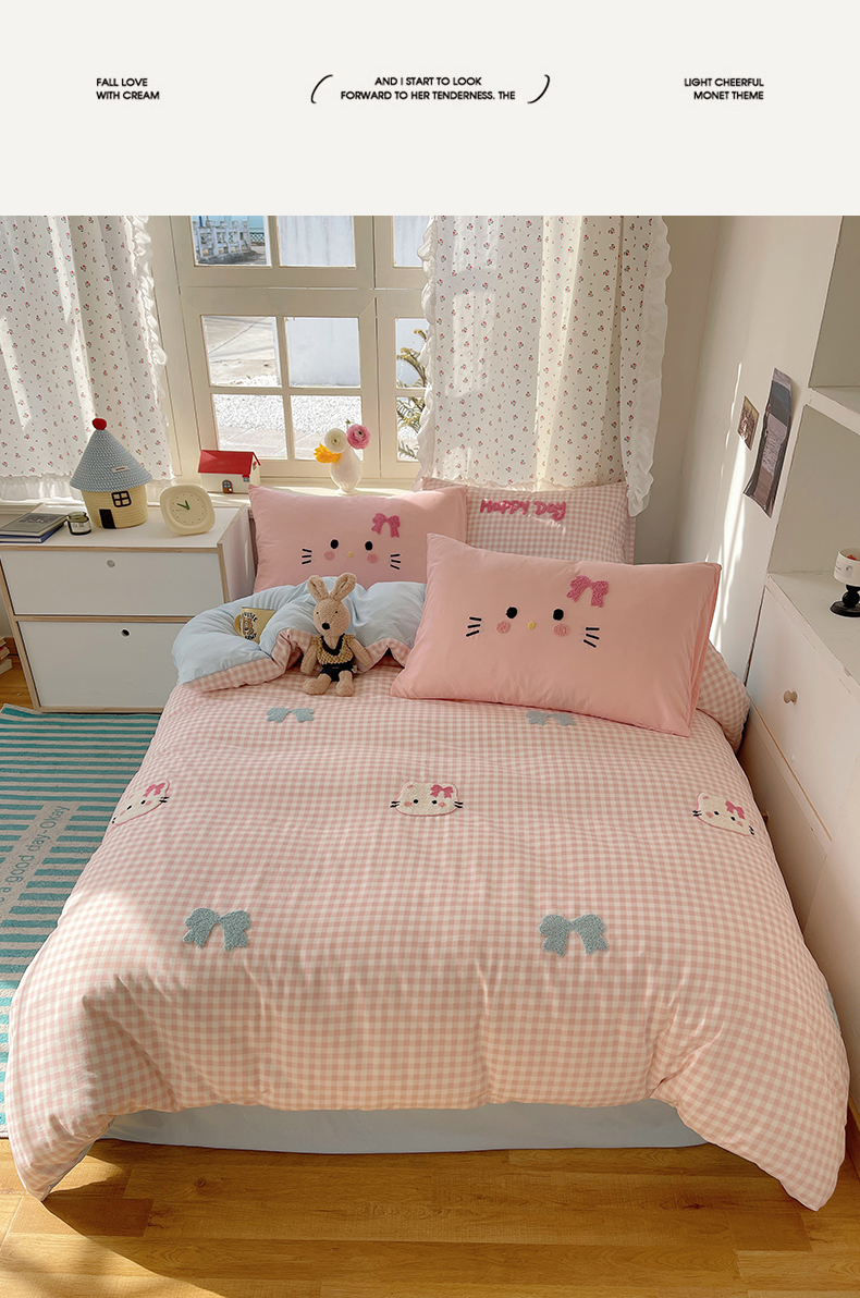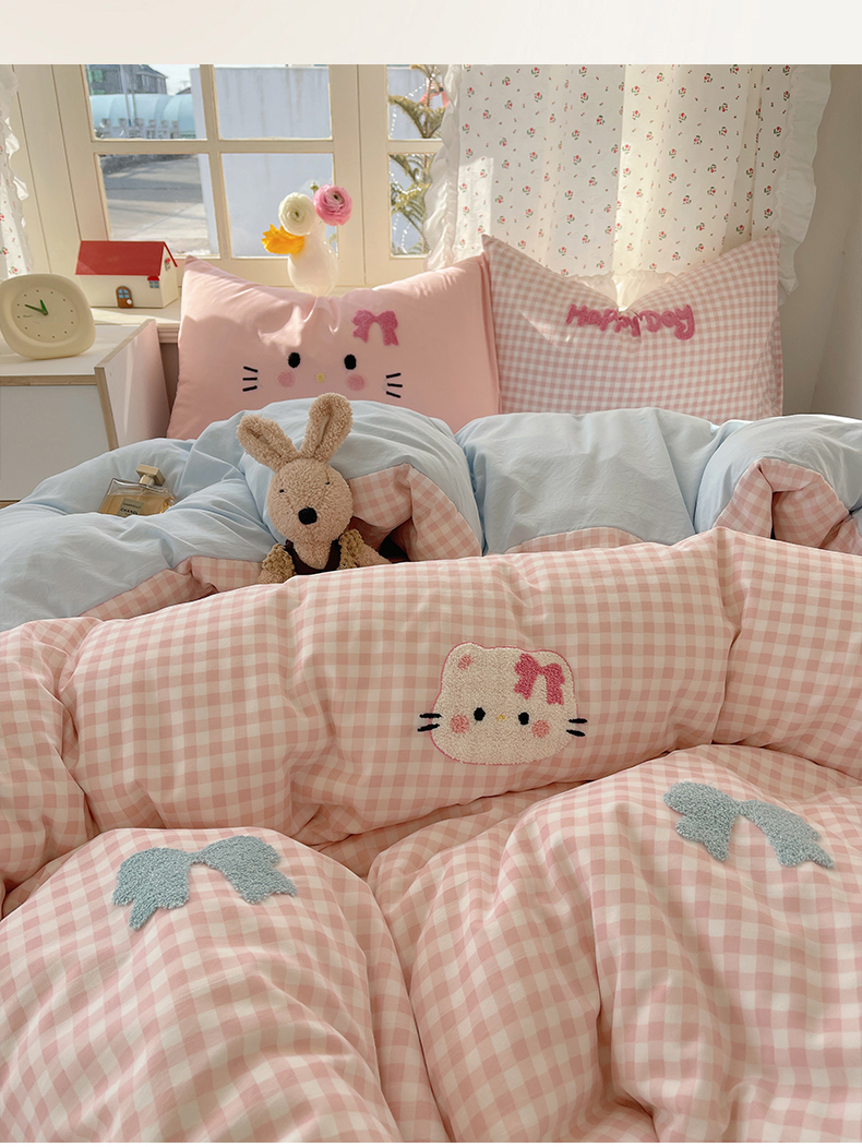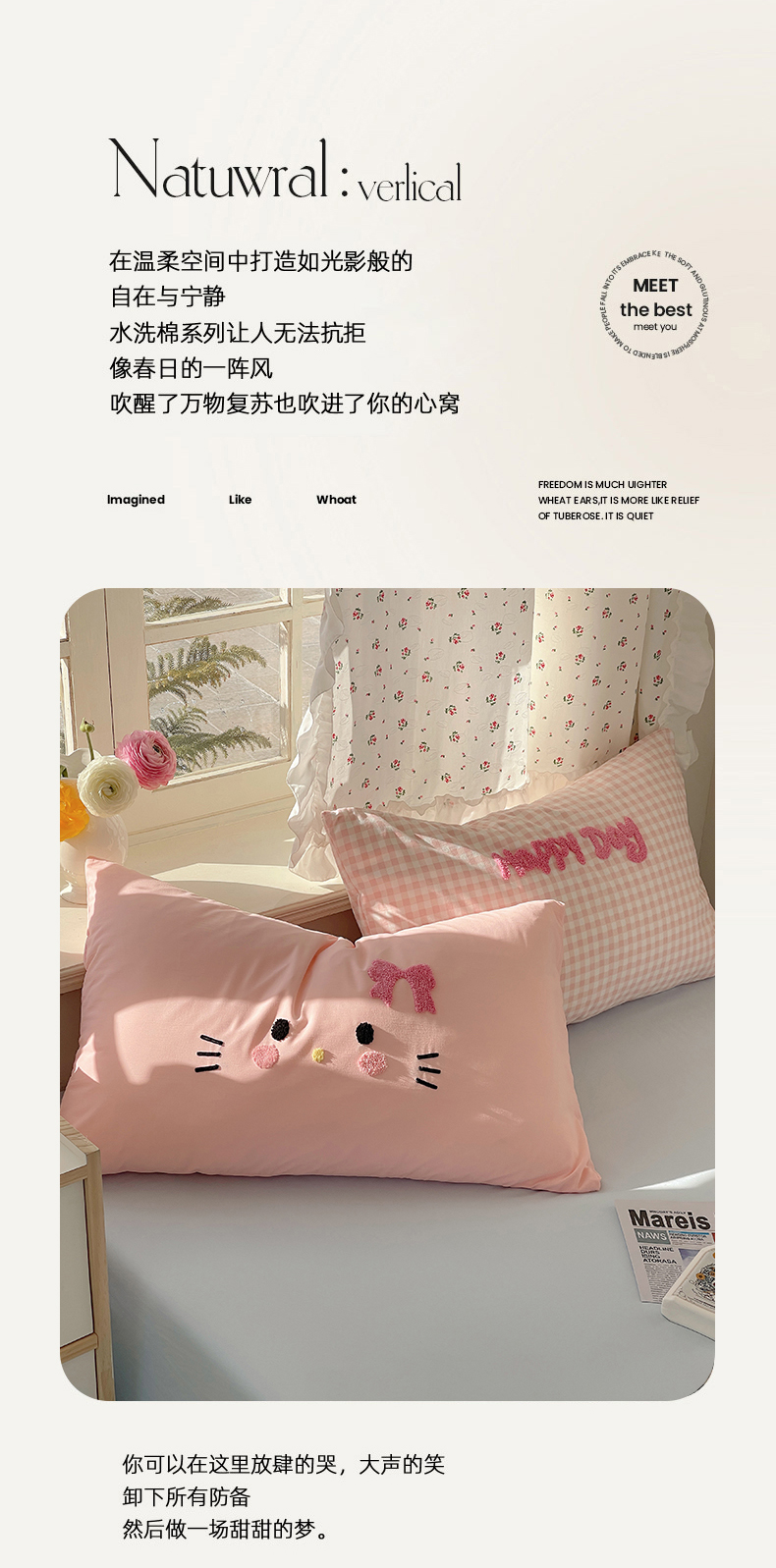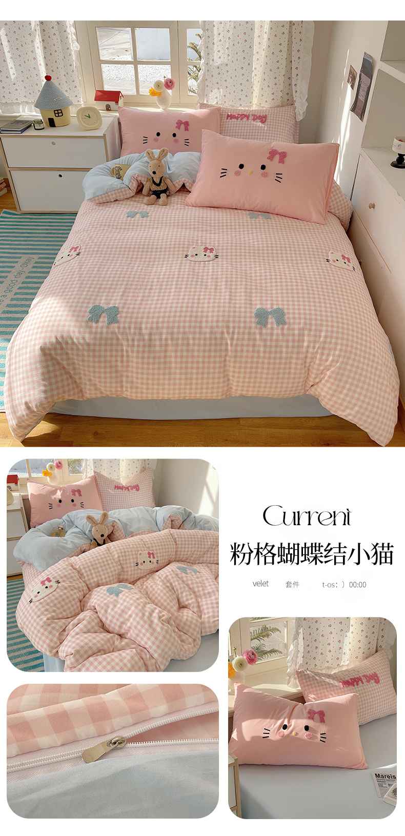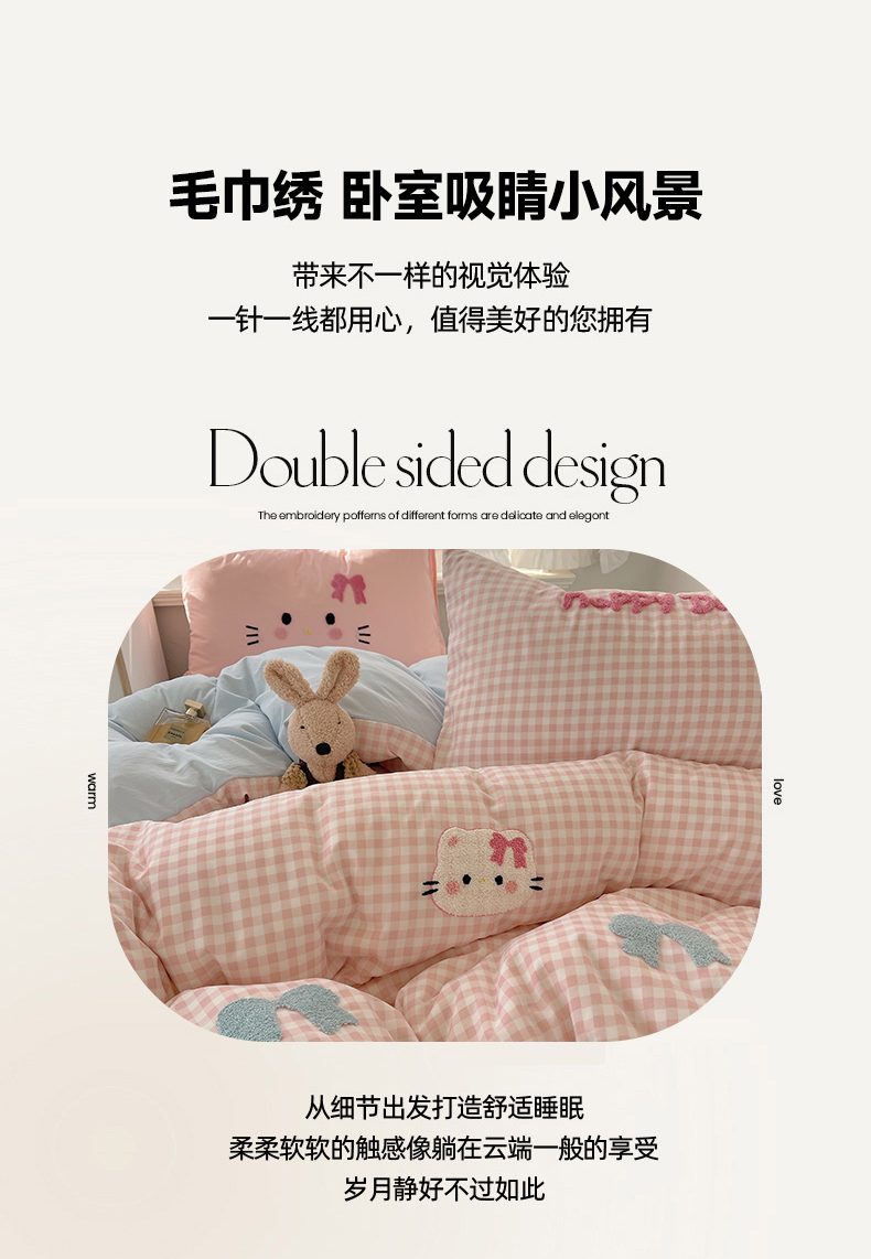 当前位置: 91家纺网 > 商品网购 > 床品套件 > 四件套 > 毛巾绣四件套 > 红嘴企鹅 2025新款水洗棉毛巾绣四件套 粉格蝴蝶结小猫