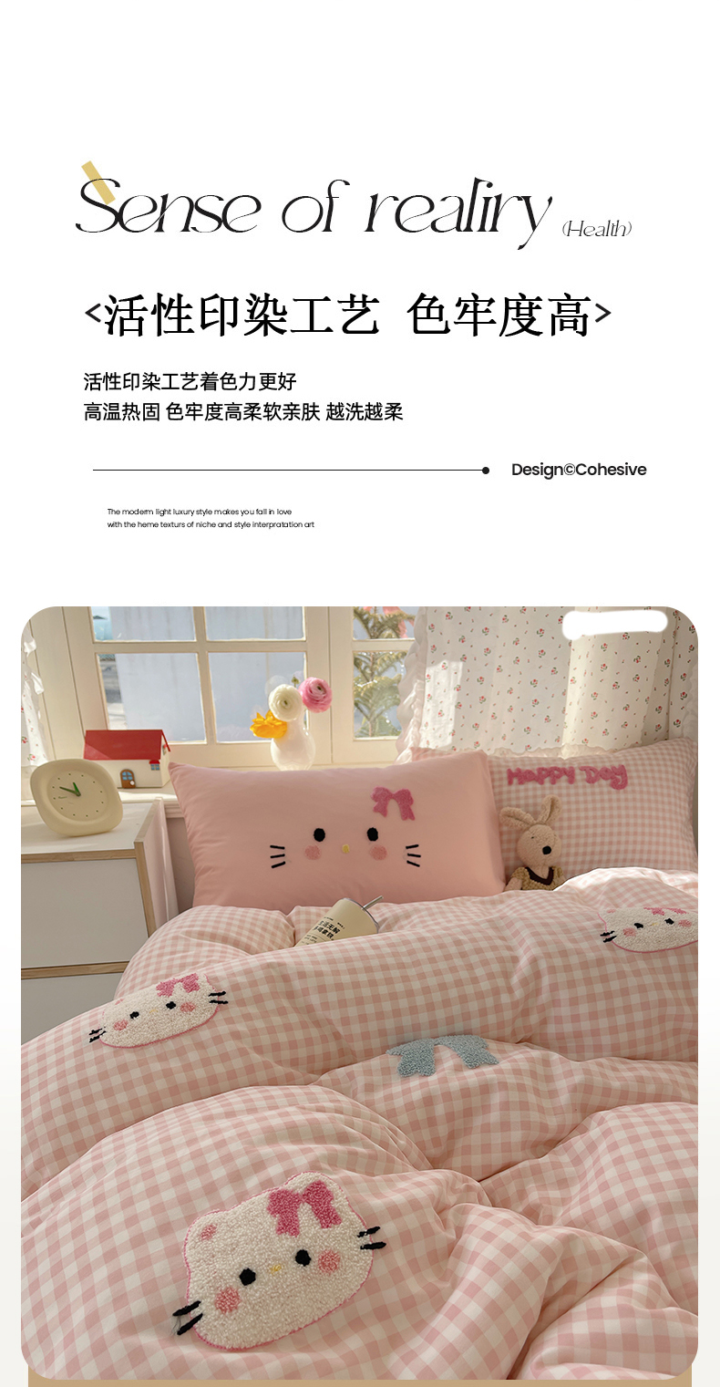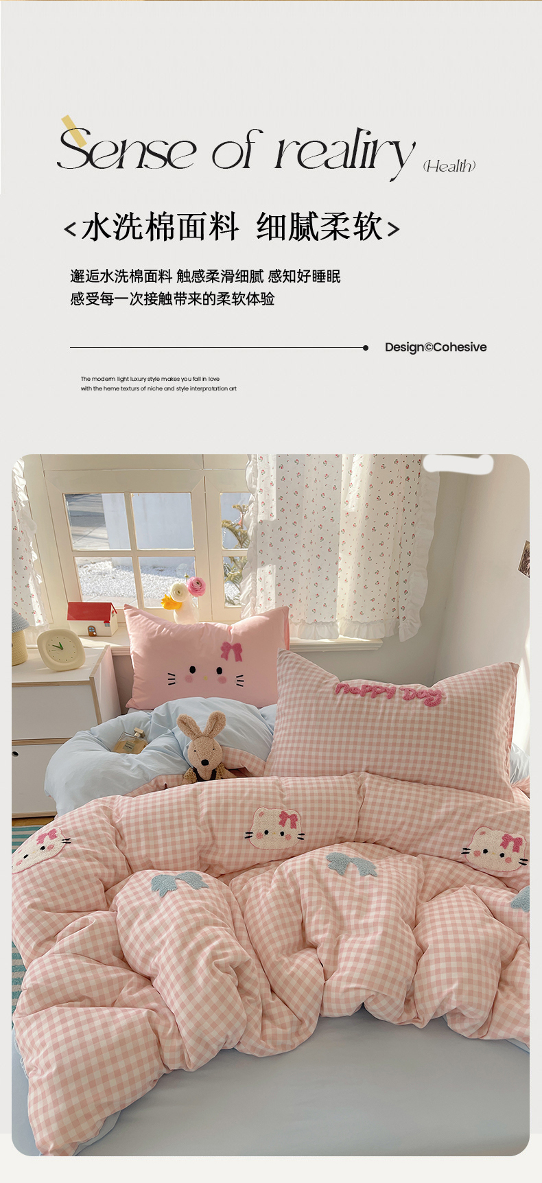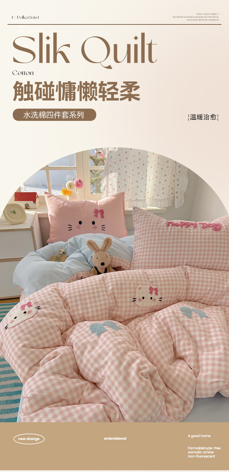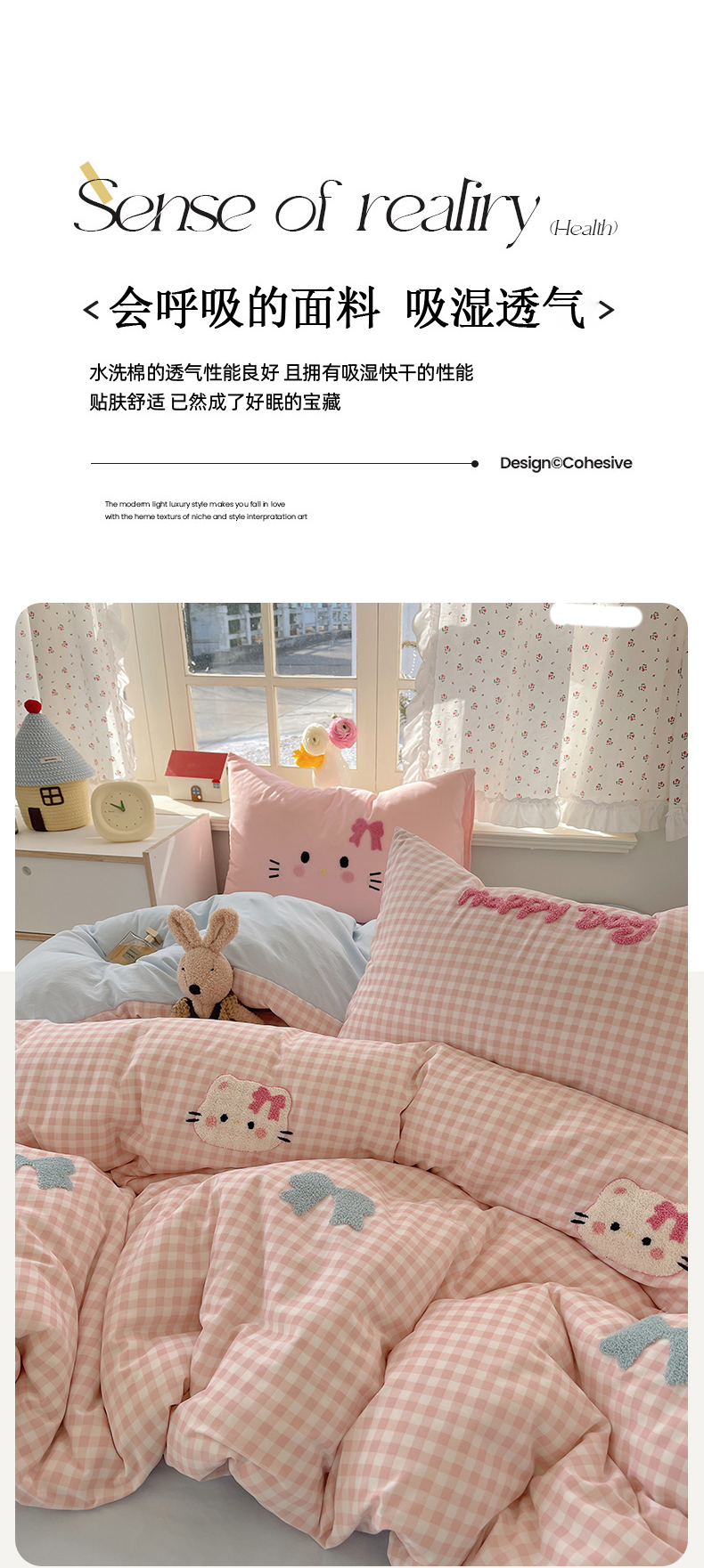 当前位置: 91家纺网 > 商品网购 > 床品套件 > 四件套 > 毛巾绣四件套 > 红嘴企鹅 2025新款水洗棉毛巾绣四件套 粉格蝴蝶结小猫