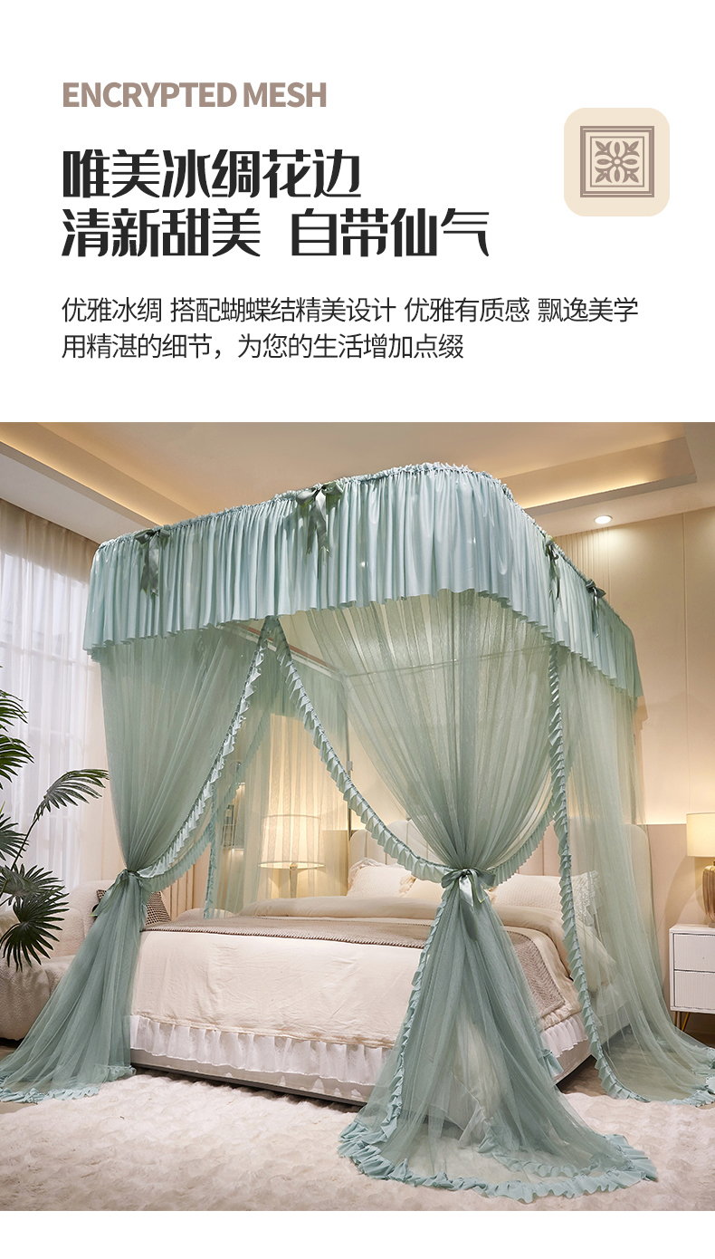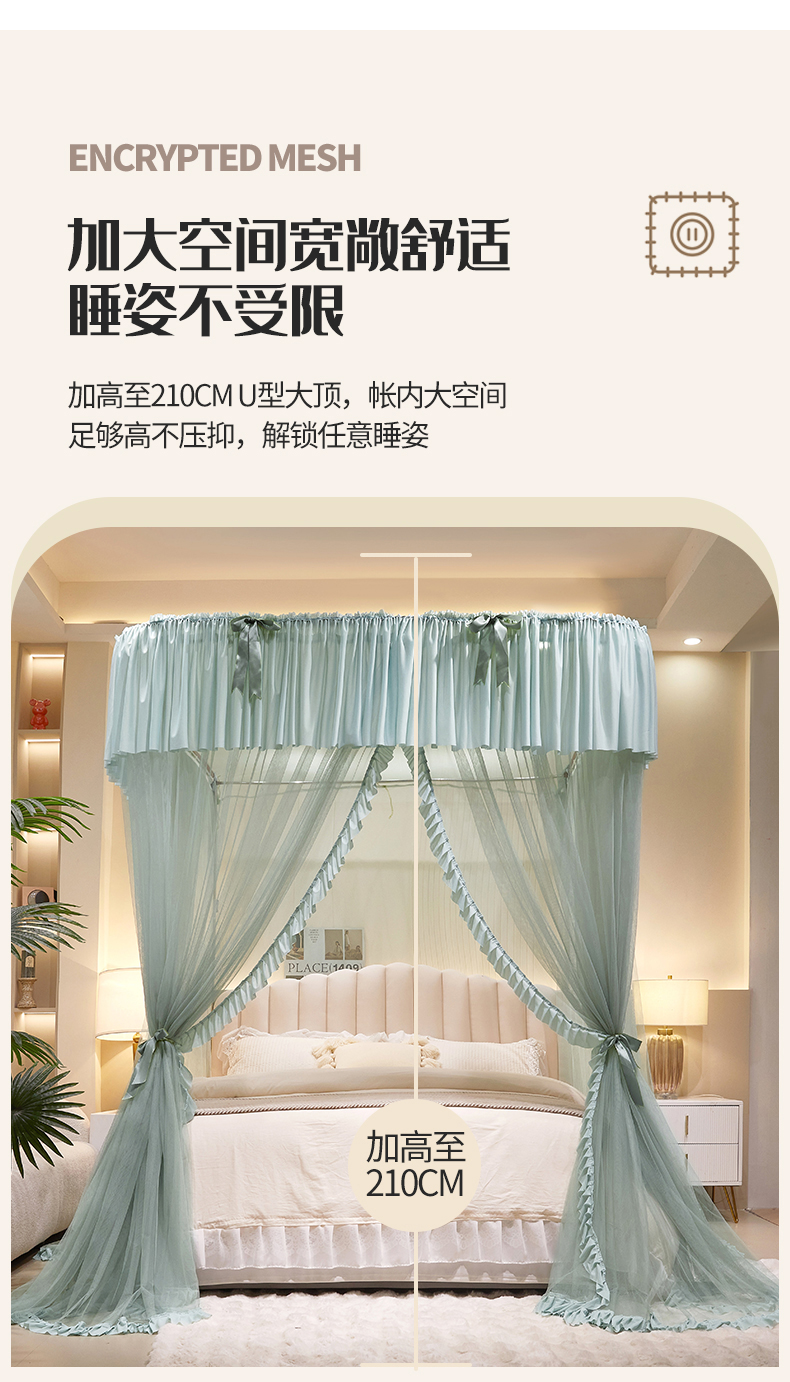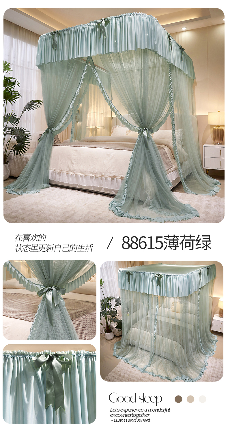(总)夏彩 2025新款蕾丝U型防摔坐床蚊帐-88630,绿雅灰,藕玉色,香槟色
