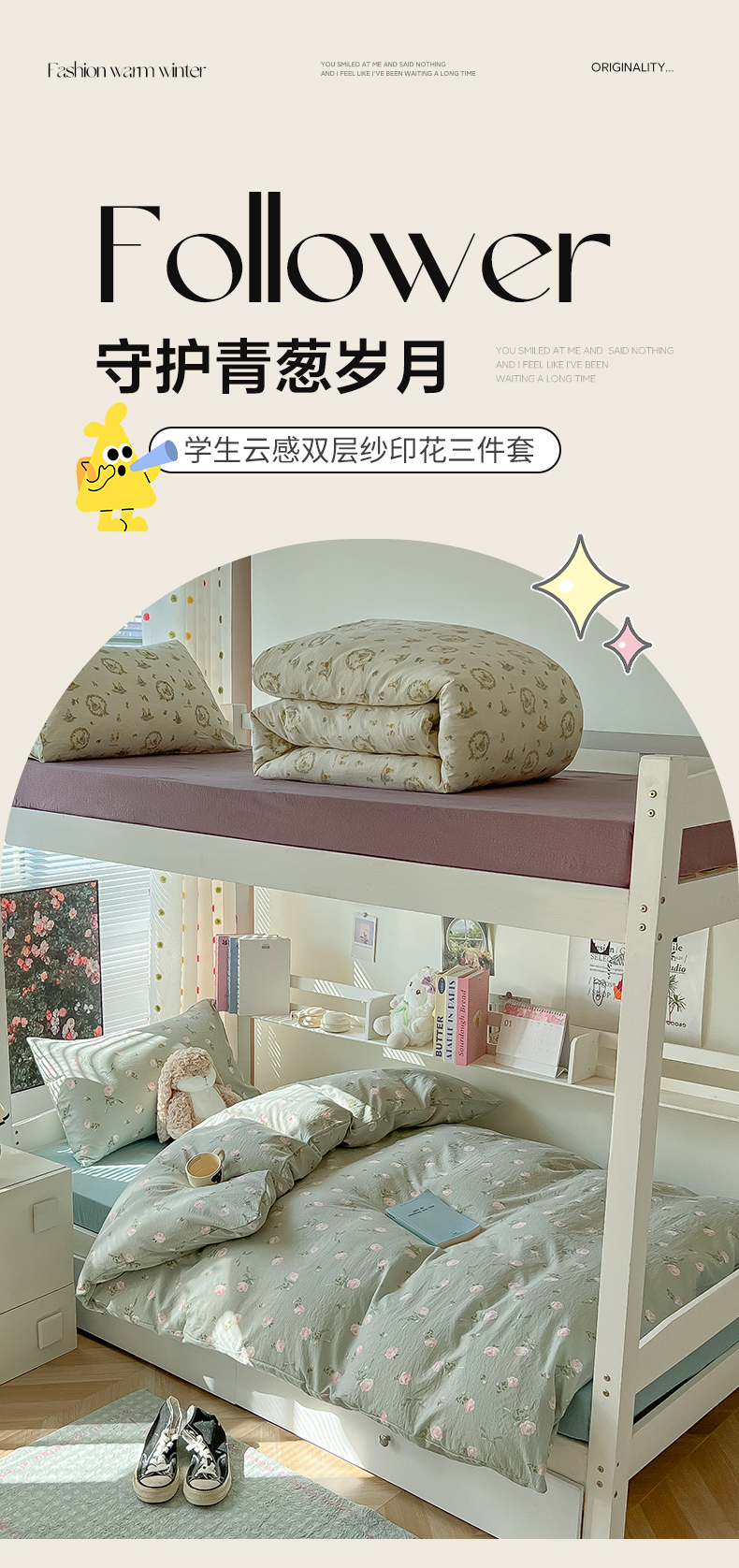 当前位置: 91家纺网 > 商品网购 > 床品套件 > 三件套 > 韩巢家纺 2025新款云感双层纱超柔裸睡级学生宿舍上下铺床单被套三件套-(提供卖家秀) 半生倾慕