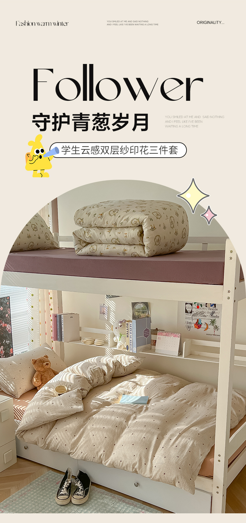 当前位置: 91家纺网 > 商品网购 > 床品套件 > 三件套 > 韩巢家纺 2025新款云感双层纱超柔裸睡级学生宿舍上下铺床单被套三件套-(提供卖家秀) 米倾心