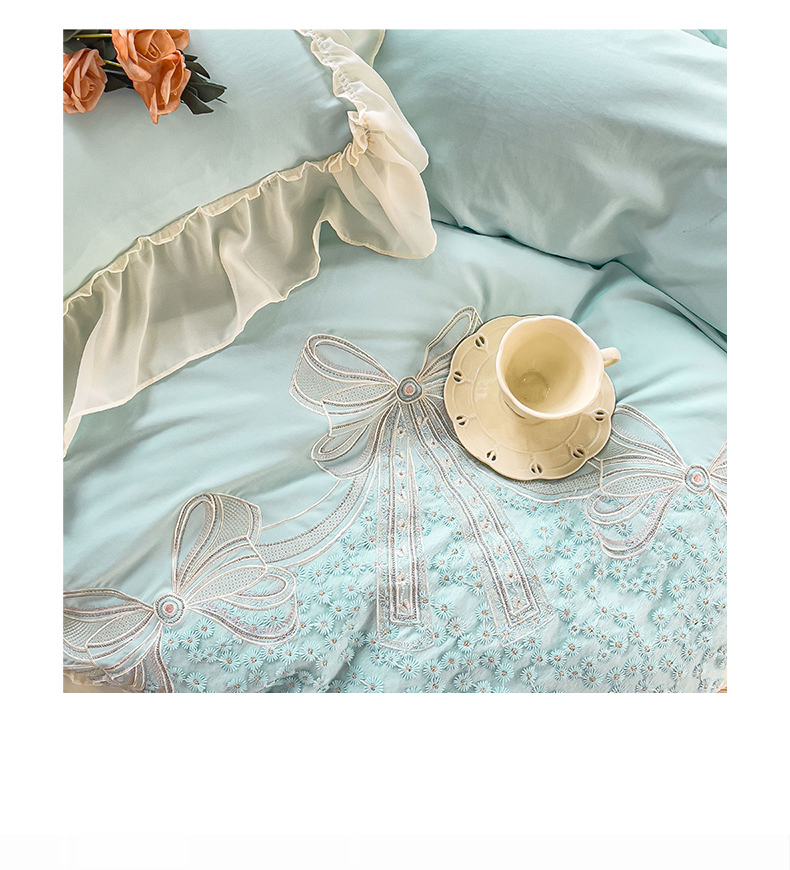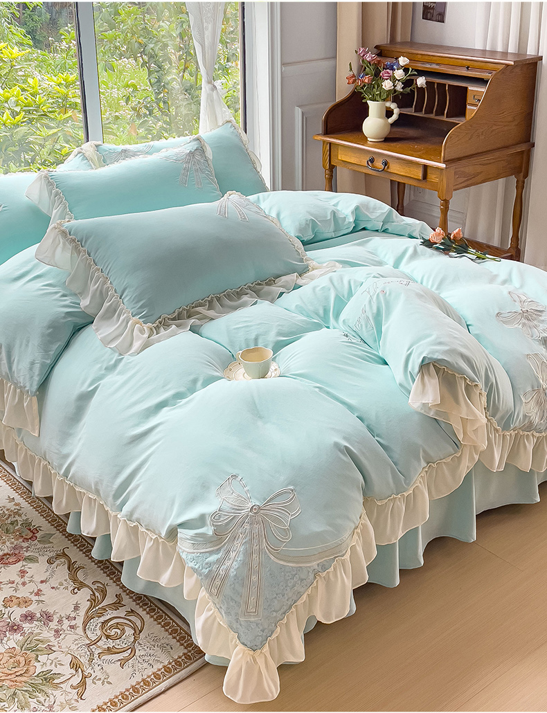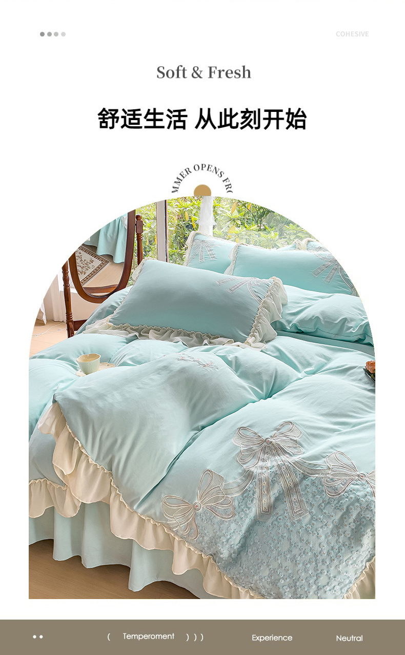 睡美人 2025韩版全锦棉刺绣公主风蕾丝床裙款四件套-蝶恋花 蝶恋花-嫩芽绿