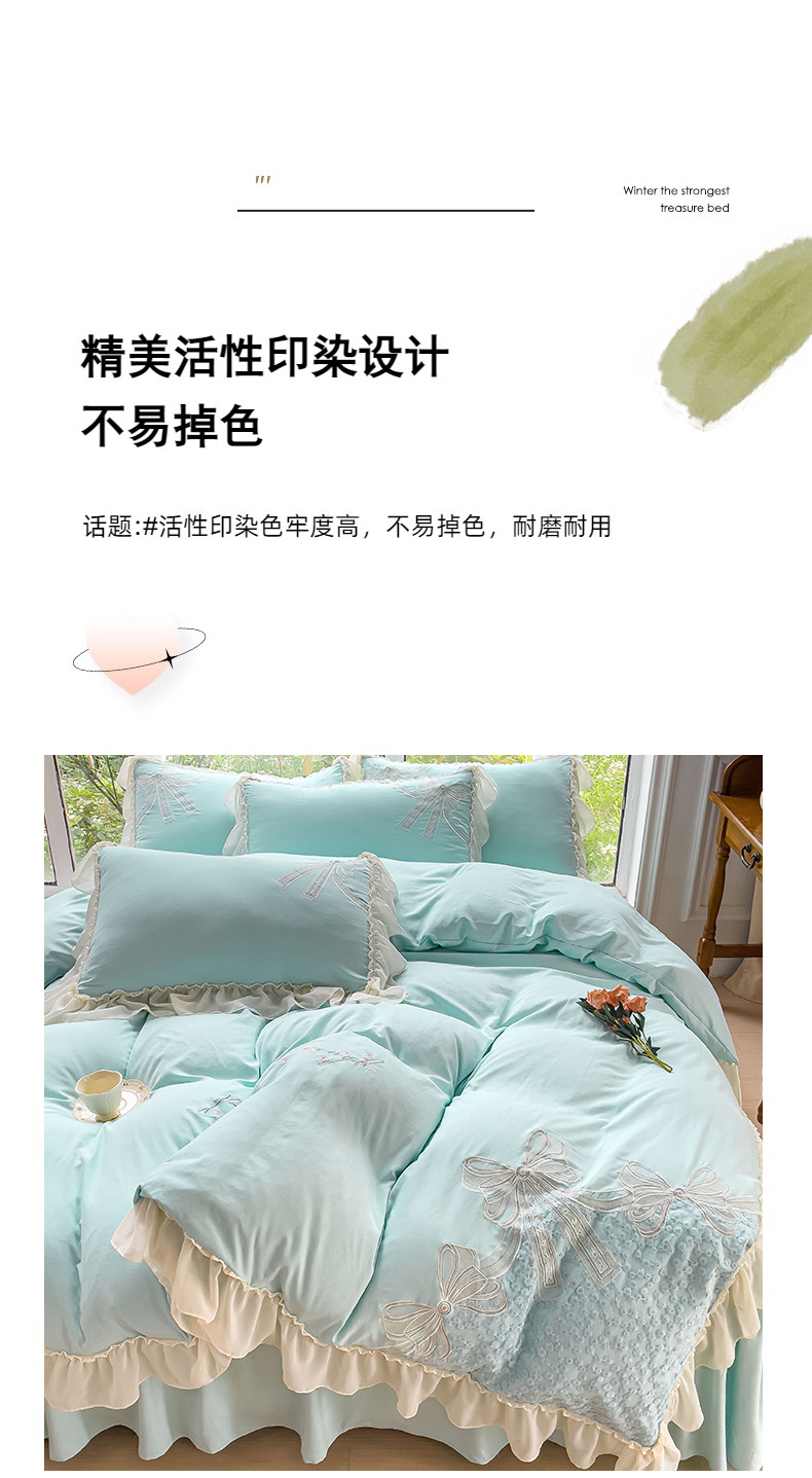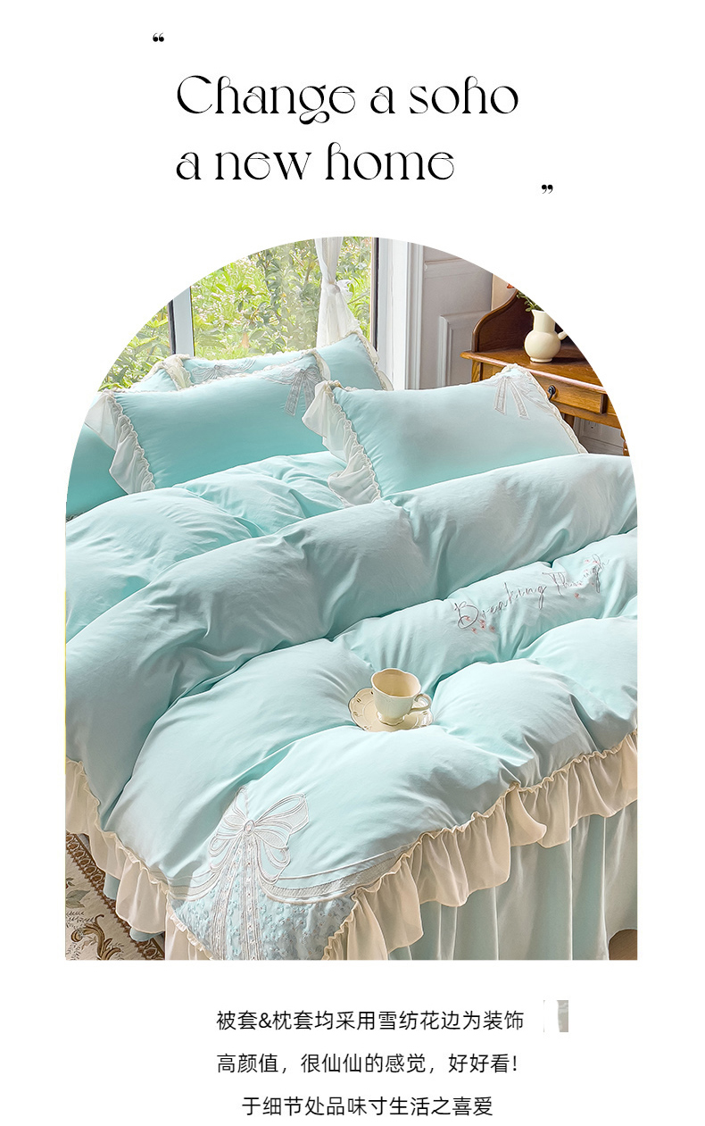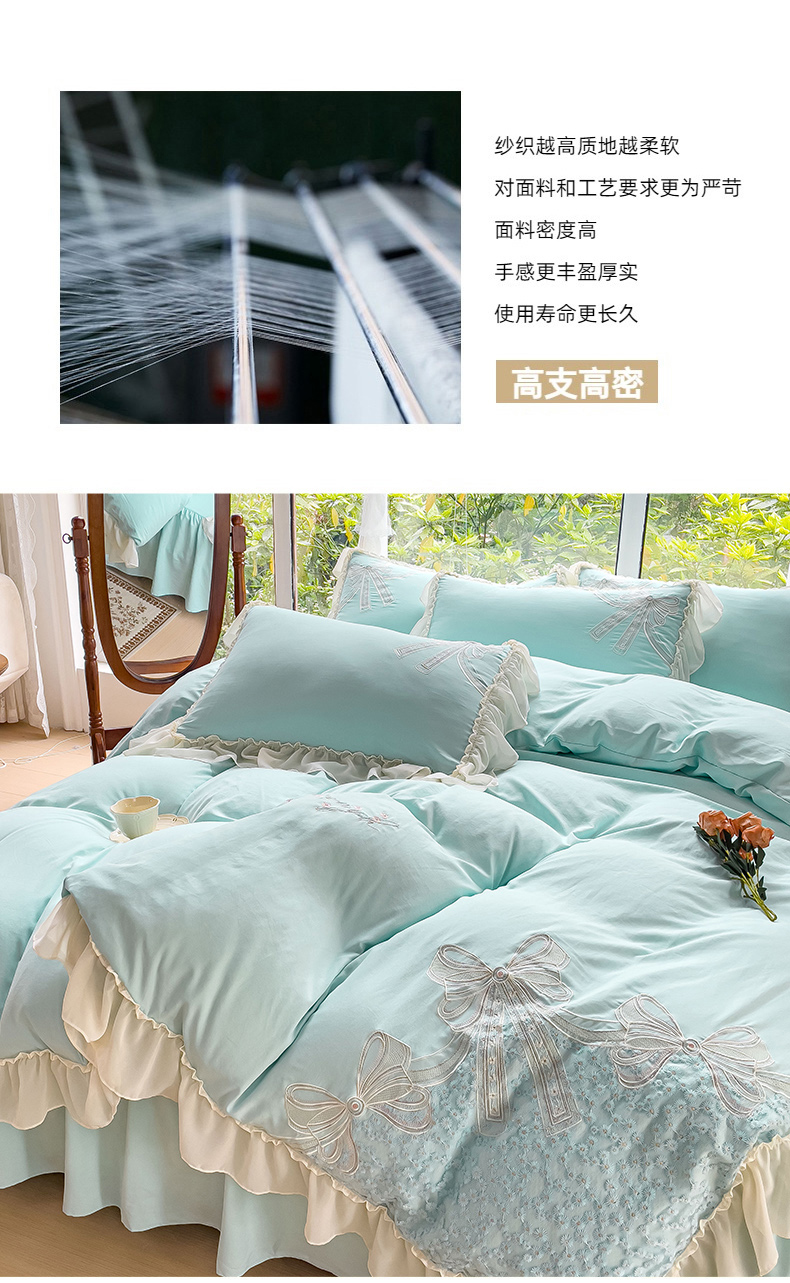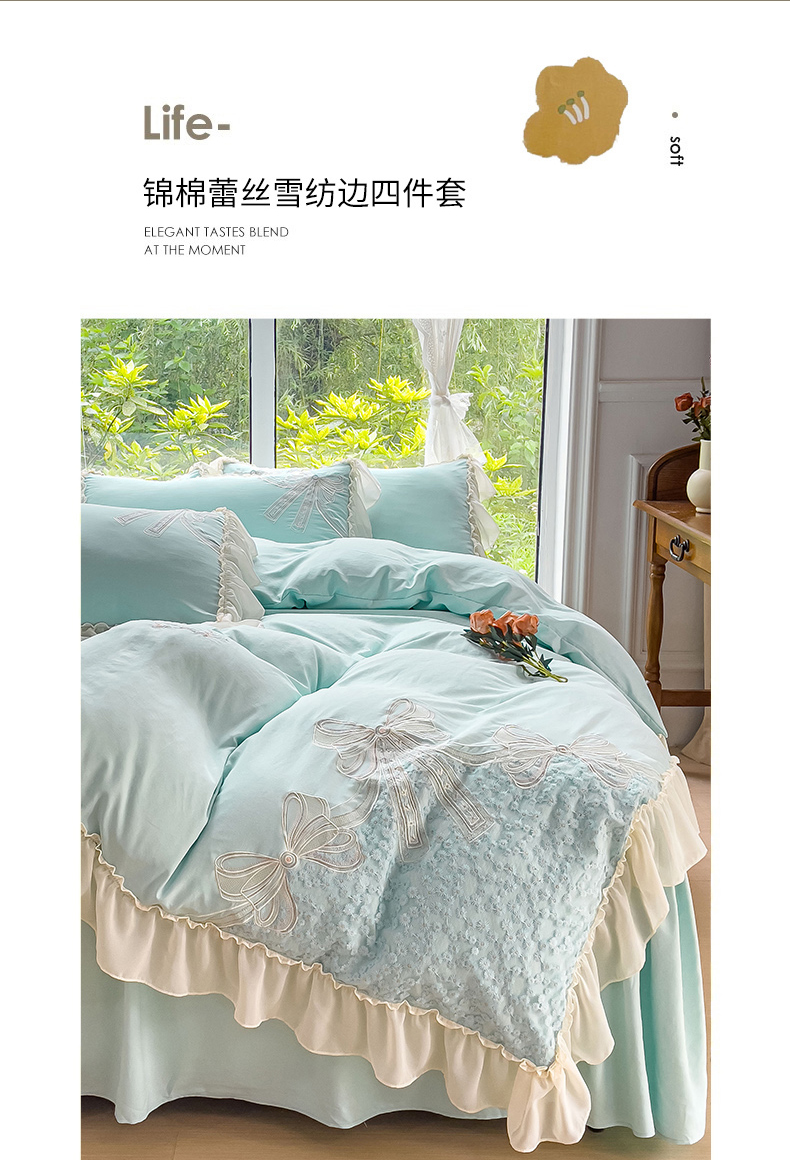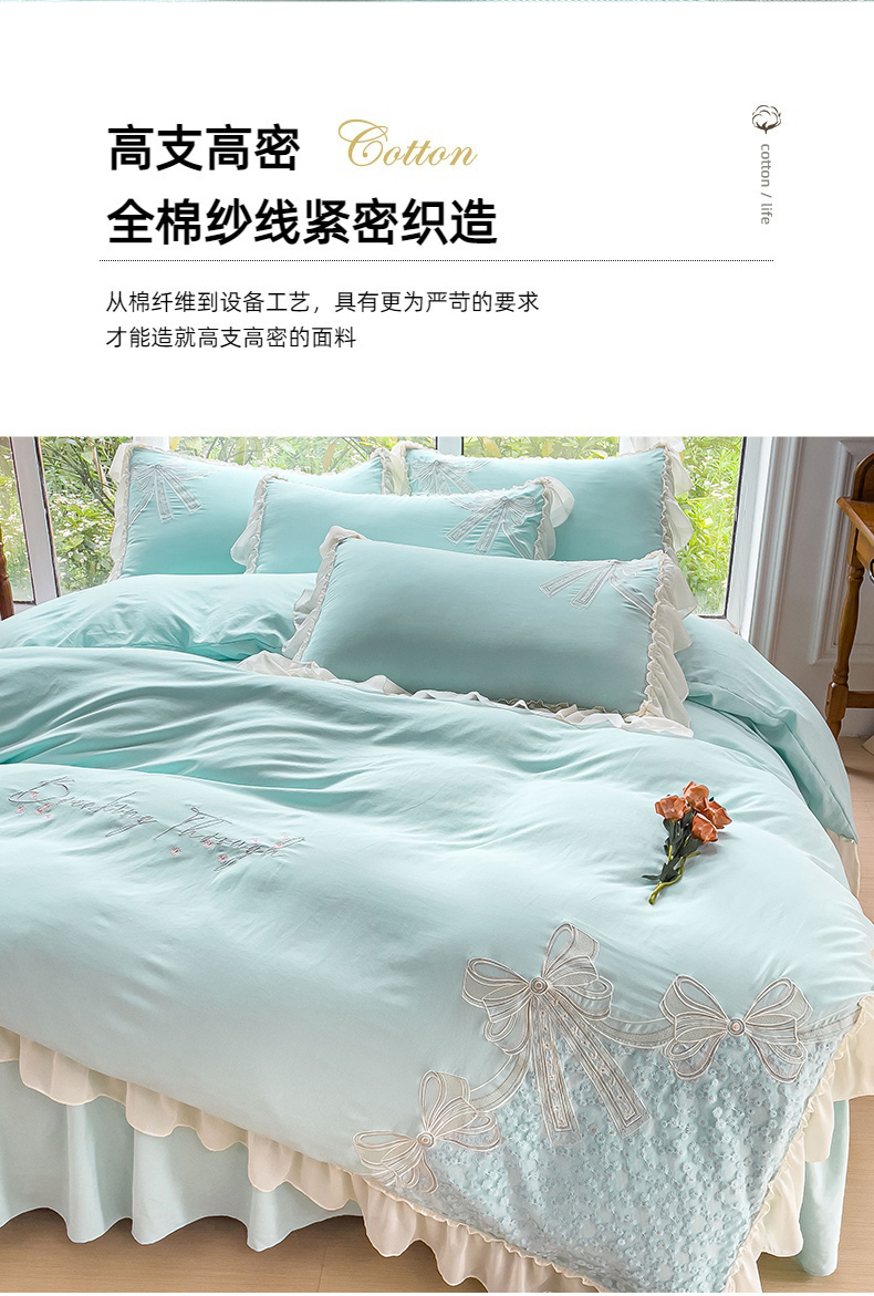 商品名称:睡美人 2025韩版全锦棉刺绣公主风蕾丝床裙款四件套-蝶恋花 蝶恋花-嫩芽绿