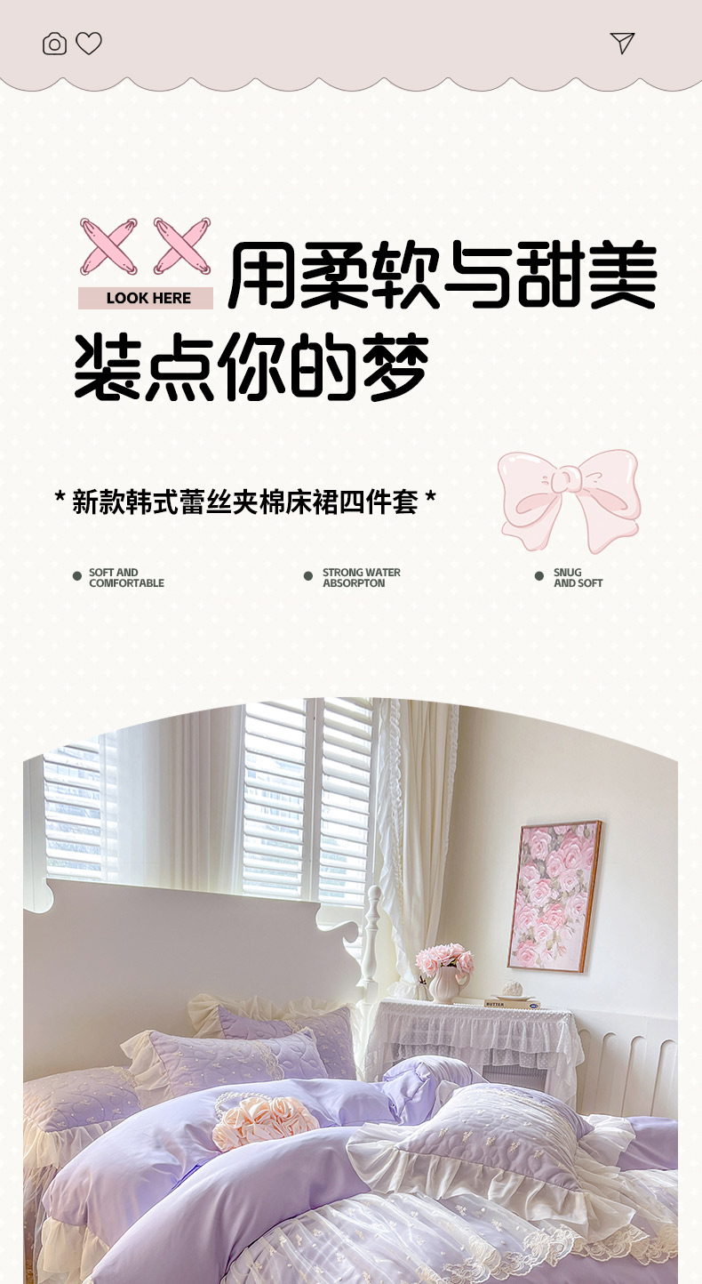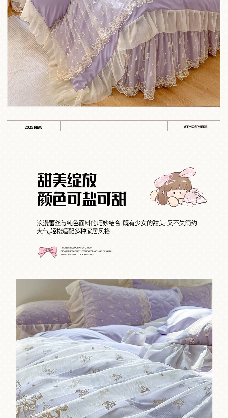 恋尚 2025新款韩式蕾丝丝光棉夹棉床裙四件套 蜜芙-香芋紫