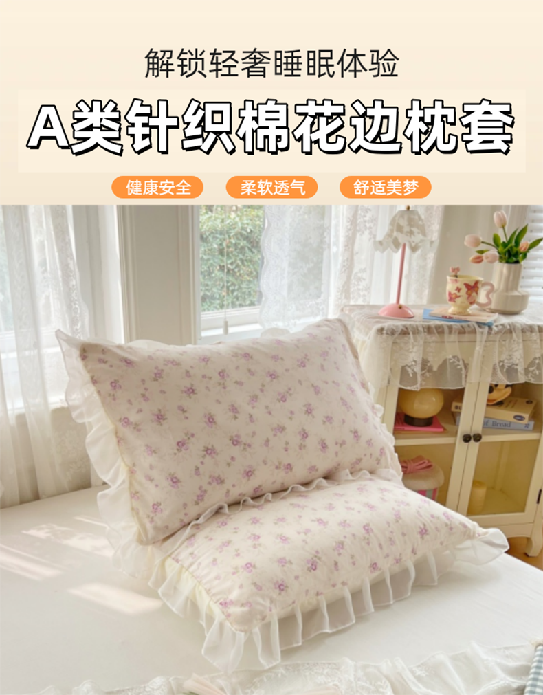 商品名称:梦舒羽 2025新款针织棉双层纱花边枕头套双人枕套枕芯套宿舍单人枕头内胆套 花边款-花朝如约