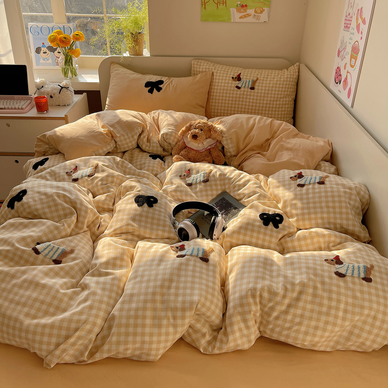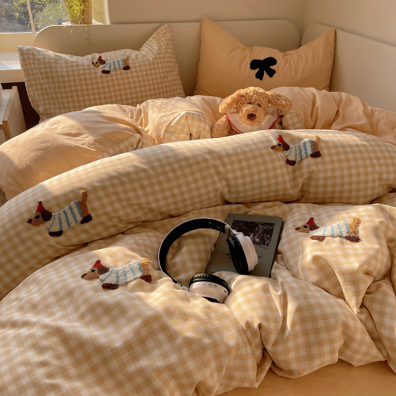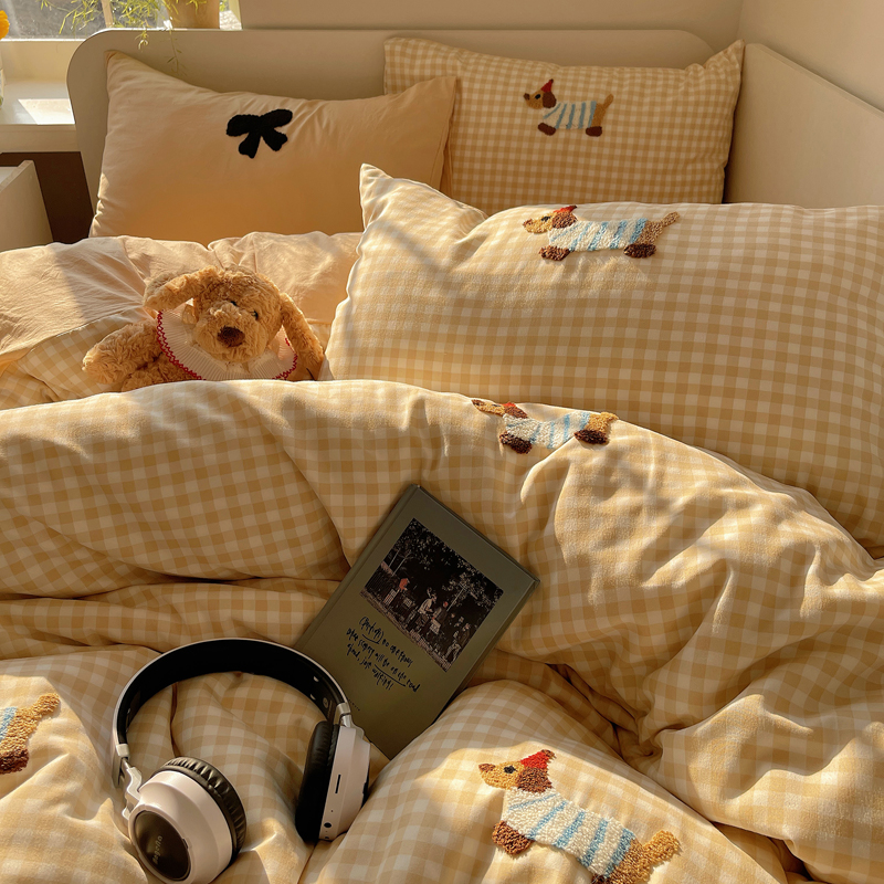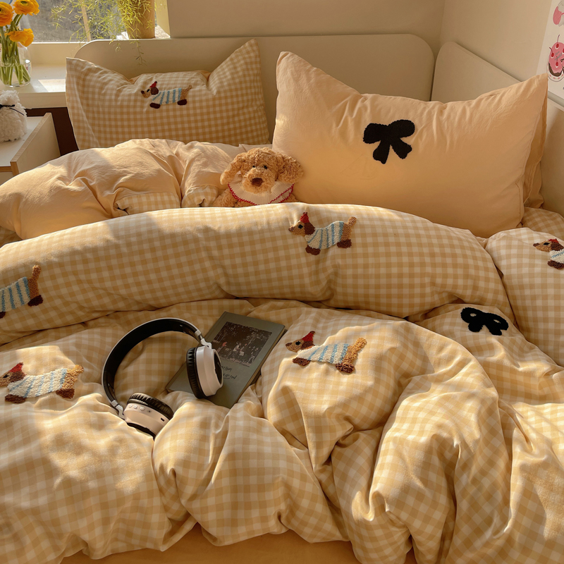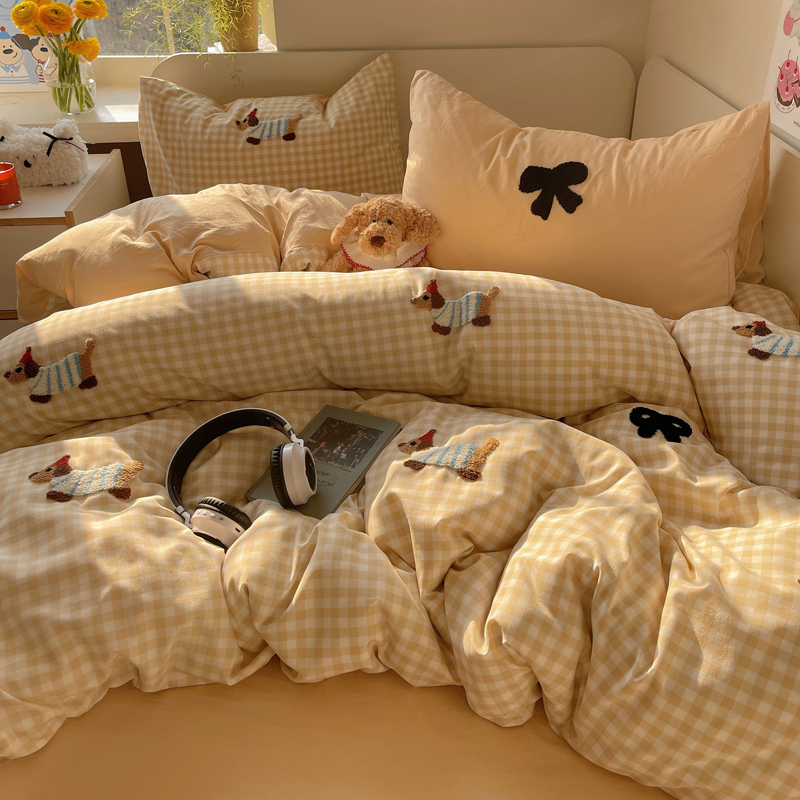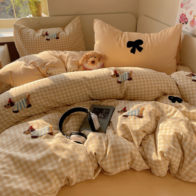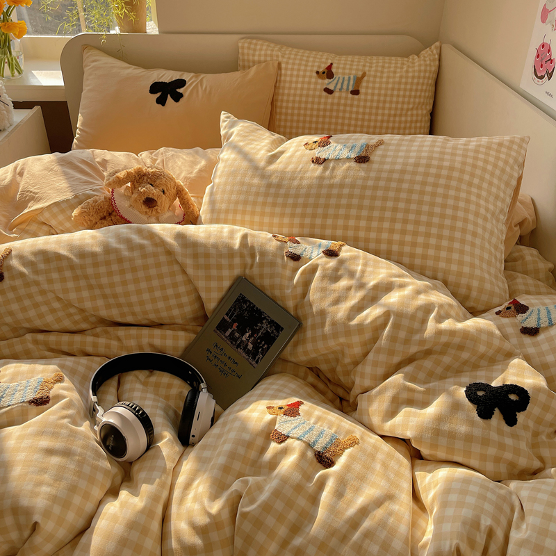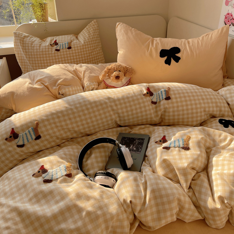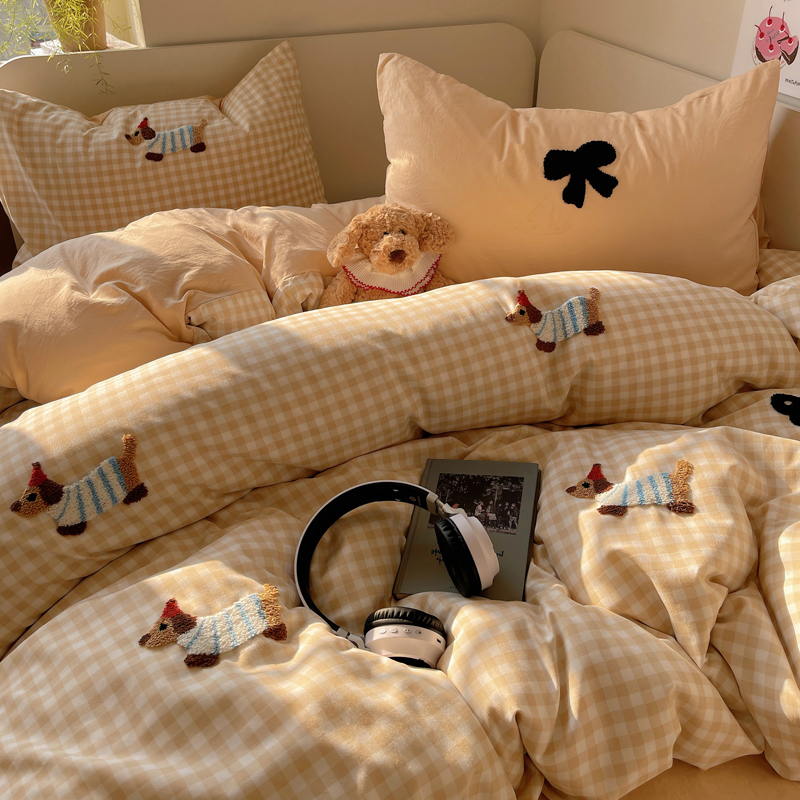 (总)顾里家纺 2024新款韩系腊肠狗毛巾绣牛奶绒四件套,粉格腊肠狗,黄格腊肠狗,咖格腊肠狗,蓝格腊肠狗,绿格腊肠狗