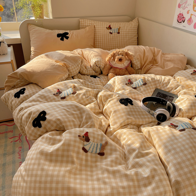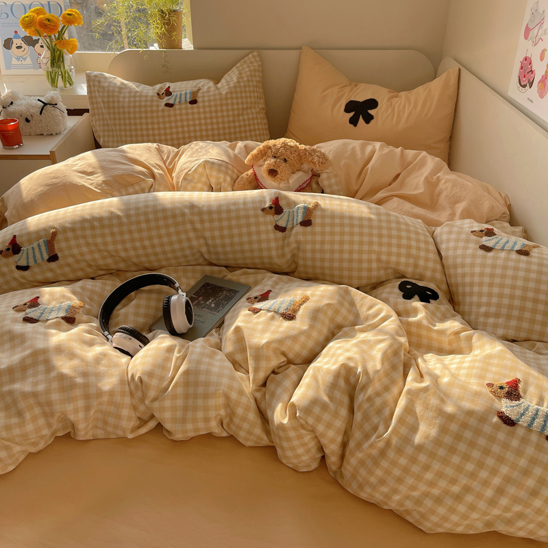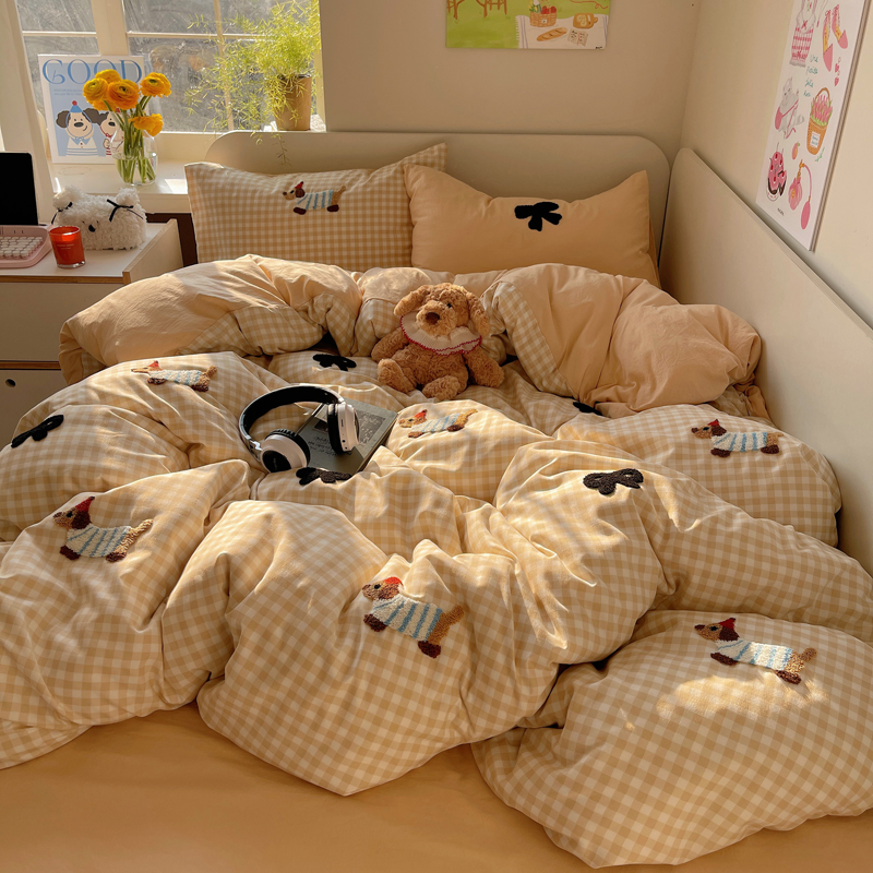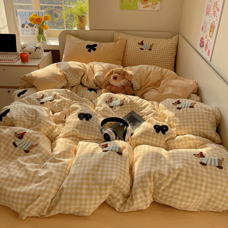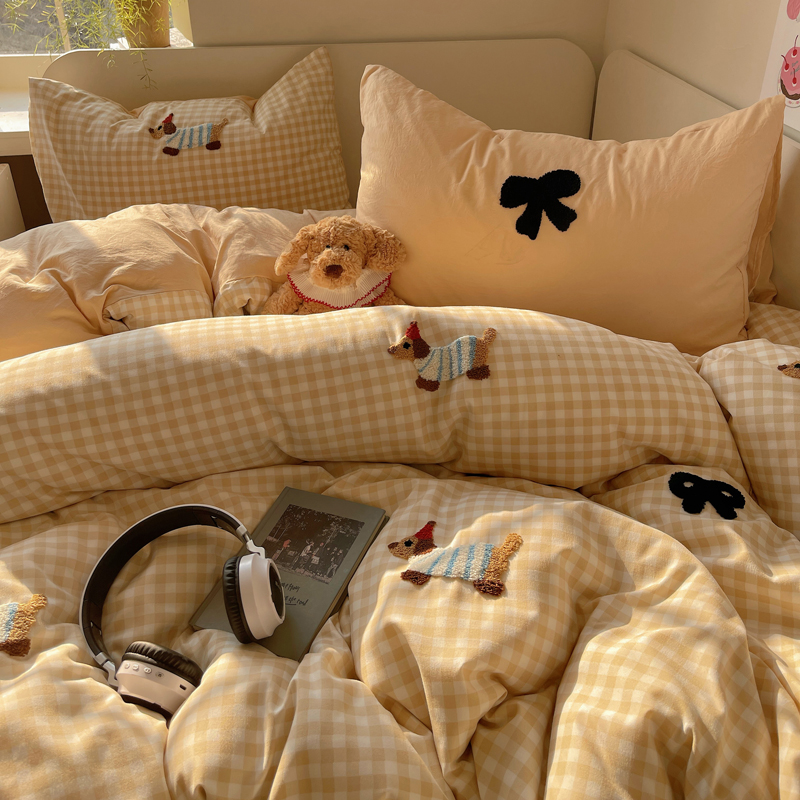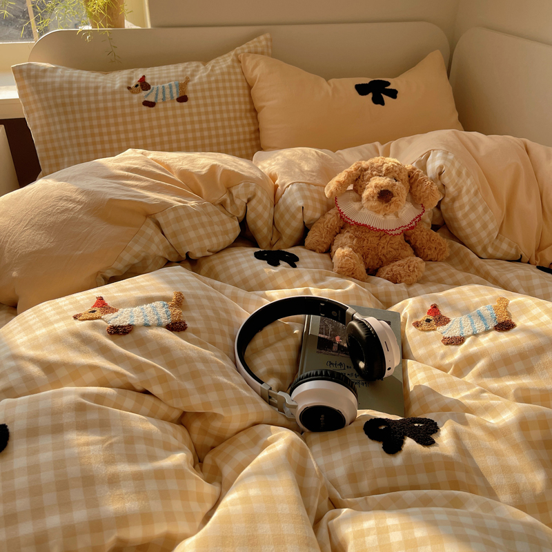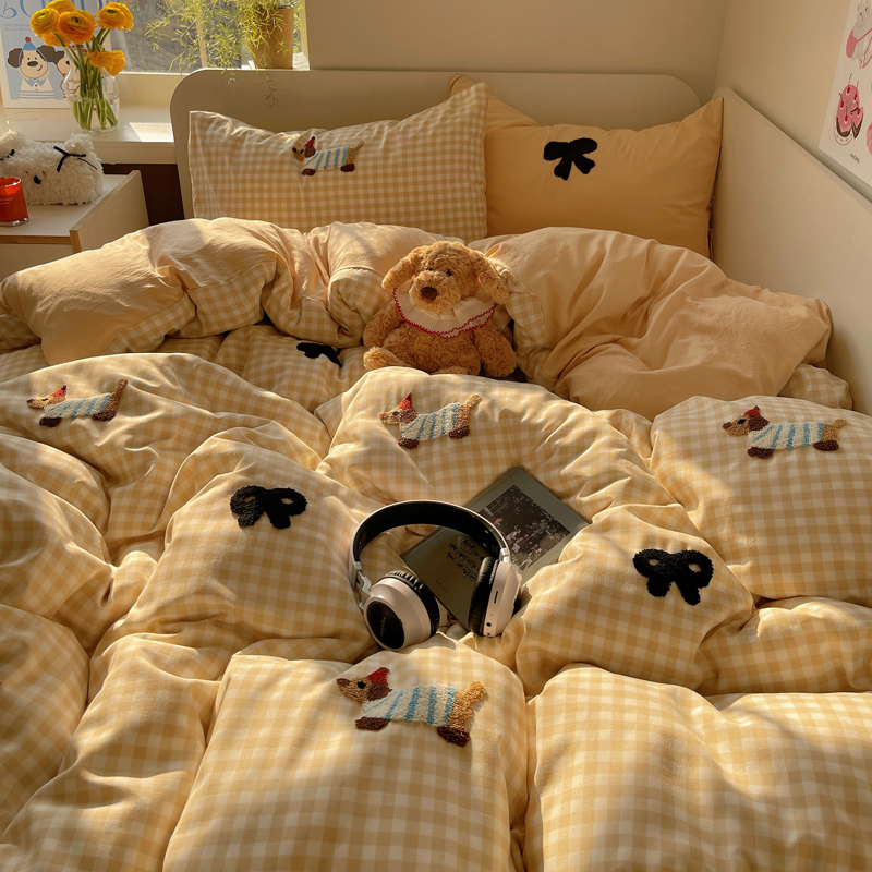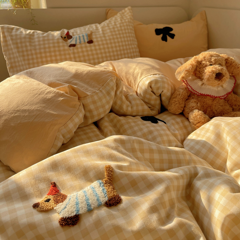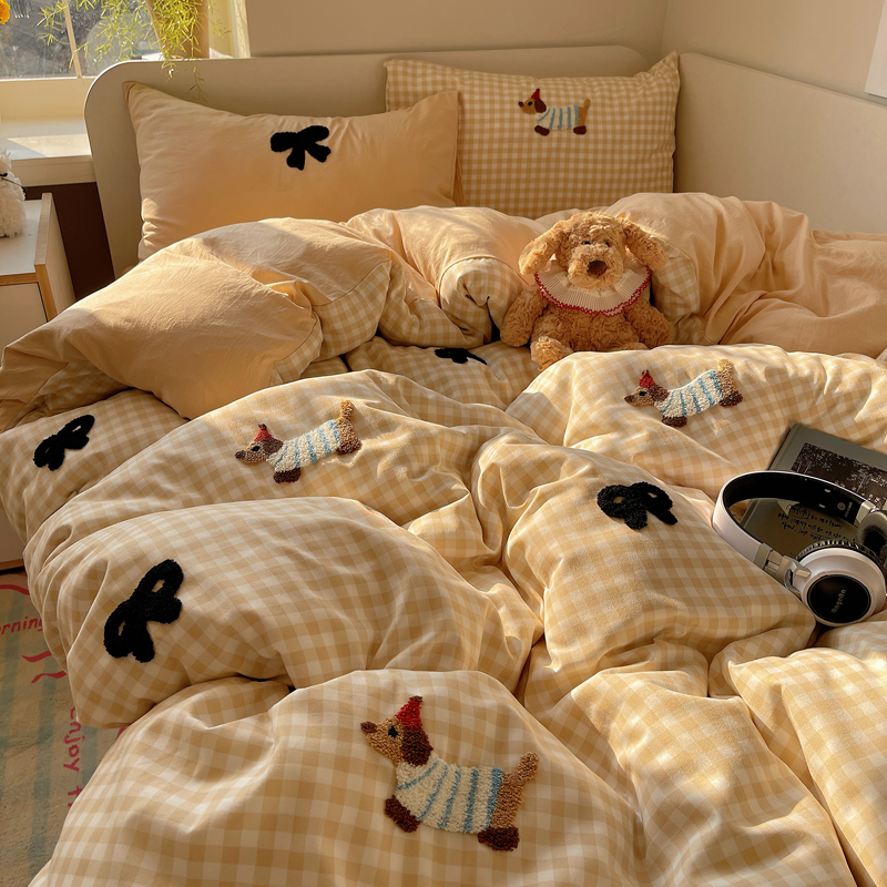 (总)顾里家纺 2024新款韩系腊肠狗毛巾绣牛奶绒四件套,粉格腊肠狗,黄格腊肠狗,咖格腊肠狗,蓝格腊肠狗,绿格腊肠狗