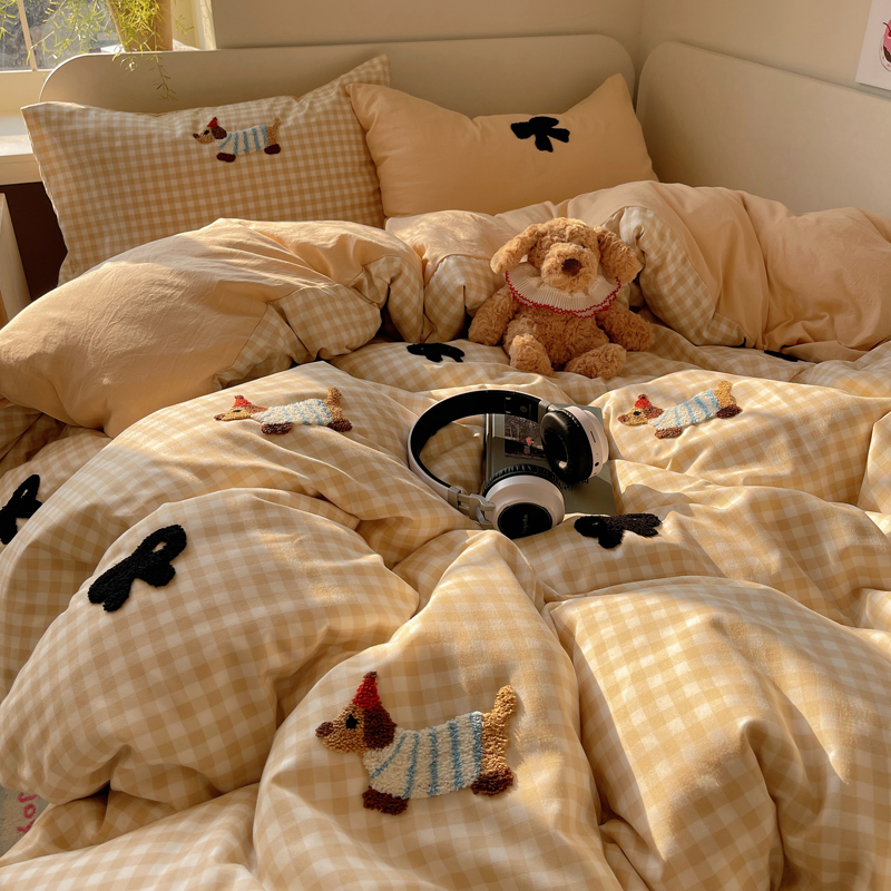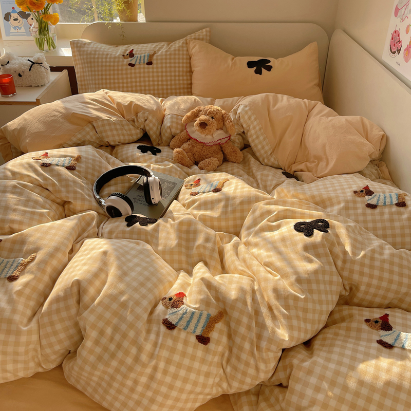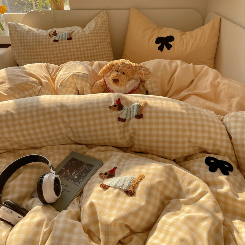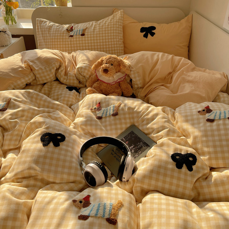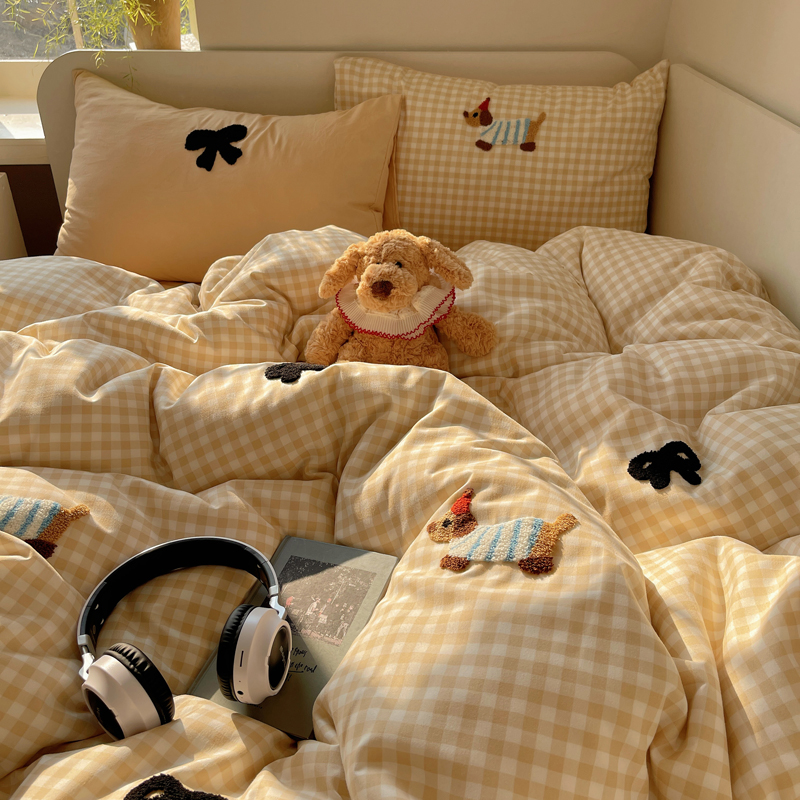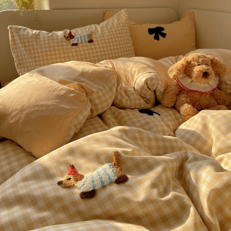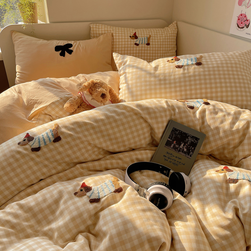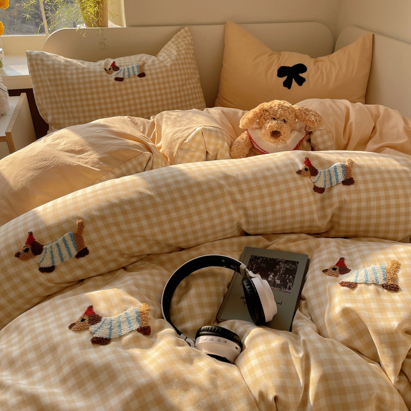 (总)顾里家纺 2024新款韩系腊肠狗毛巾绣牛奶绒四件套,粉格腊肠狗,黄格腊肠狗,咖格腊肠狗,蓝格腊肠狗,绿格腊肠狗