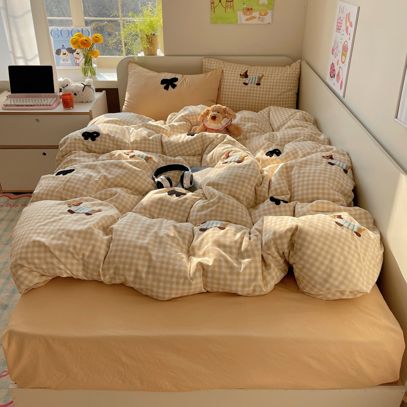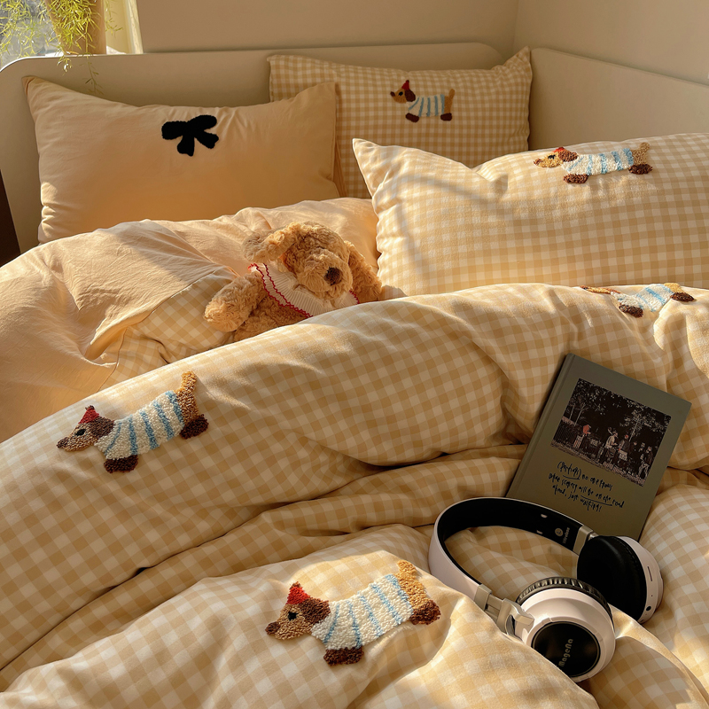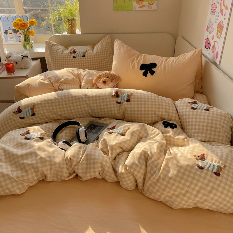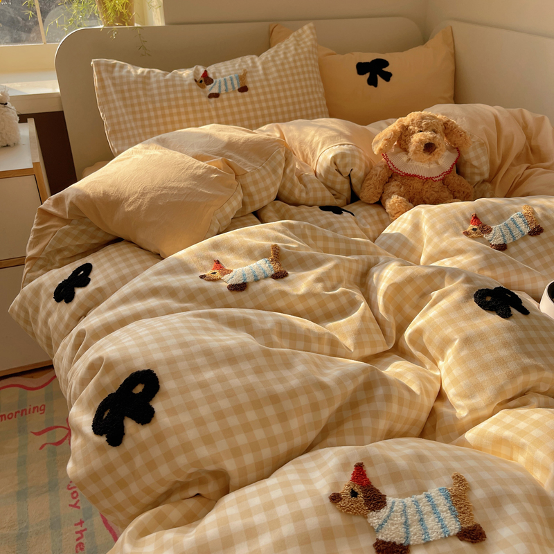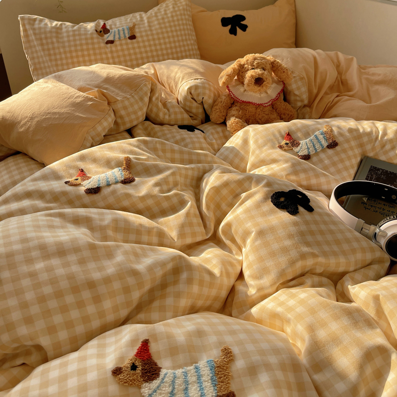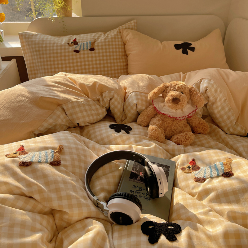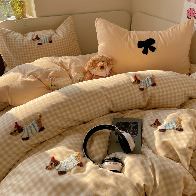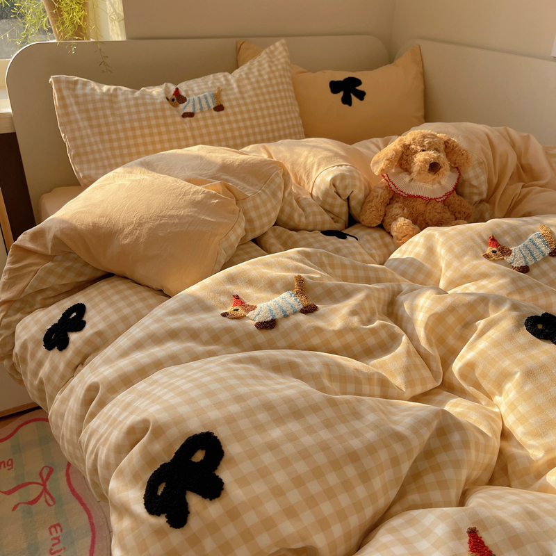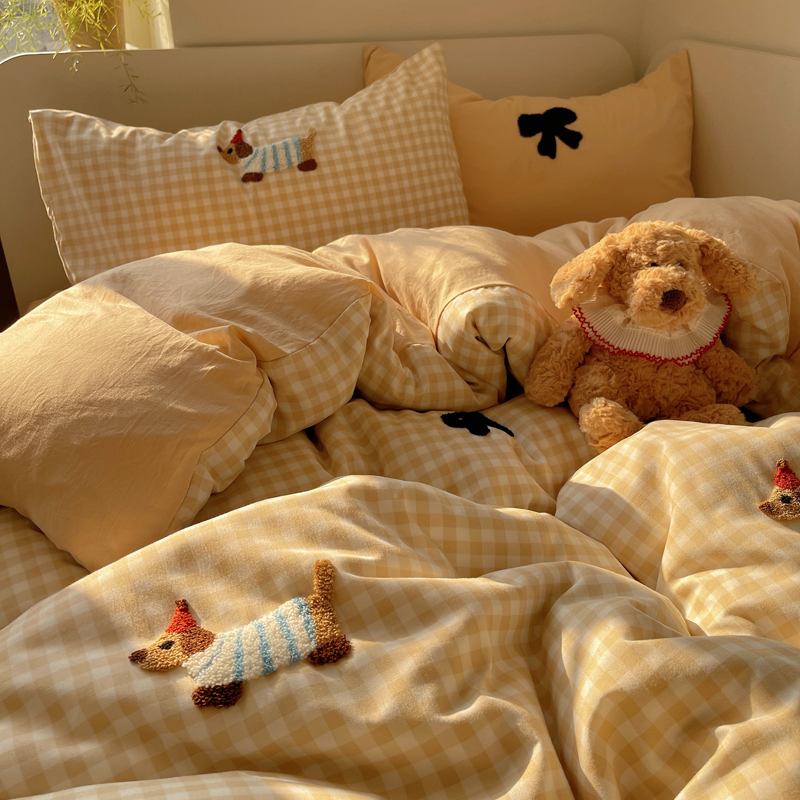 (总)顾里家纺 2024新款韩系腊肠狗毛巾绣牛奶绒四件套,粉格腊肠狗,黄格腊肠狗,咖格腊肠狗,蓝格腊肠狗,绿格腊肠狗