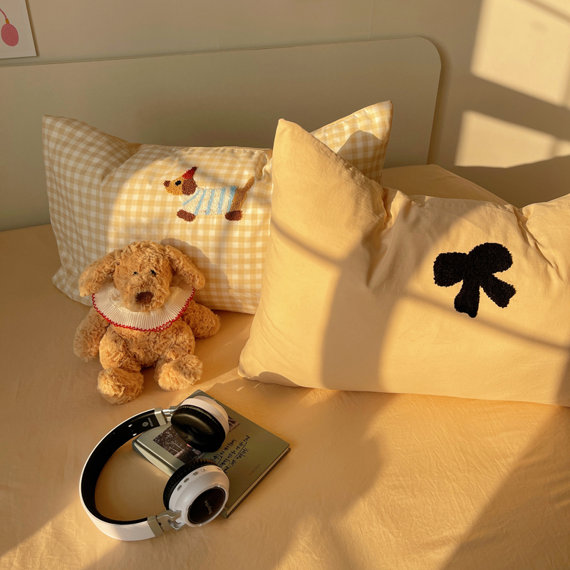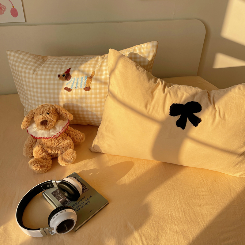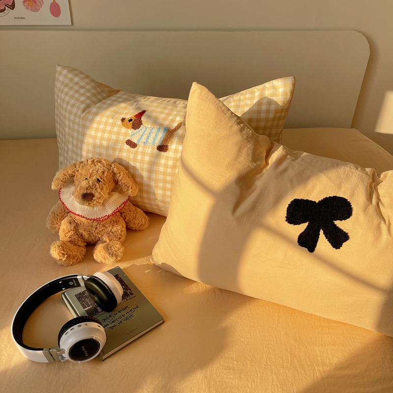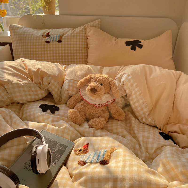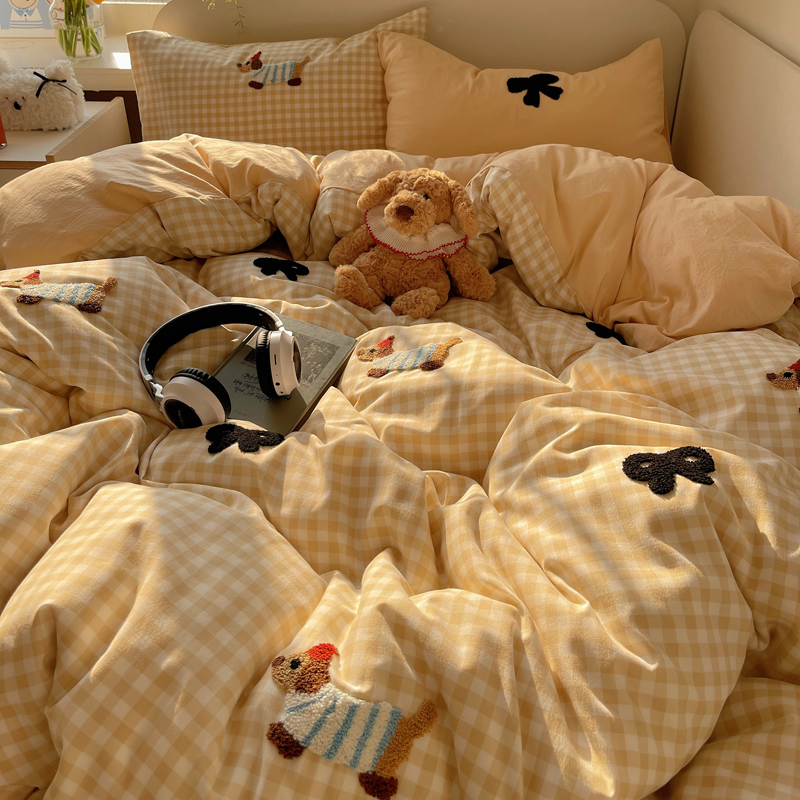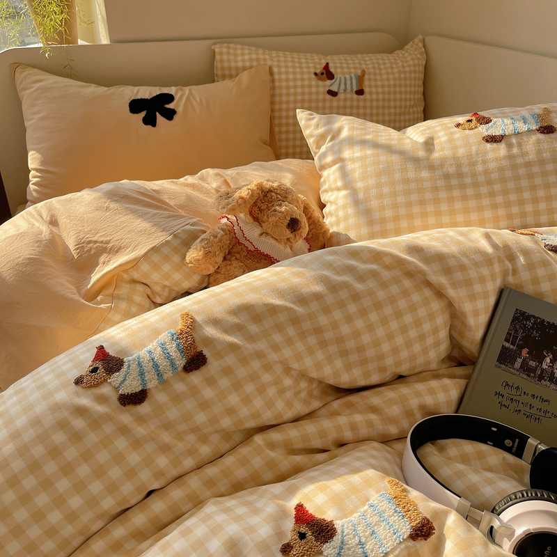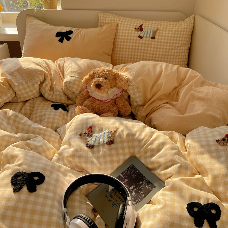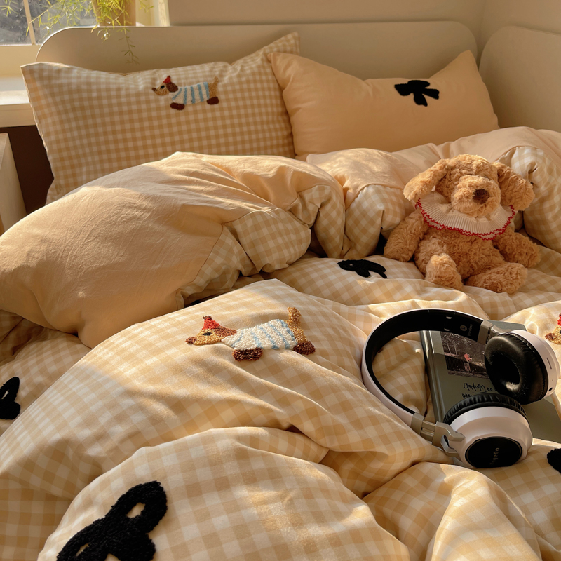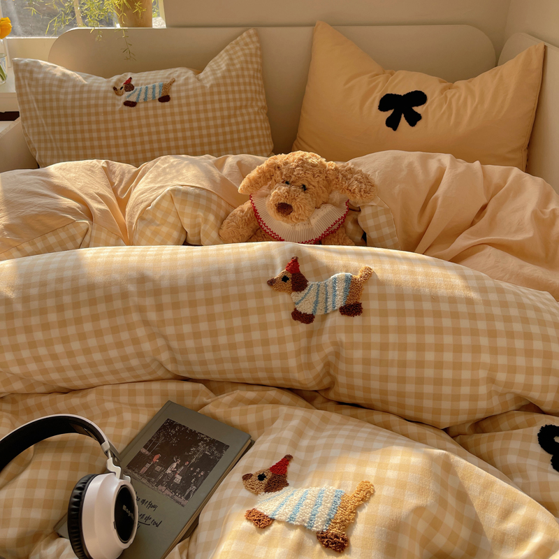 (总)顾里家纺 2024新款韩系腊肠狗毛巾绣牛奶绒四件套,粉格腊肠狗,黄格腊肠狗,咖格腊肠狗,蓝格腊肠狗,绿格腊肠狗
