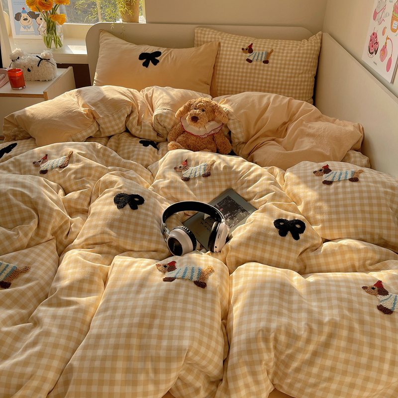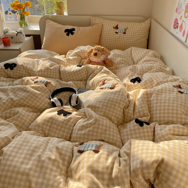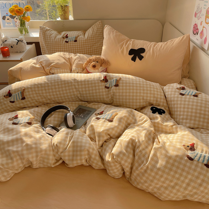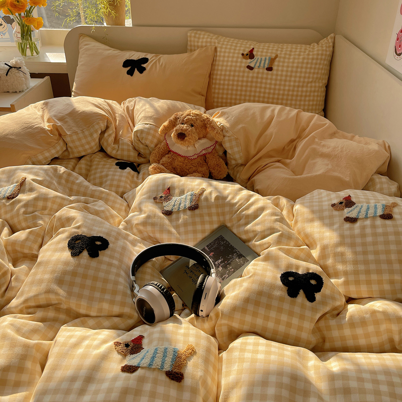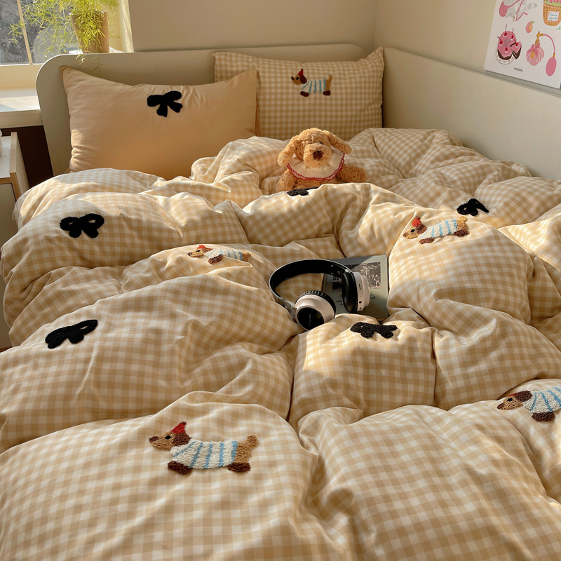 (总)顾里家纺 2024新款ins奶萌格子狗狗毛巾绣牛奶绒四件套,粉格小狗,黄格小狗,咖格小狗,蓝格小狗,绿格小狗