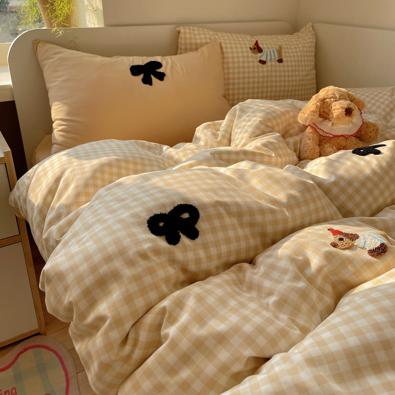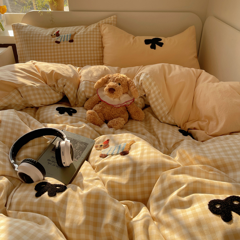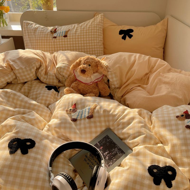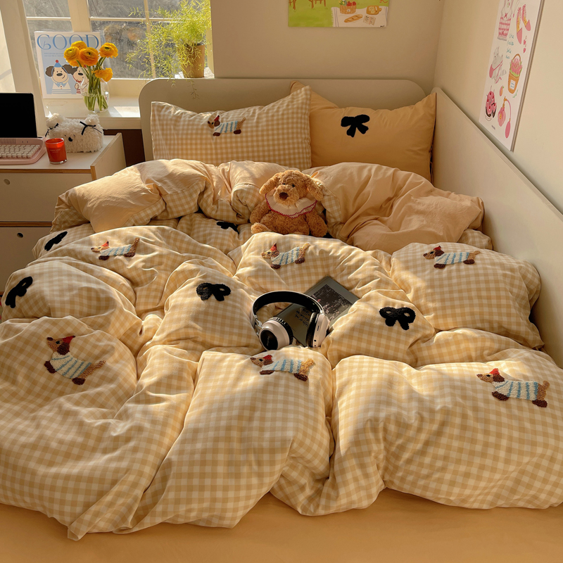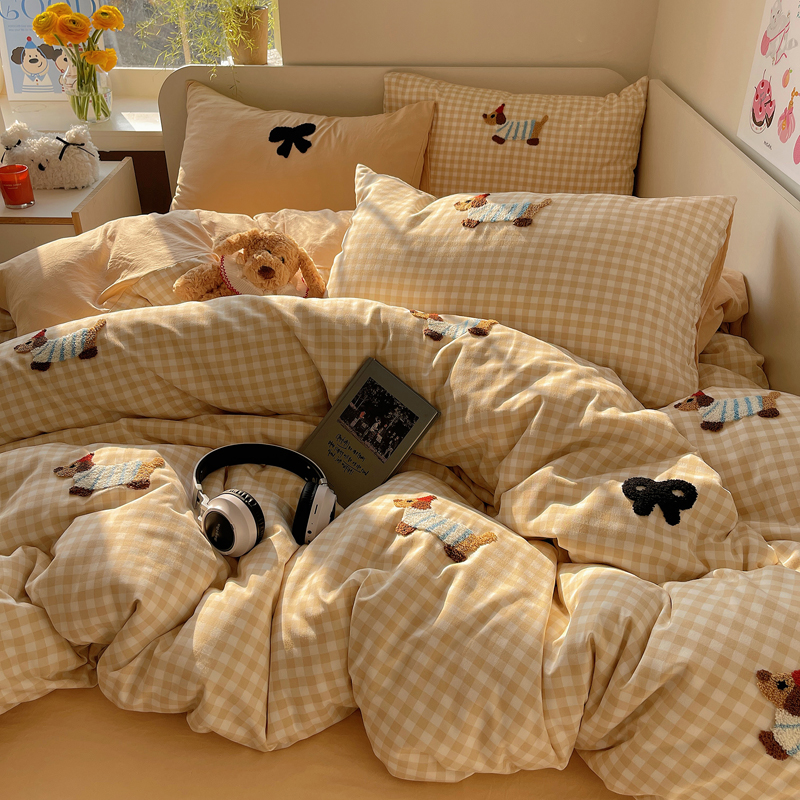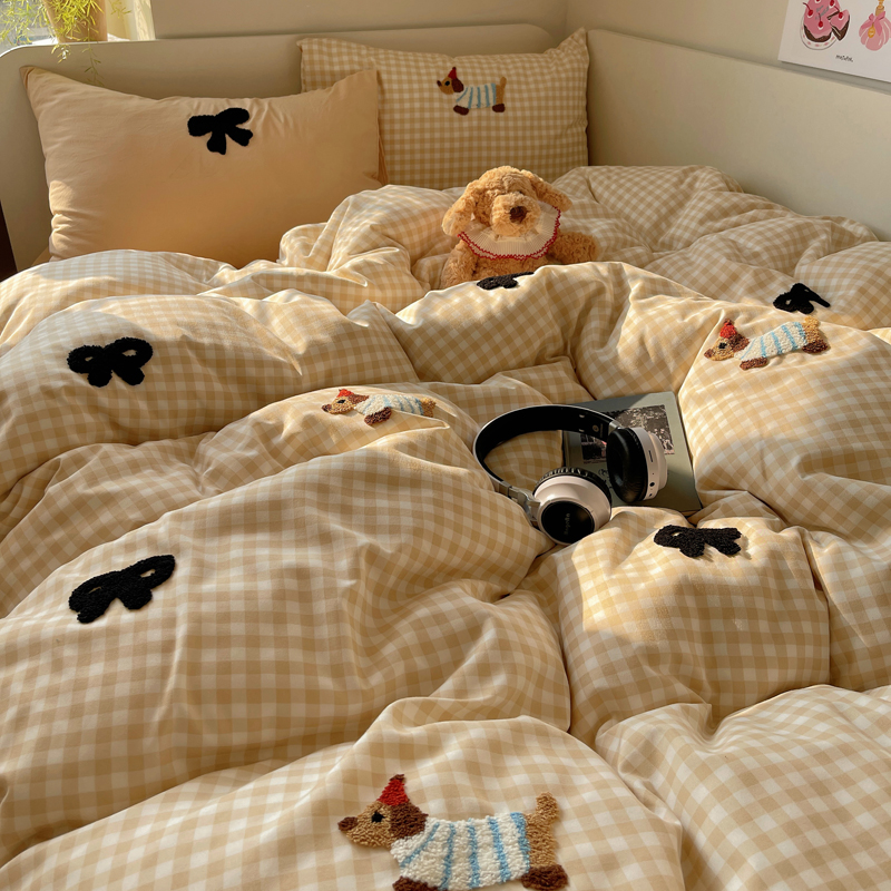 (总)顾里家纺 2024新款ins奶萌格子狗狗毛巾绣牛奶绒四件套,粉格小狗,黄格小狗,咖格小狗,蓝格小狗,绿格小狗