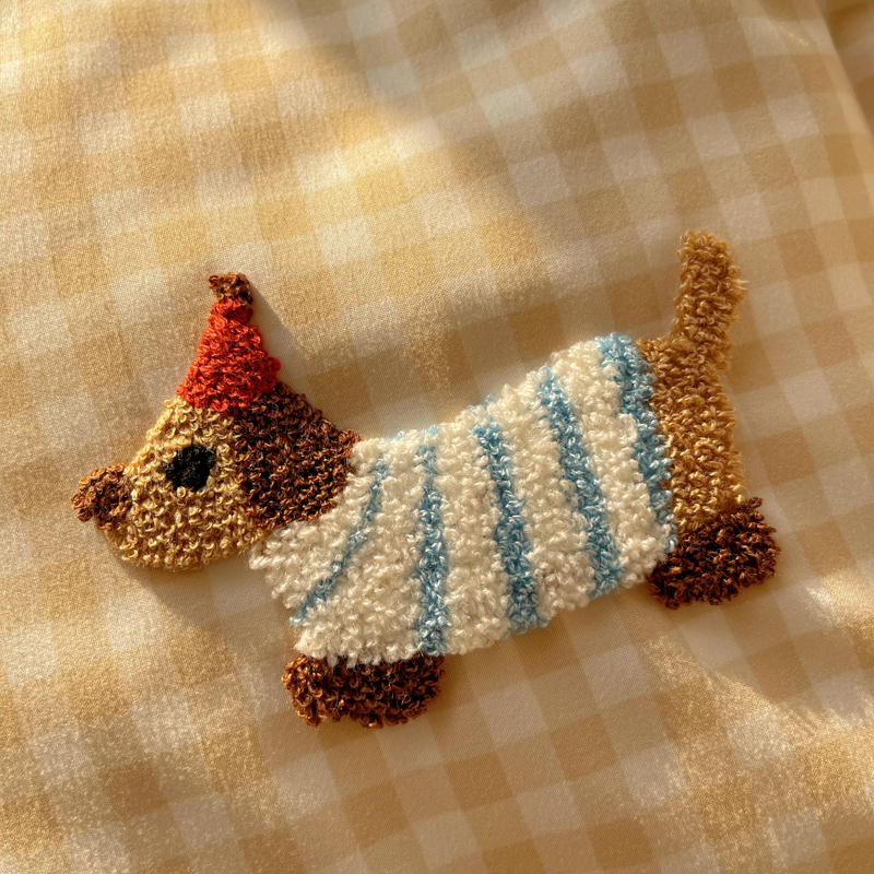 2025新款蝴蝶结腊肠狗毛巾绣云朵棉四件套 咖格腊肠狗