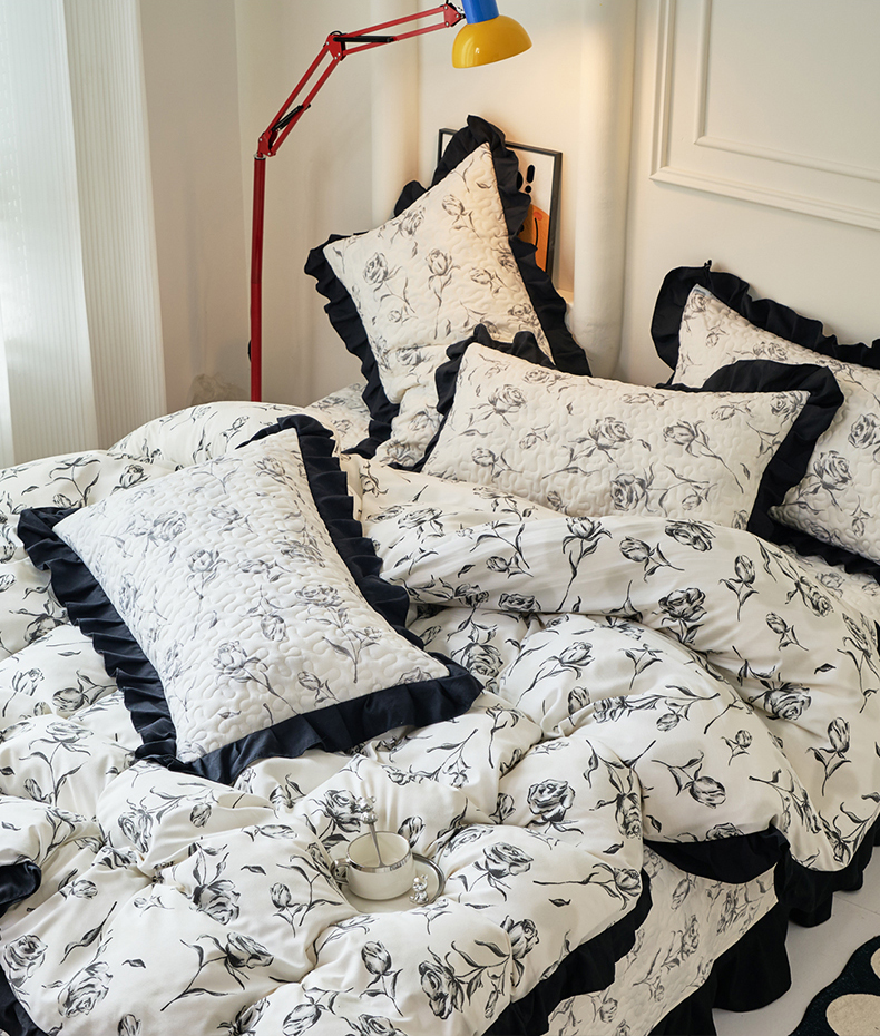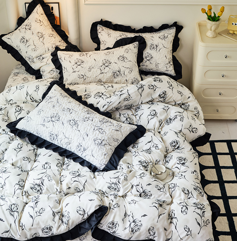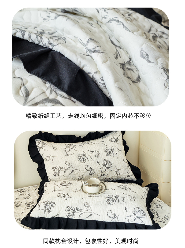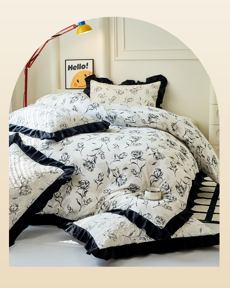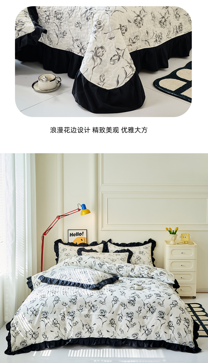 商品名称:蝶帕家纺 2025新款法式赫本风韩版花边水洗棉床盖四件套 水墨玫瑰