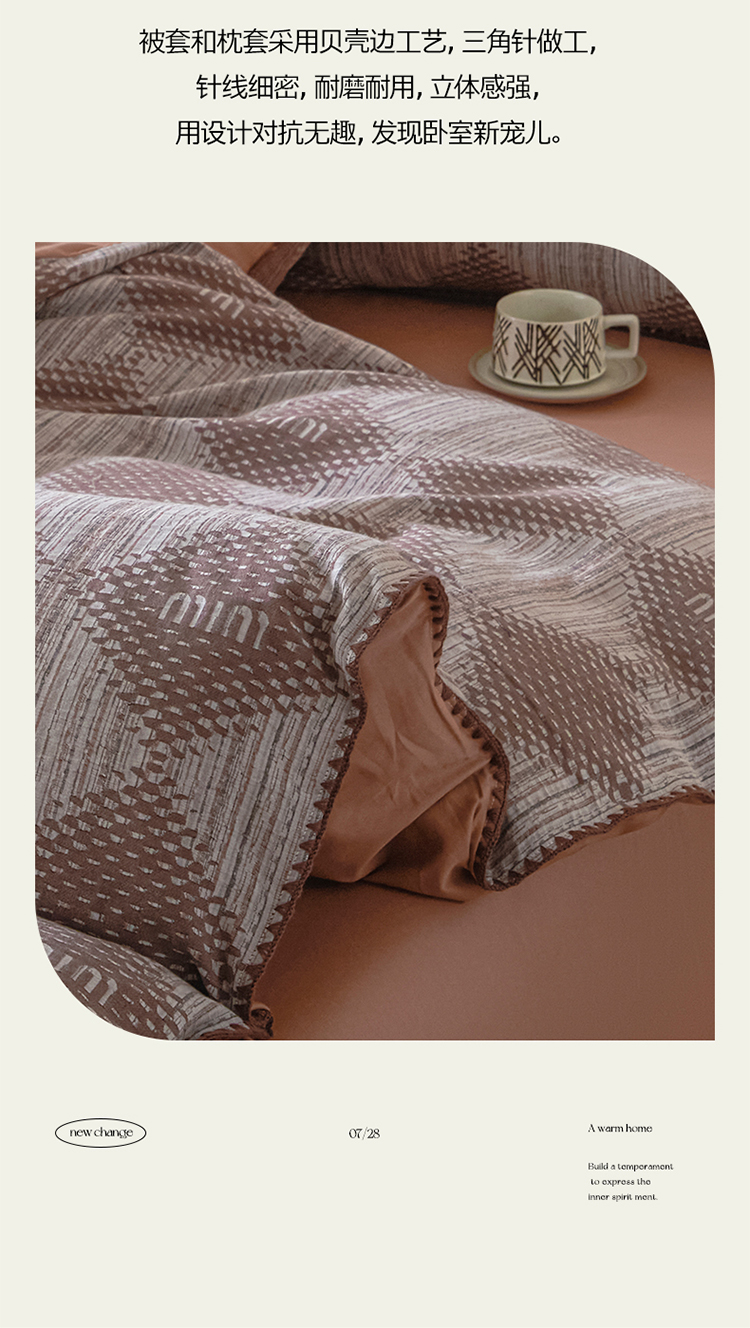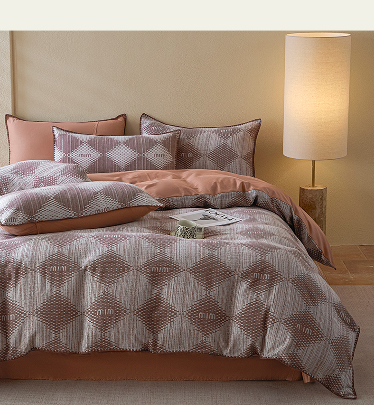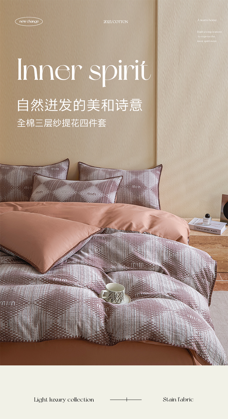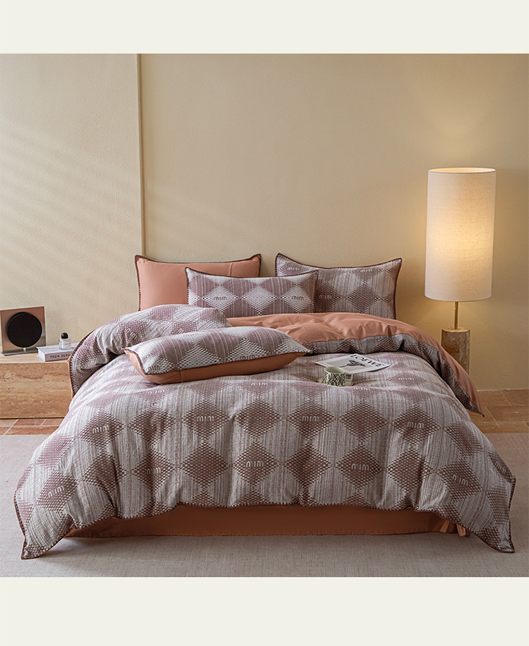 商品名称:2025新款亲肤全棉三层纱提花四件套 菱格-赤缇