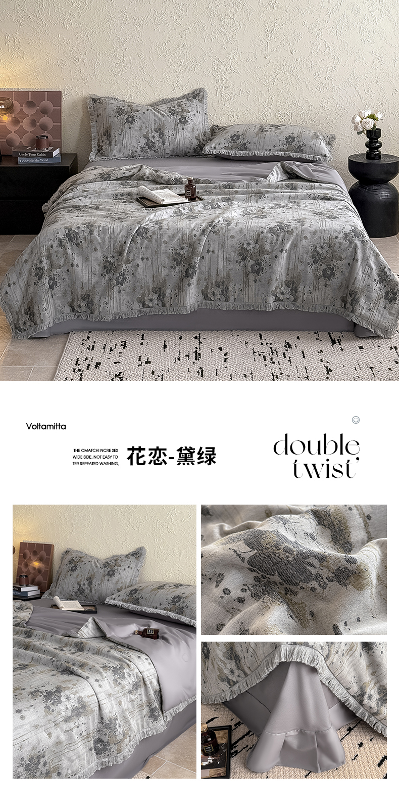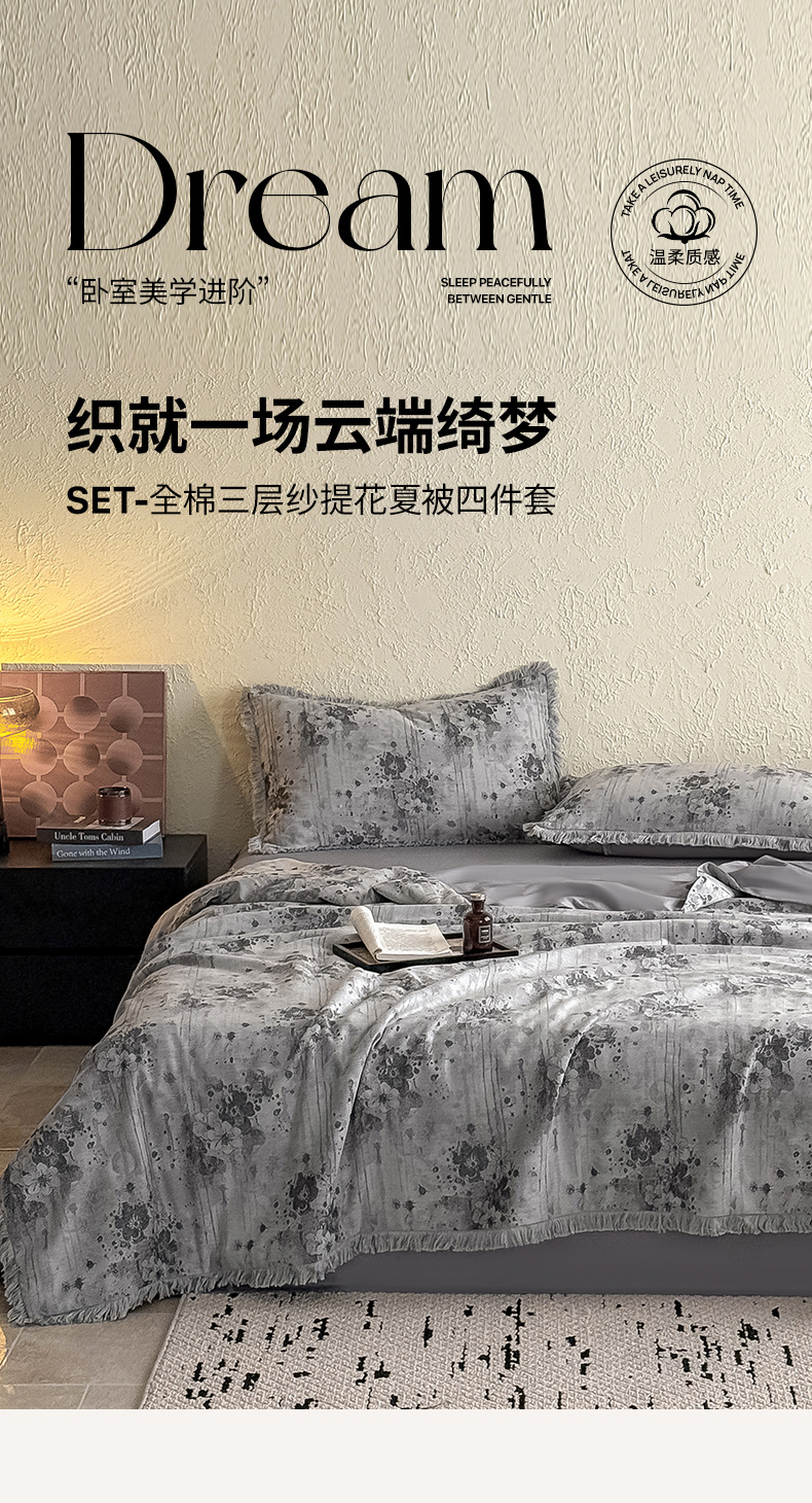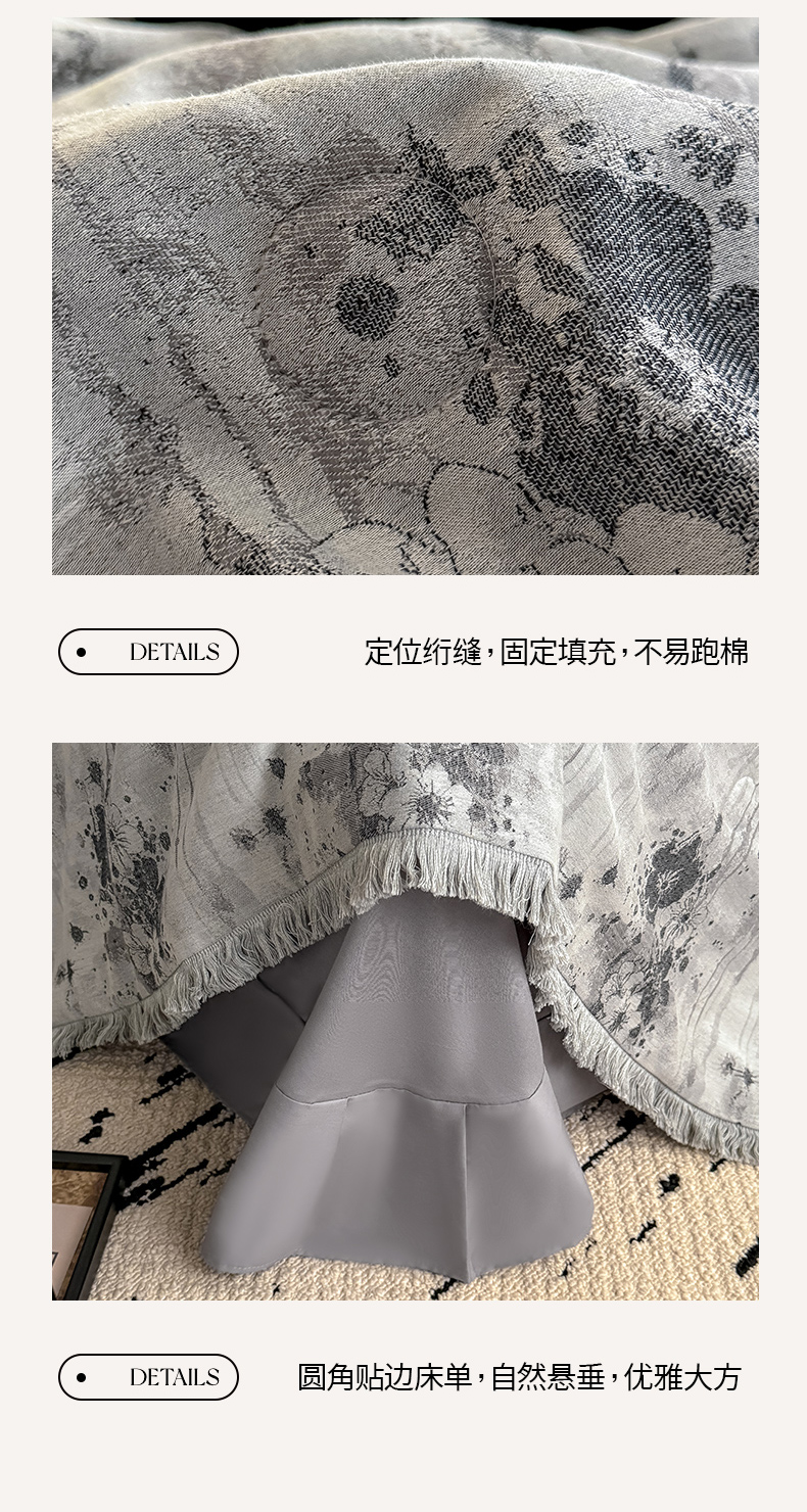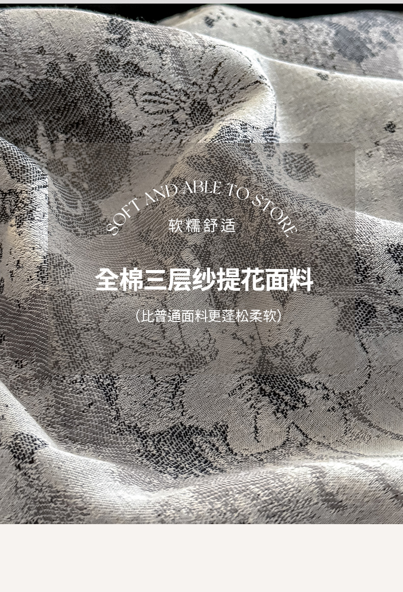 当前位置: 91家纺网 > 商品网购 > 床品套件 > 四件套 > 全棉活性四件套 > 2025新款全棉三层纱提花夏被四件套 竹影-月白