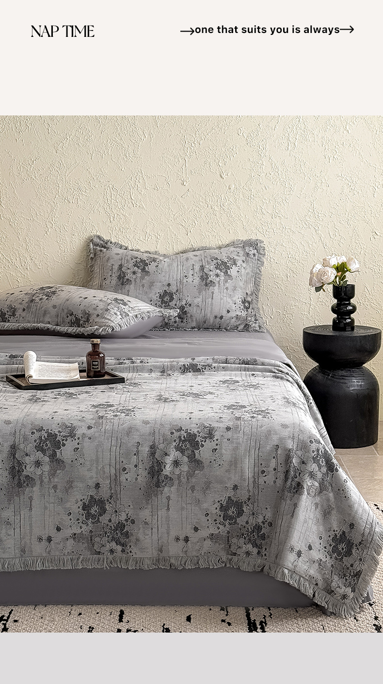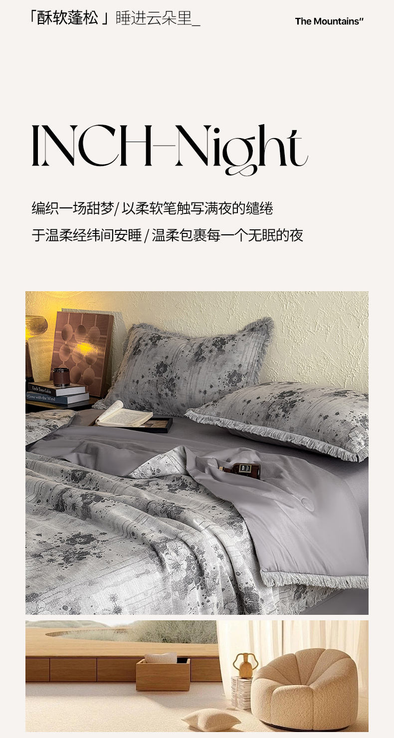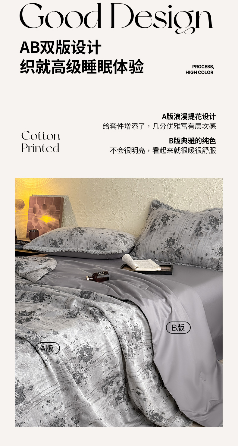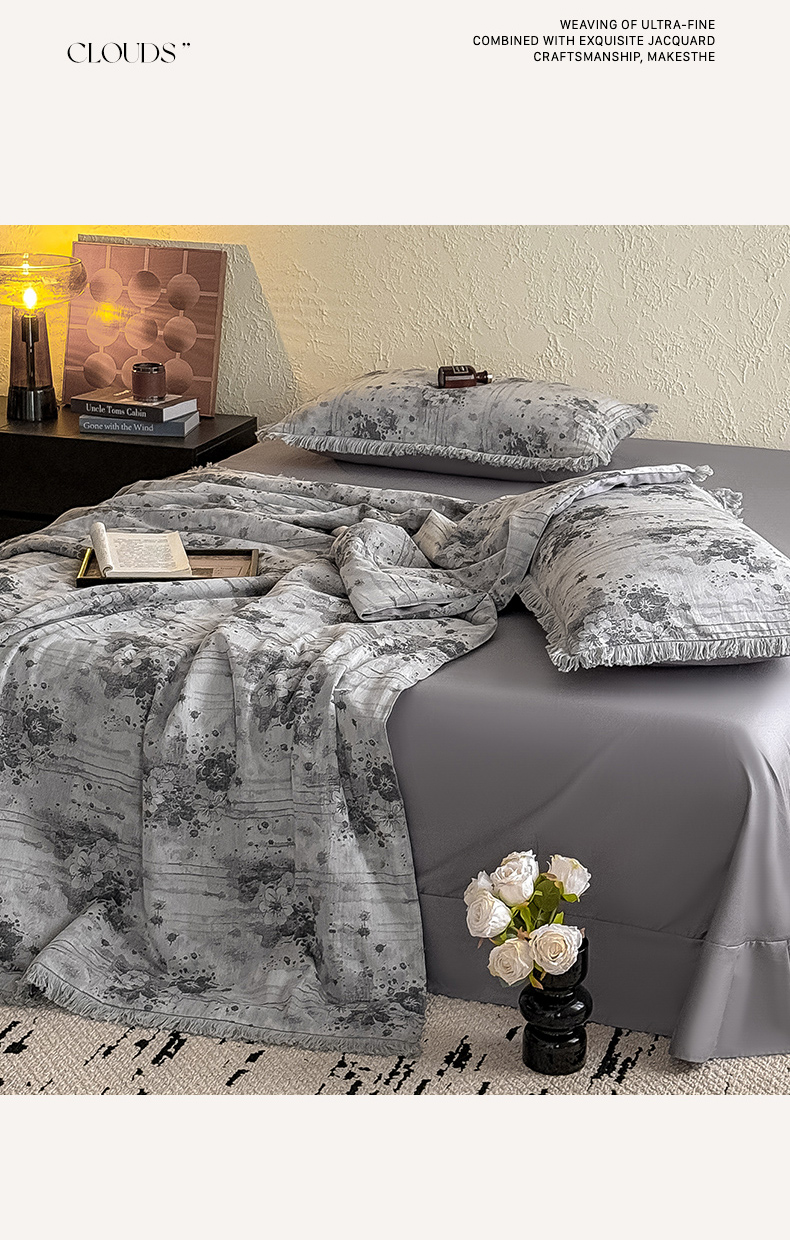 当前位置: 91家纺网 > 商品网购 > 床品套件 > 四件套 > 全棉活性四件套 > 2025新款全棉三层纱提花夏被四件套 竹影-月白