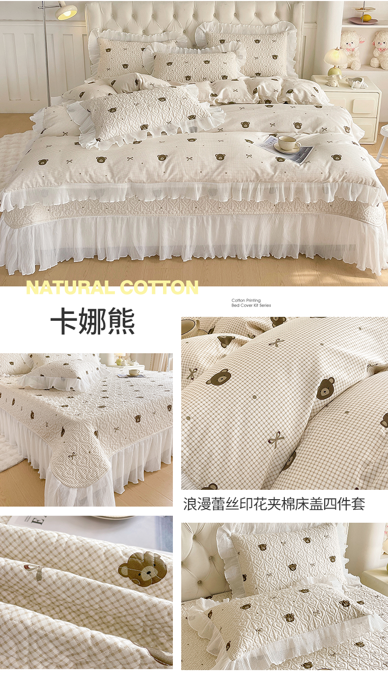 宜凡家纺2025新款雪纺花边印花夹棉床盖三件套四件套 卡娜熊