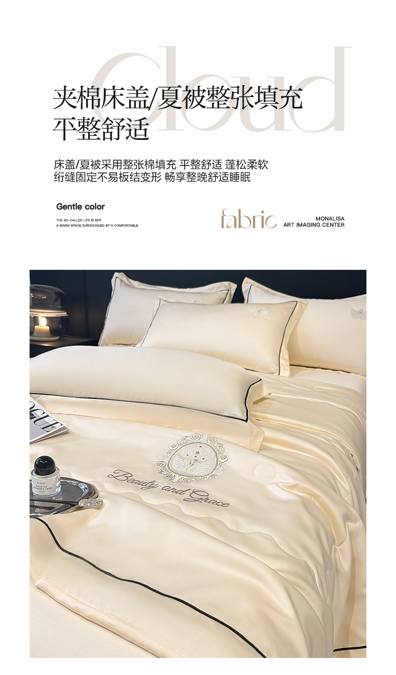 商品名称:富米莱(原臻工厂) 2025新款水洗真丝冰丝刺绣夏被床盖四件套夏凉被 天鹅之恋-奶昔白