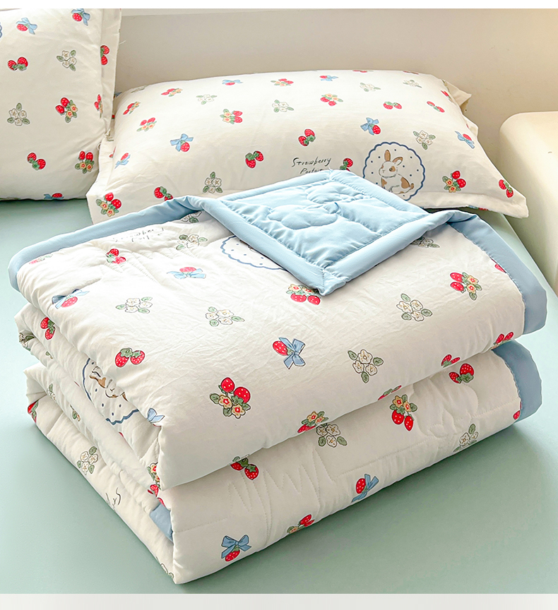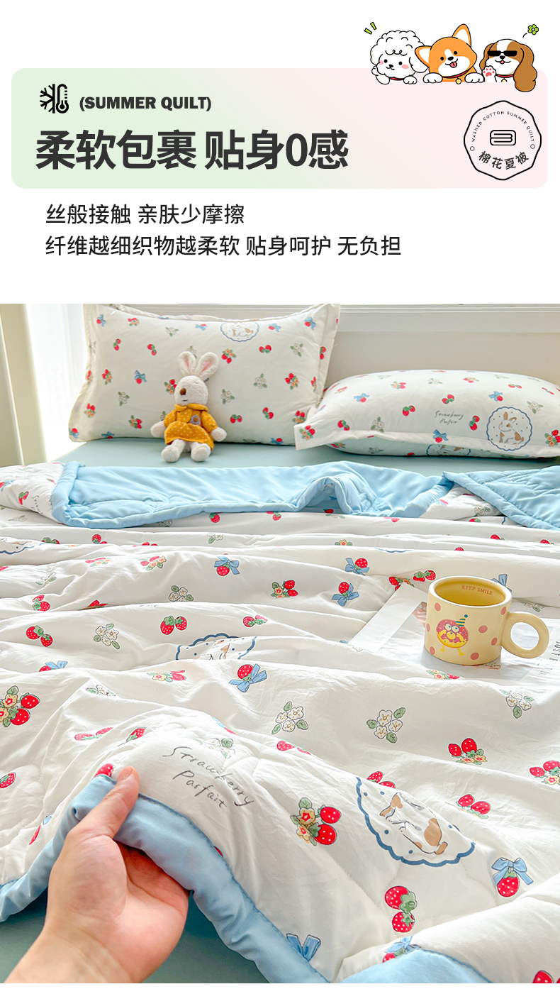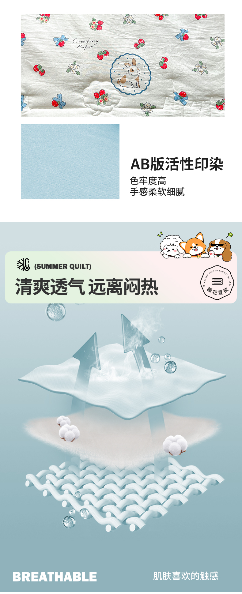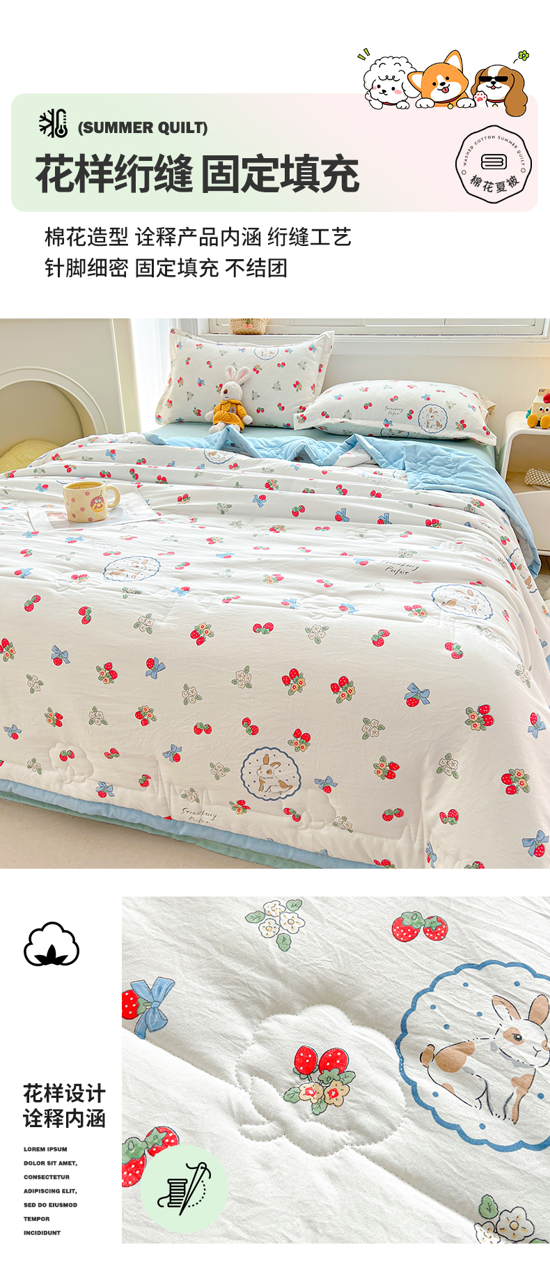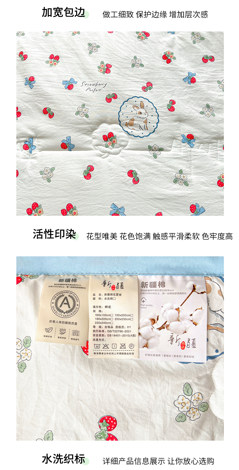 商品名称:西域种棉人·千百笠 2025新款A类新疆棉花夏凉被加宽包边水洗棉卡通印花吸湿透气棉花夏被空调被 凌香 草莓兔