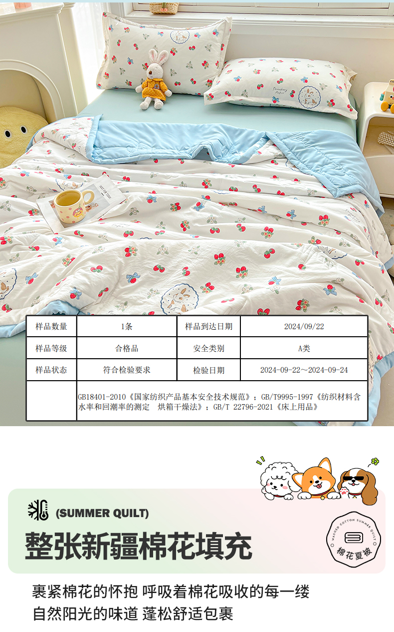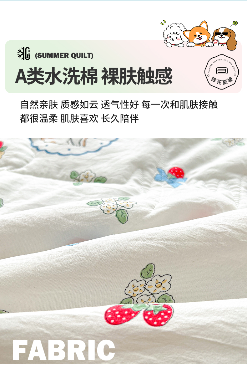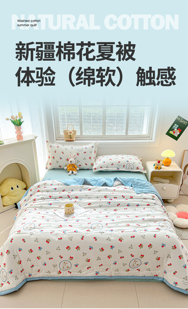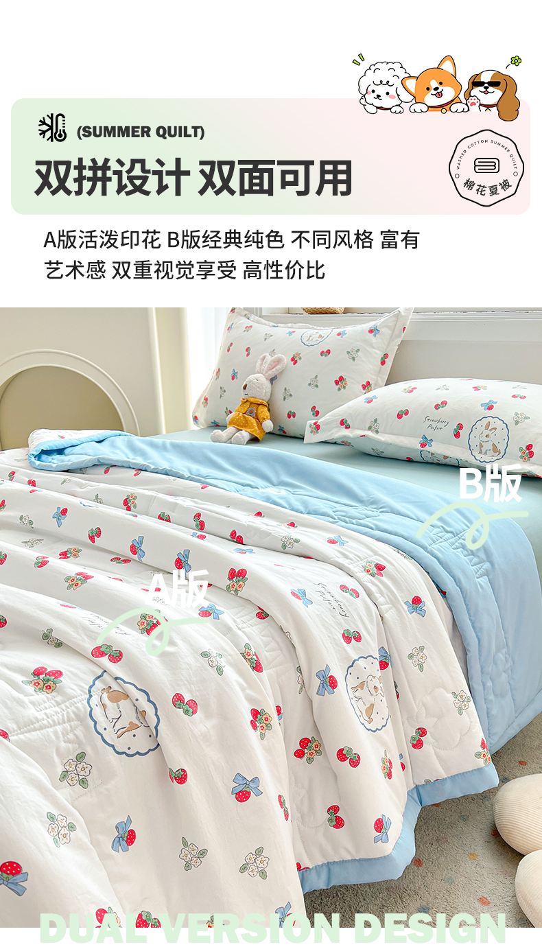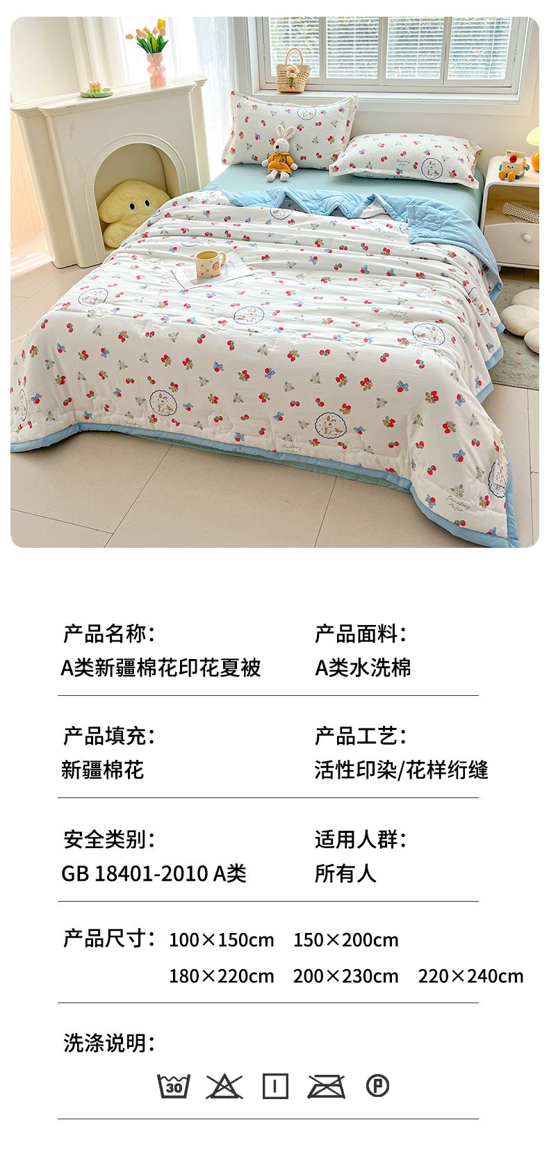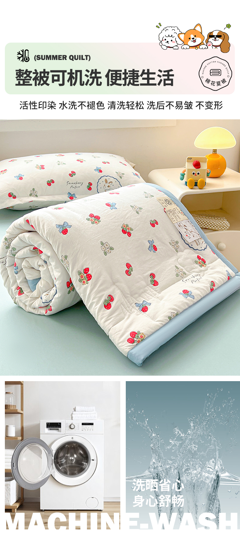 商品名称:西域种棉人·千百笠 2025新款A类新疆棉花夏凉被加宽包边水洗棉卡通印花吸湿透气棉花夏被空调被 凌香 草莓兔