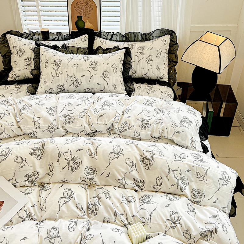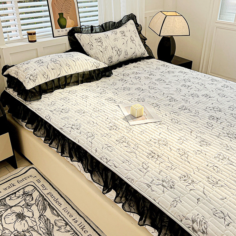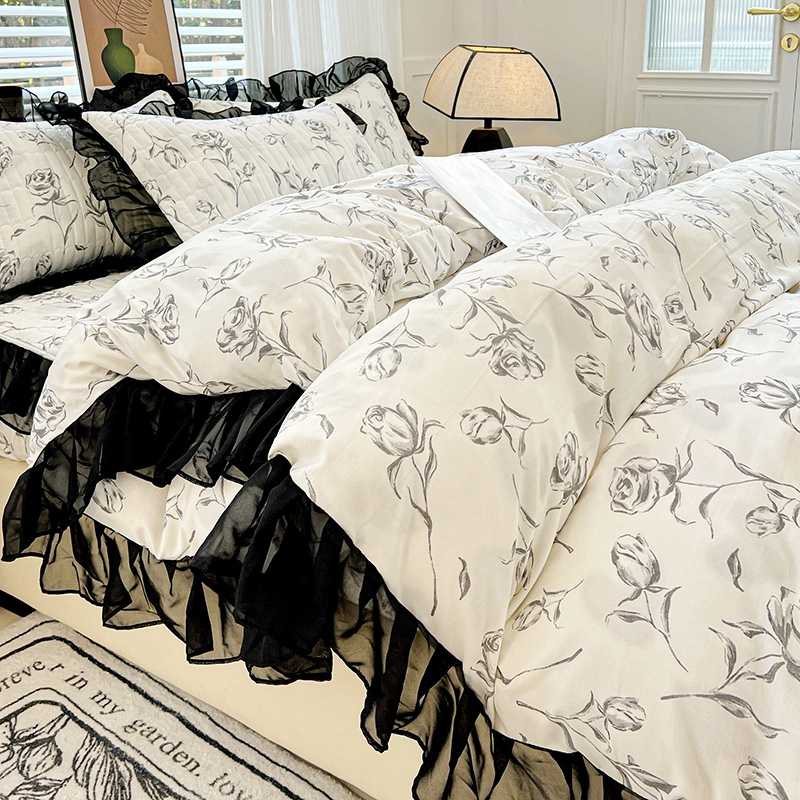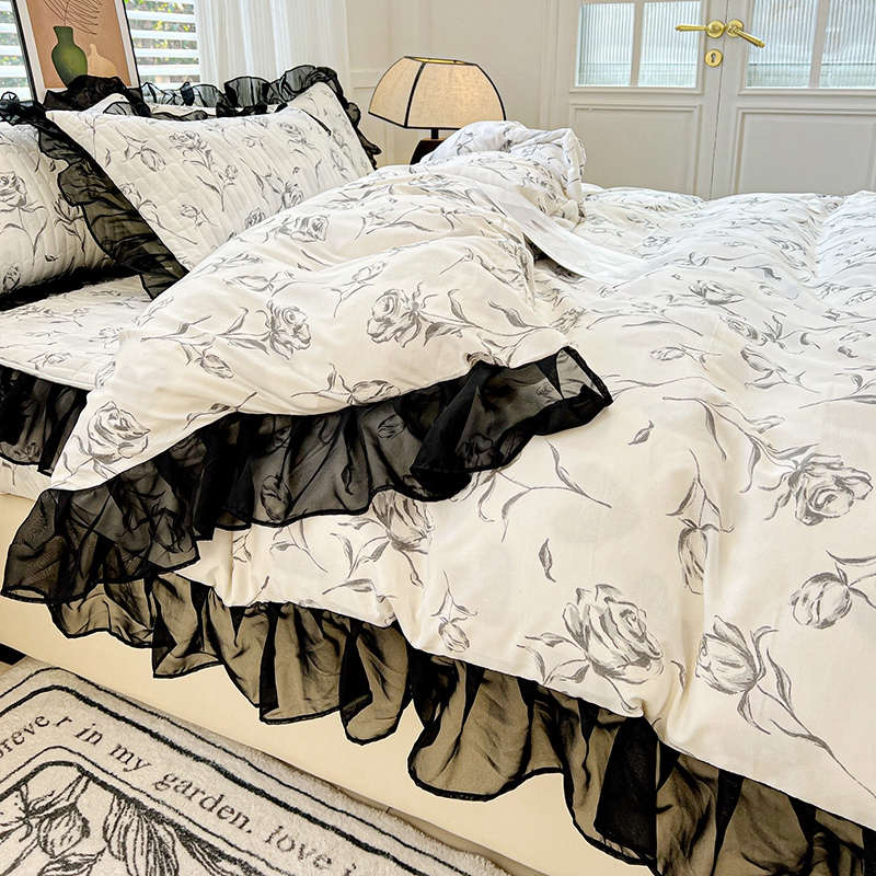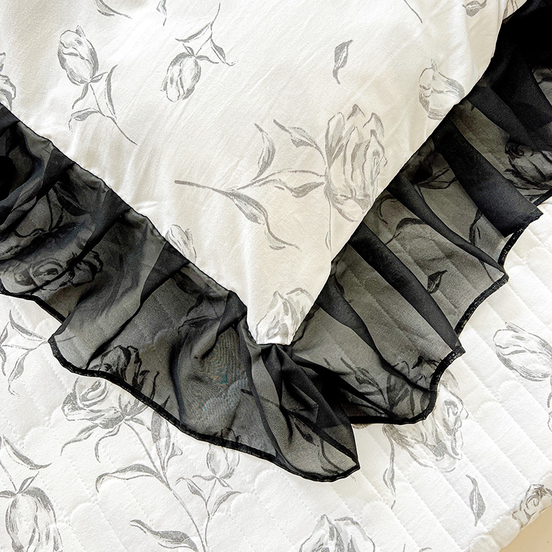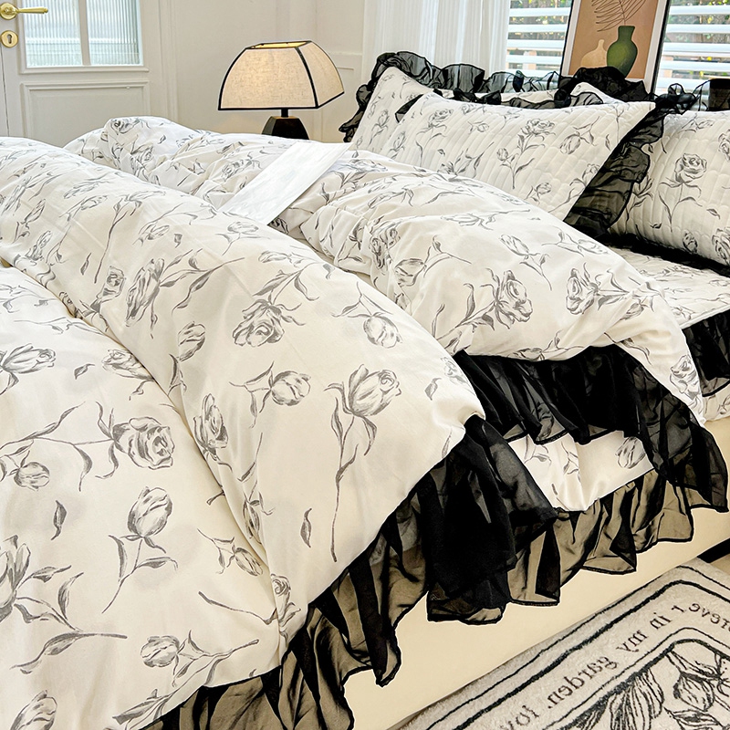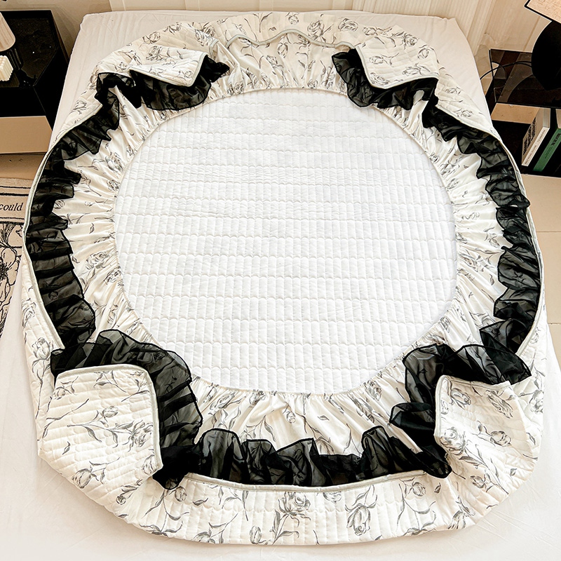 艾橙家纺2025新款法式赫本风水洗棉印花雪纺花边单床笠 水墨玫瑰