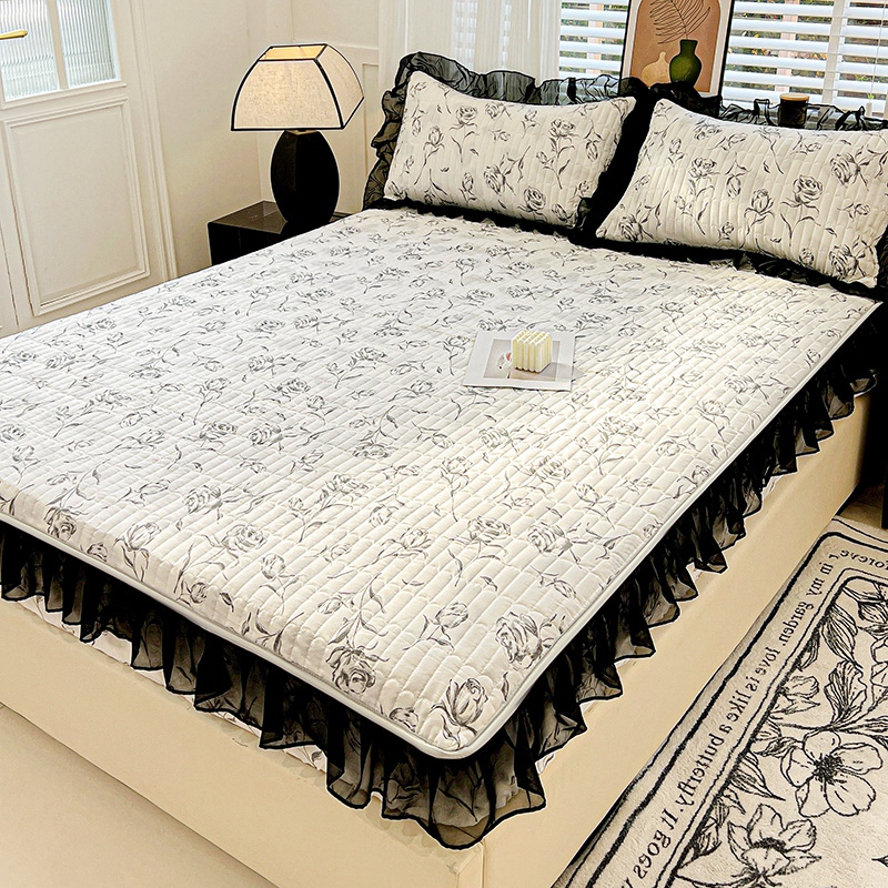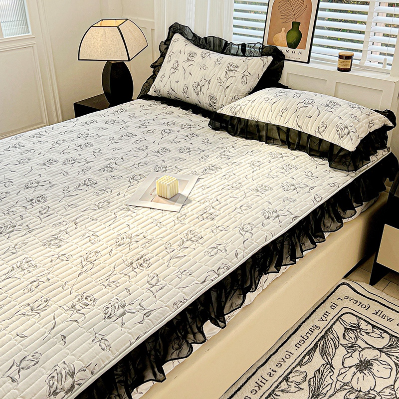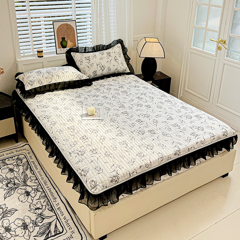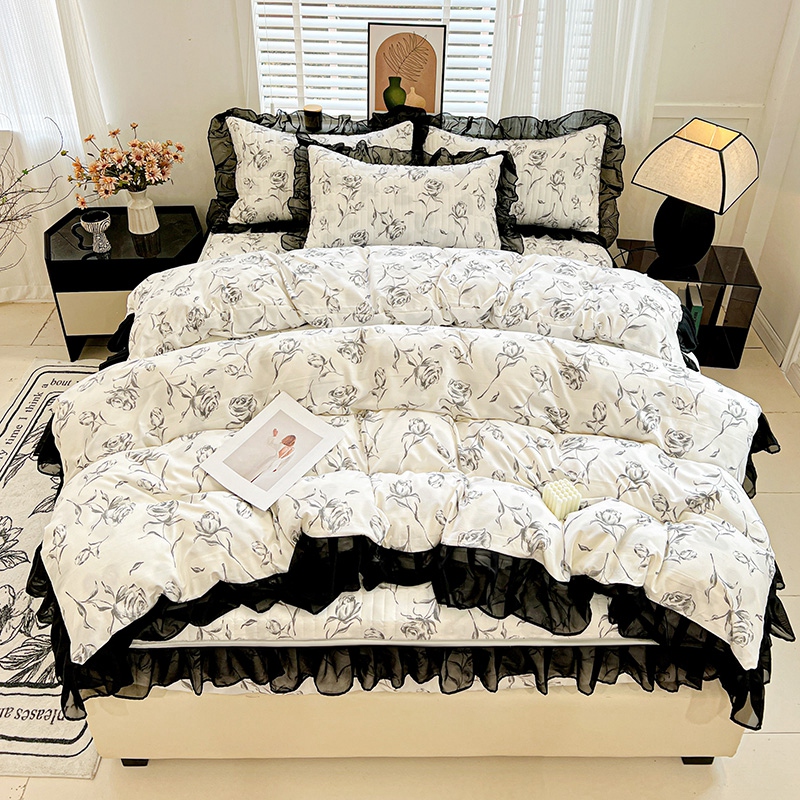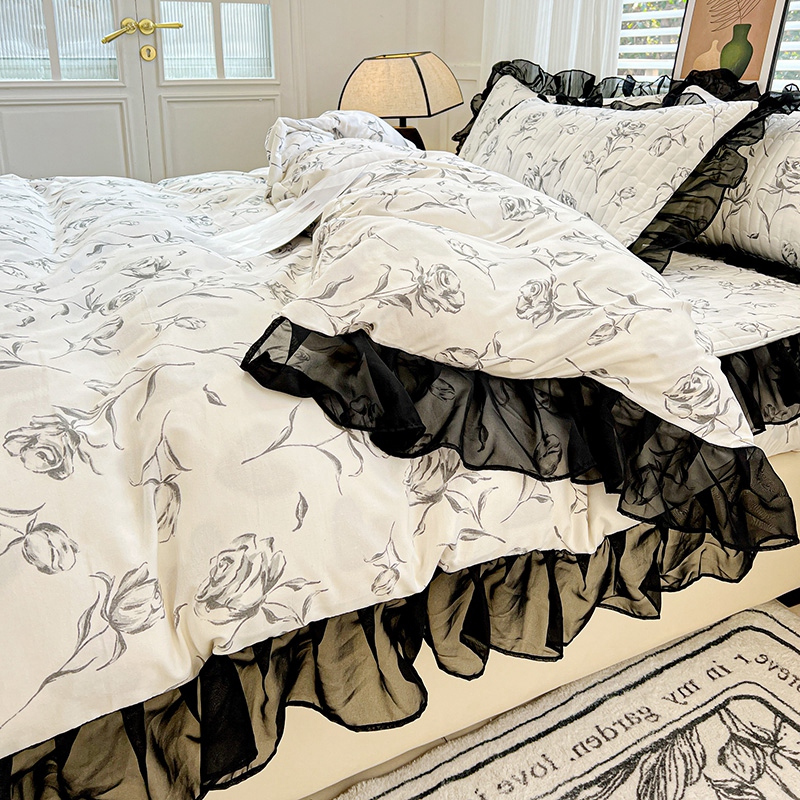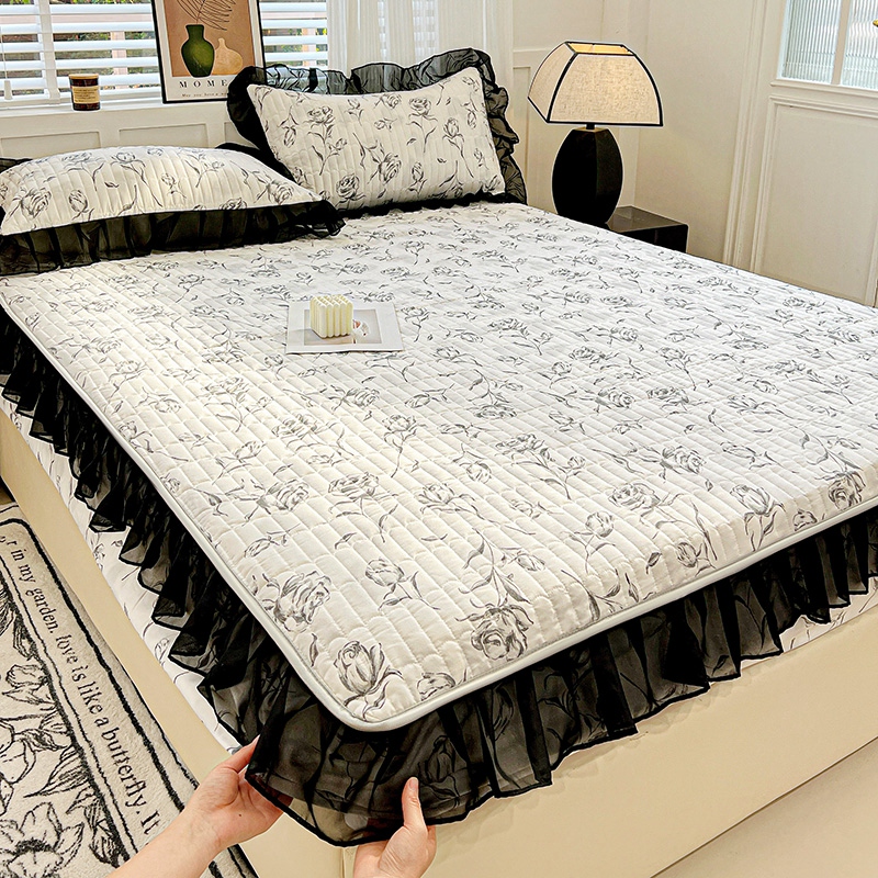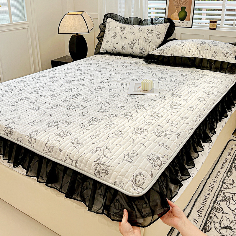 艾橙家纺2025新款法式赫本风水洗棉印花雪纺花边单床笠 水墨玫瑰