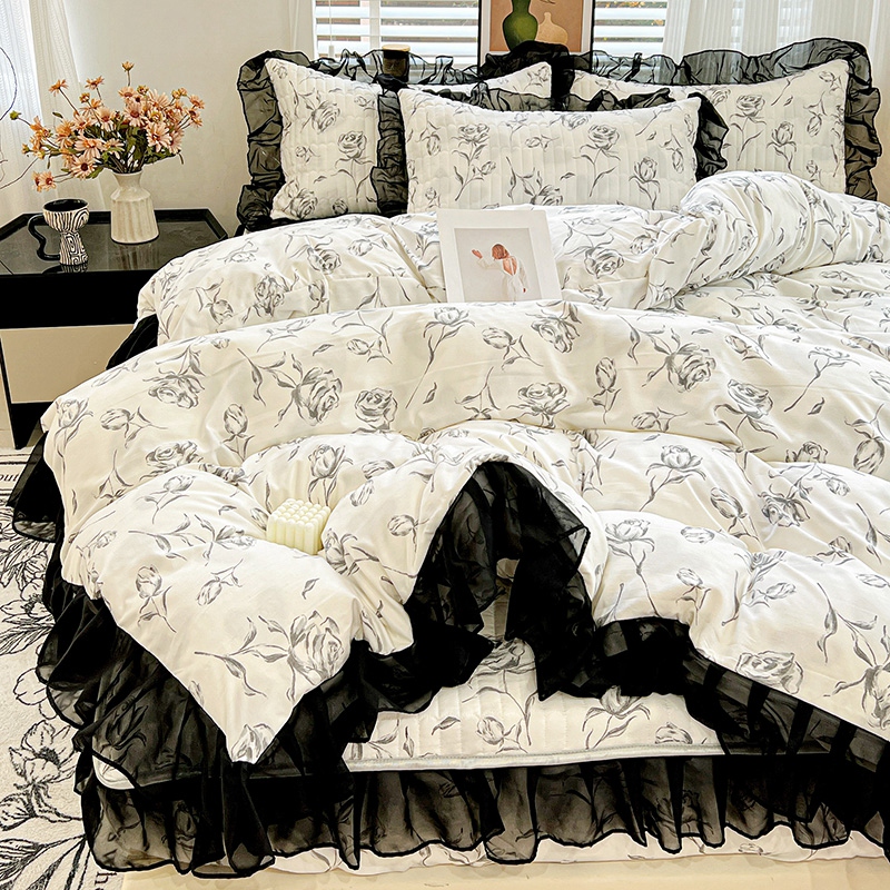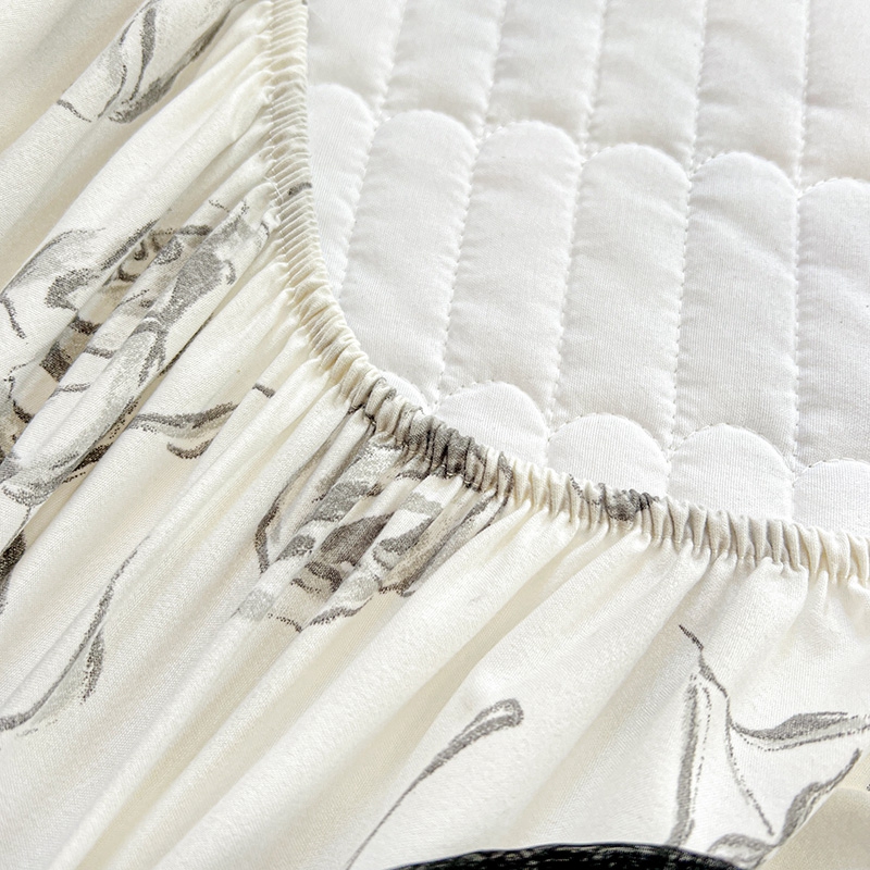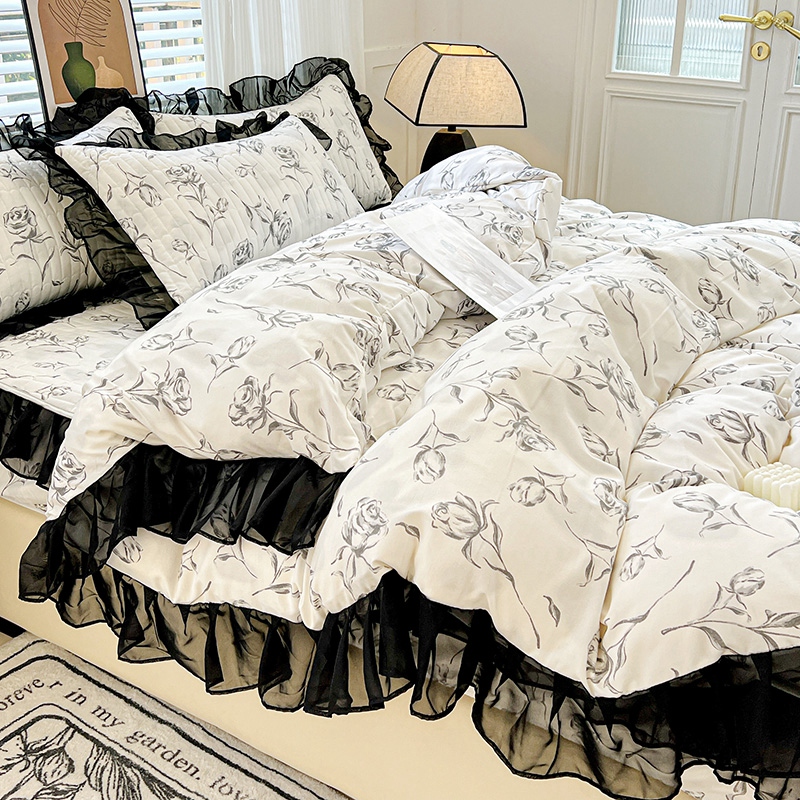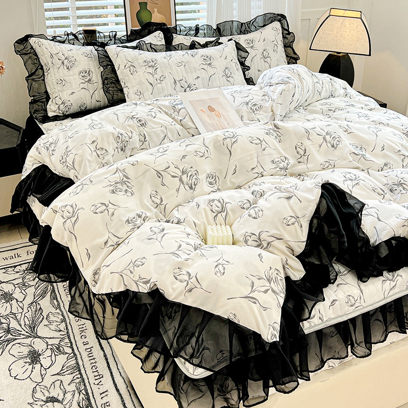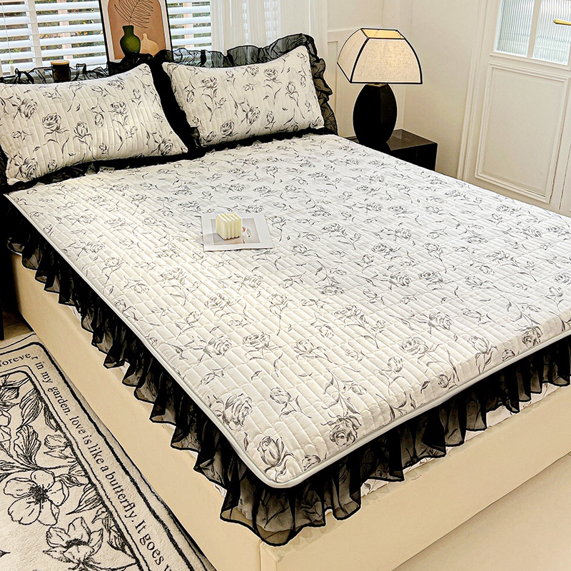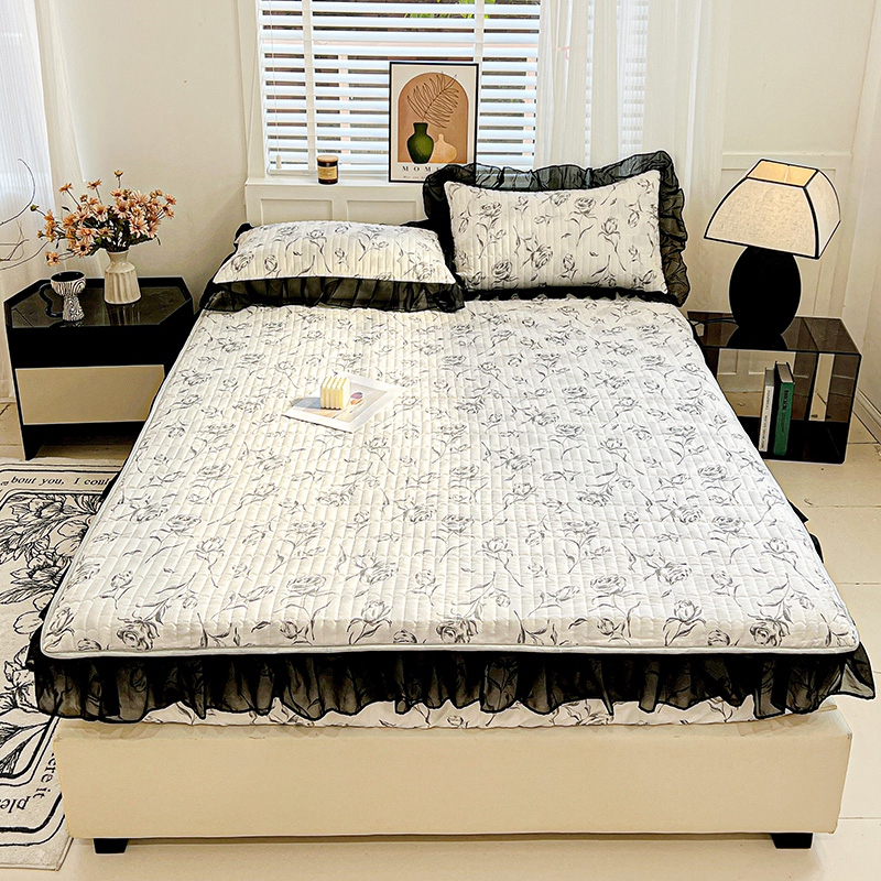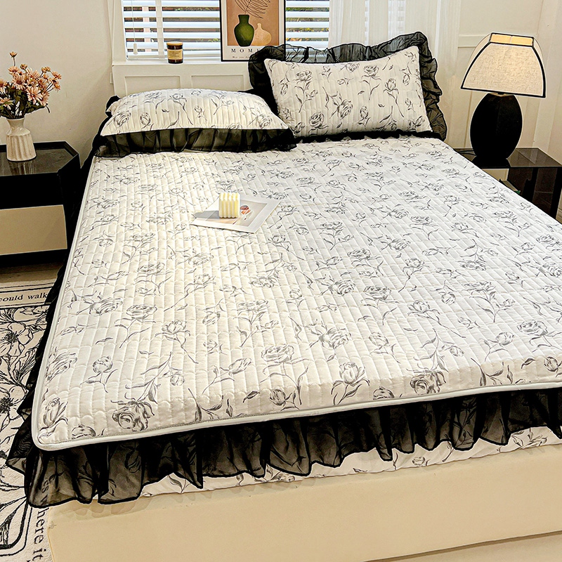 艾橙家纺2025新款法式赫本风水洗棉印花雪纺花边单床笠 水墨玫瑰
