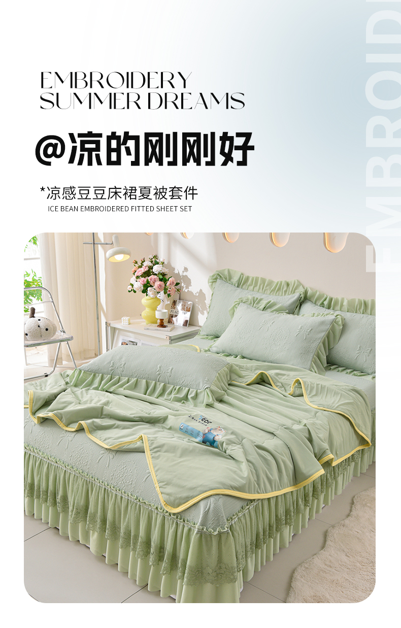 商品名称:铠畅家纺 2025新款凉感豆豆床裙夏被四件套--花梦蝶 花梦蝶-绿