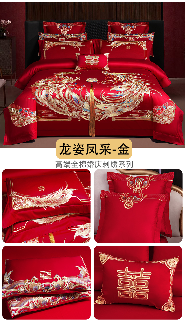 (总)芊囍纺 2025新款全棉刺绣婚庆四件套,囍多多,一生一世,九五之尊,龙凤百子,百子千禧,比翼双飞,乘龙跨凤,金龙金凤,龙姿凤采-红,龙姿凤采-金,红妆佳人,佳偶良缘,比翼双飞,皇家喜事,龙凤双喜,喜事连绵,至尊龙凤,千禧婚嫁,十里红妆,世纪之恋,喜上添花,喜事到家,新婚快乐,幸福约定红,幸福约定金,幸福喜嫁红,幸福喜嫁金,江山龙凤,金玉满堂,龙凤传情,龙凤佳人,龙凤同喜,美人龙凤,花开浪漫金