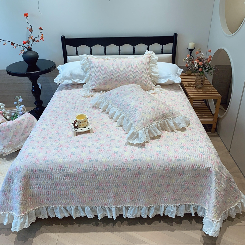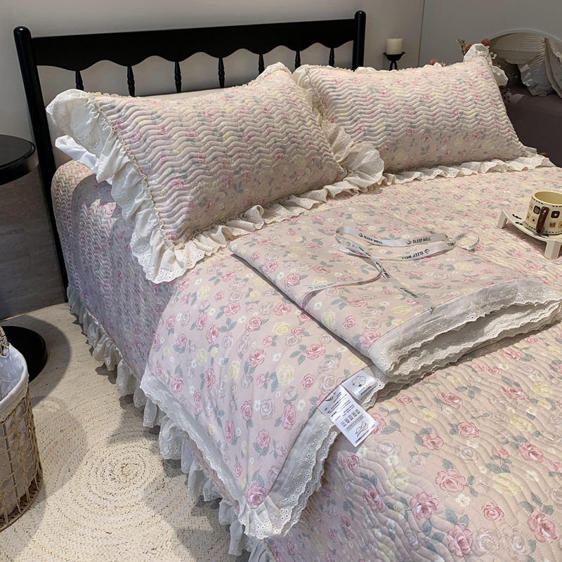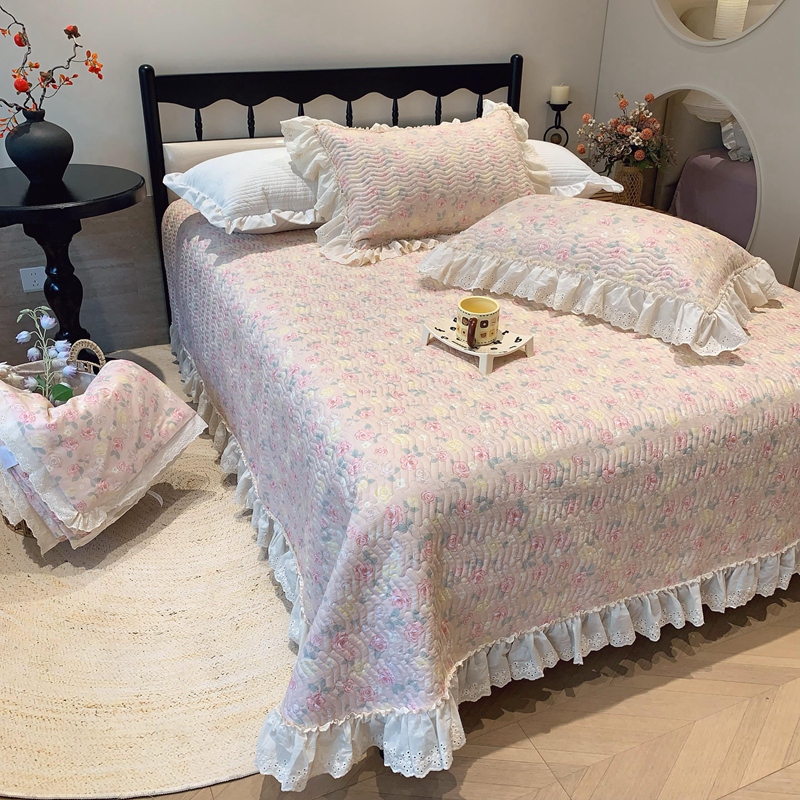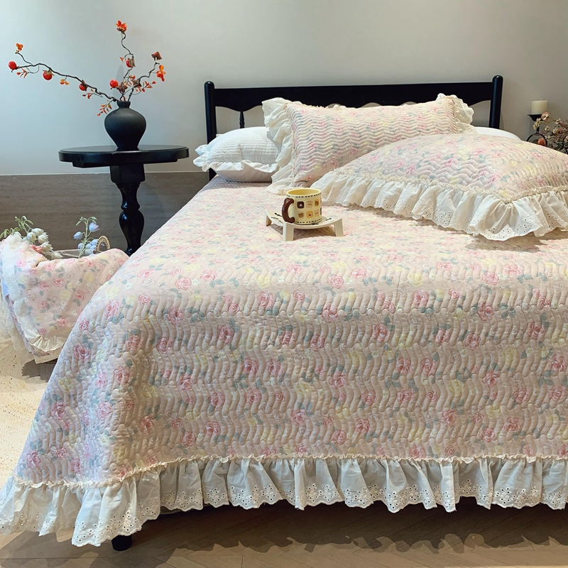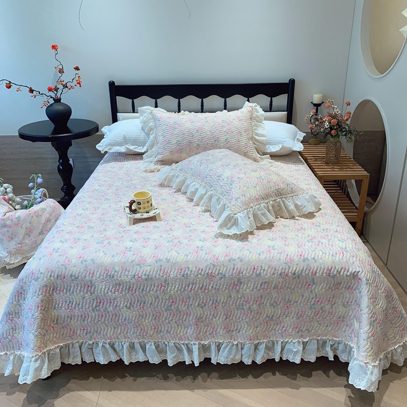 奈萝家纺 2025春夏新款全棉纯棉蕾丝花边款床盖三件套 蔷薇