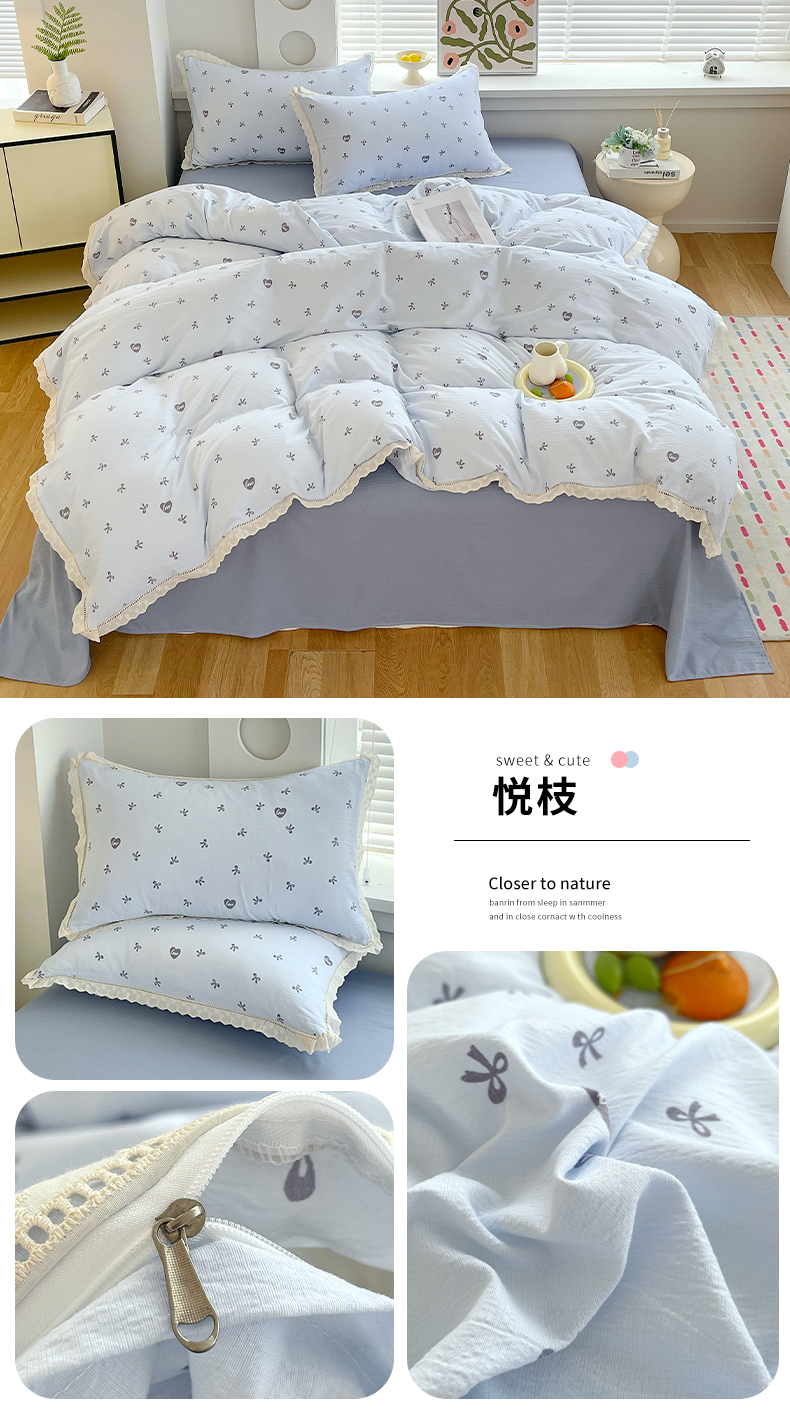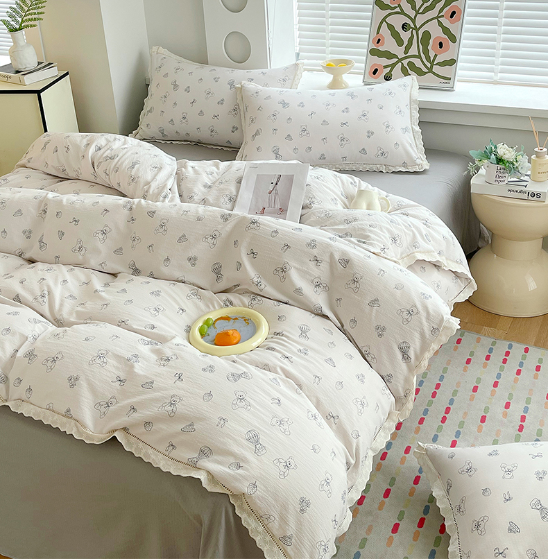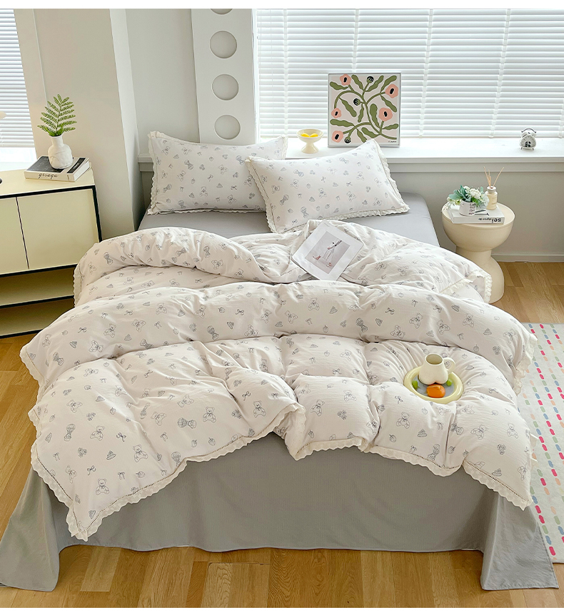 雨彤家纺 2025新款A类高克重云感皱皱双层纱全棉镂空花边款法式四件套-叠拍图 蛋糕熊