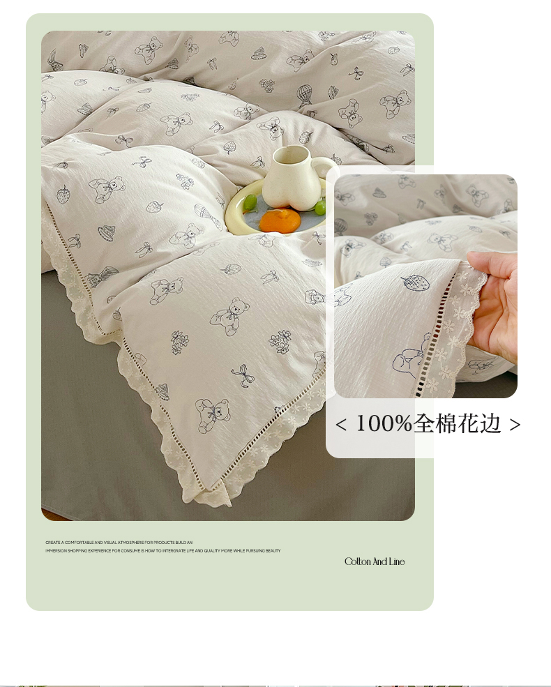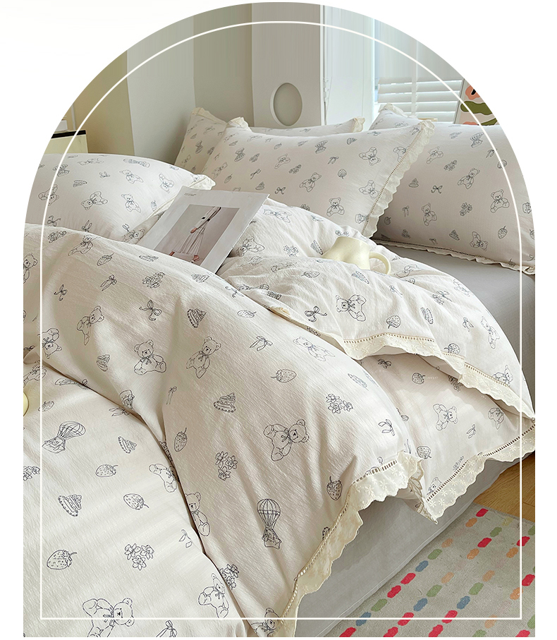 商品名称:雨彤家纺 2025新款A类高克重云感皱皱双层纱全棉镂空花边款法式四件套-叠拍图 蛋糕熊