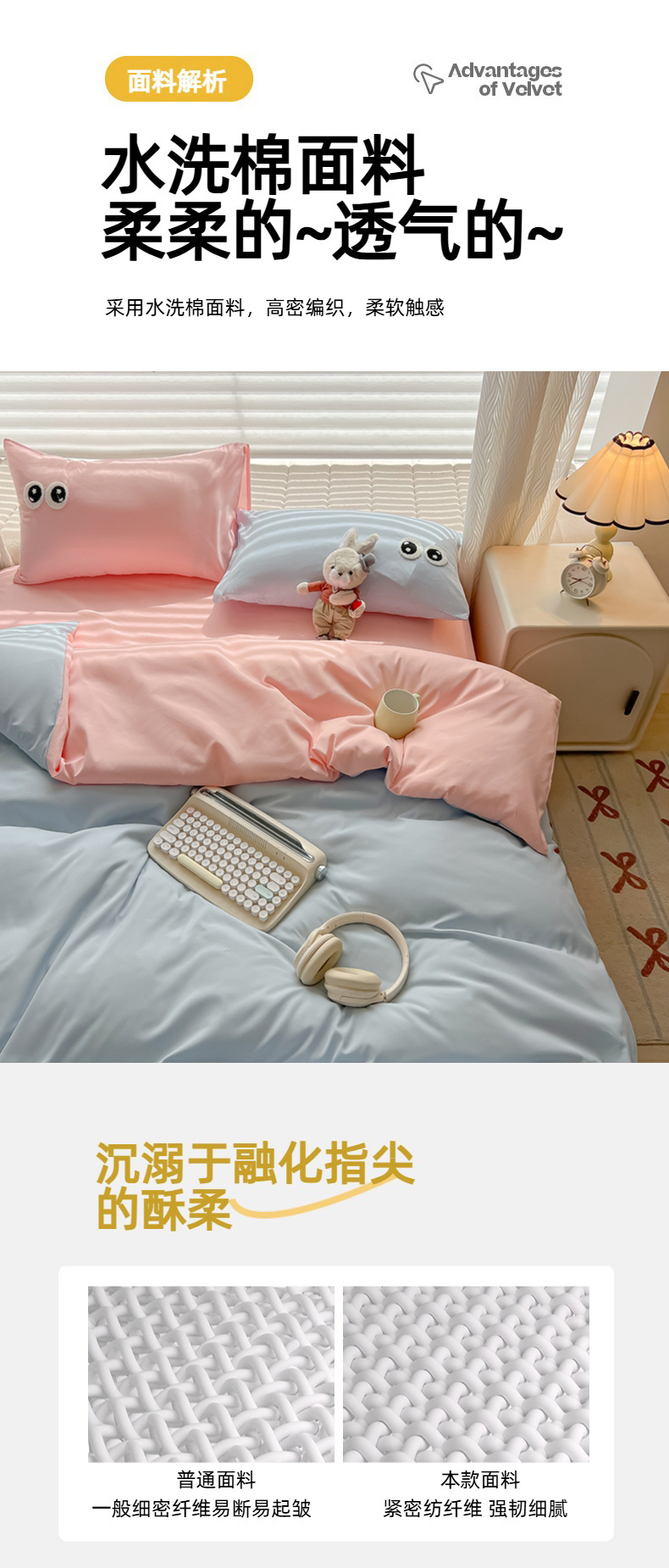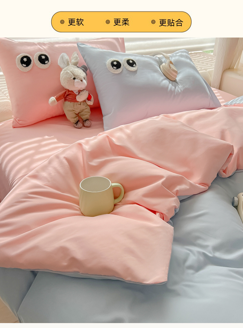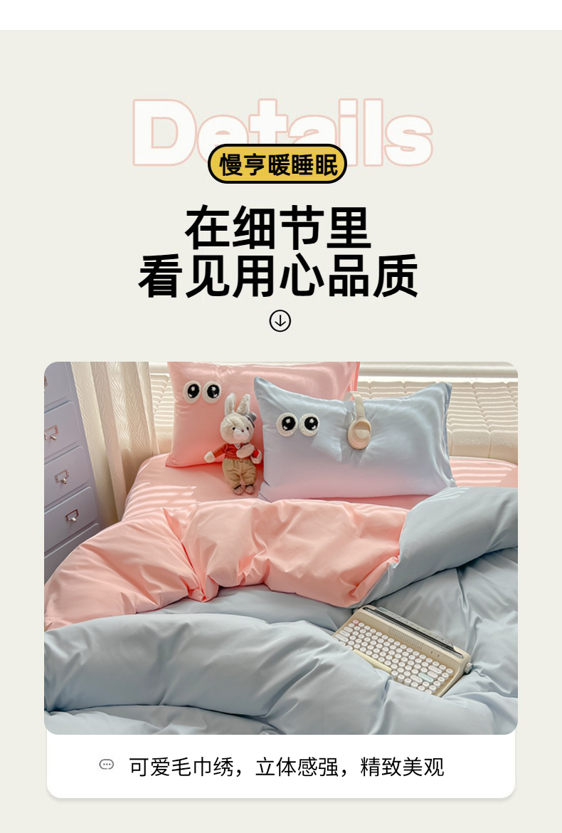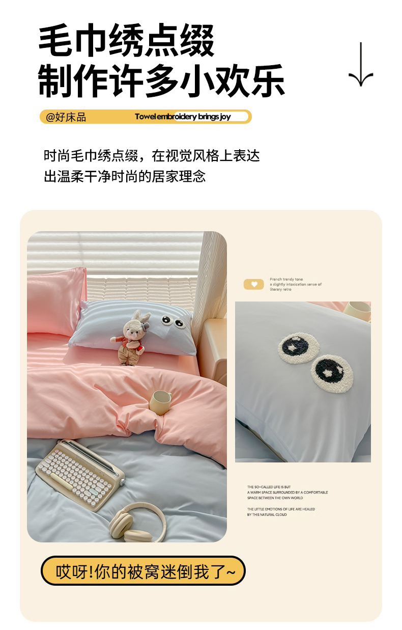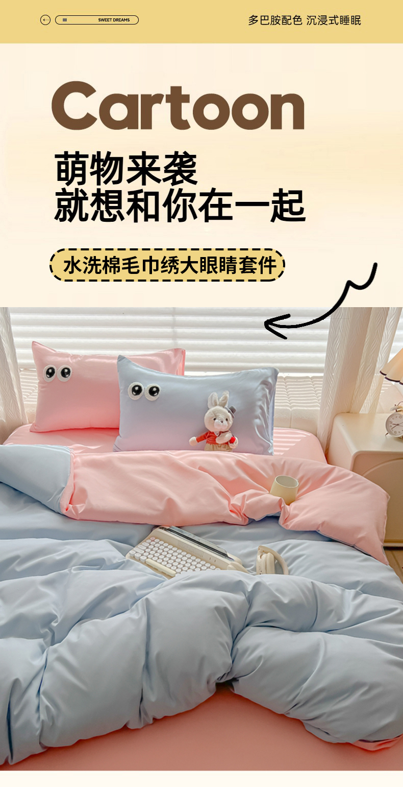 商品名称:(总)(有买家秀)2025新款大眼睛毛巾绣水洗棉纯色双拼四件套简约高级治愈风超柔舒适床上用品