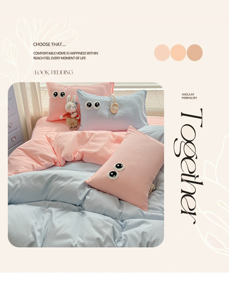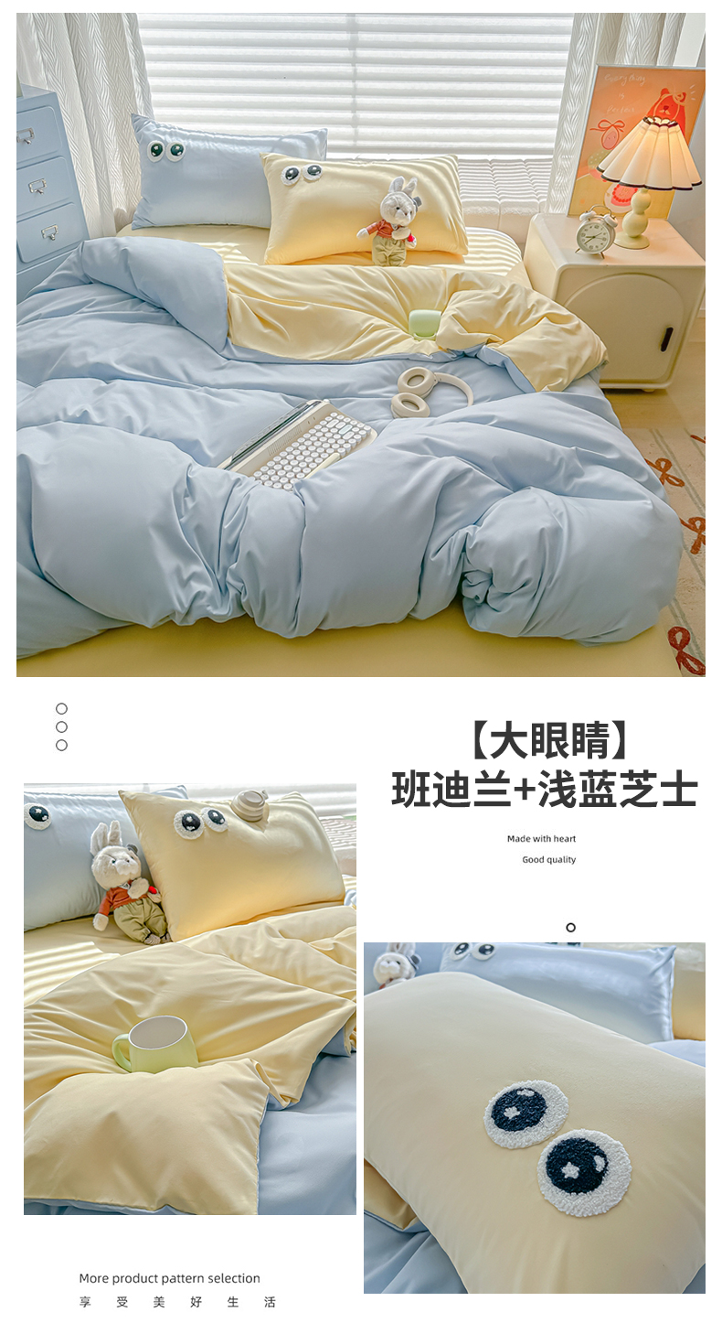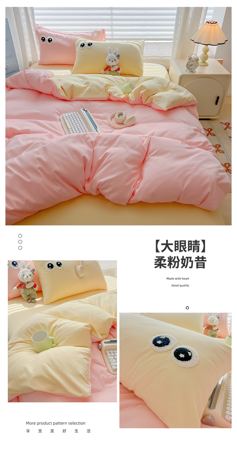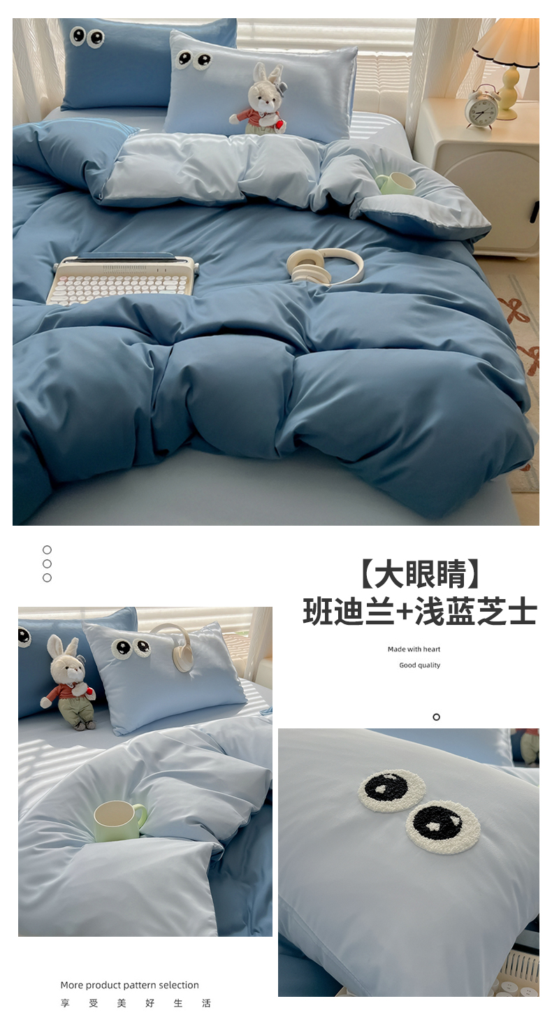 商品名称:(总)(有买家秀)2025新款大眼睛毛巾绣水洗棉纯色双拼四件套简约高级治愈风超柔舒适床上用品