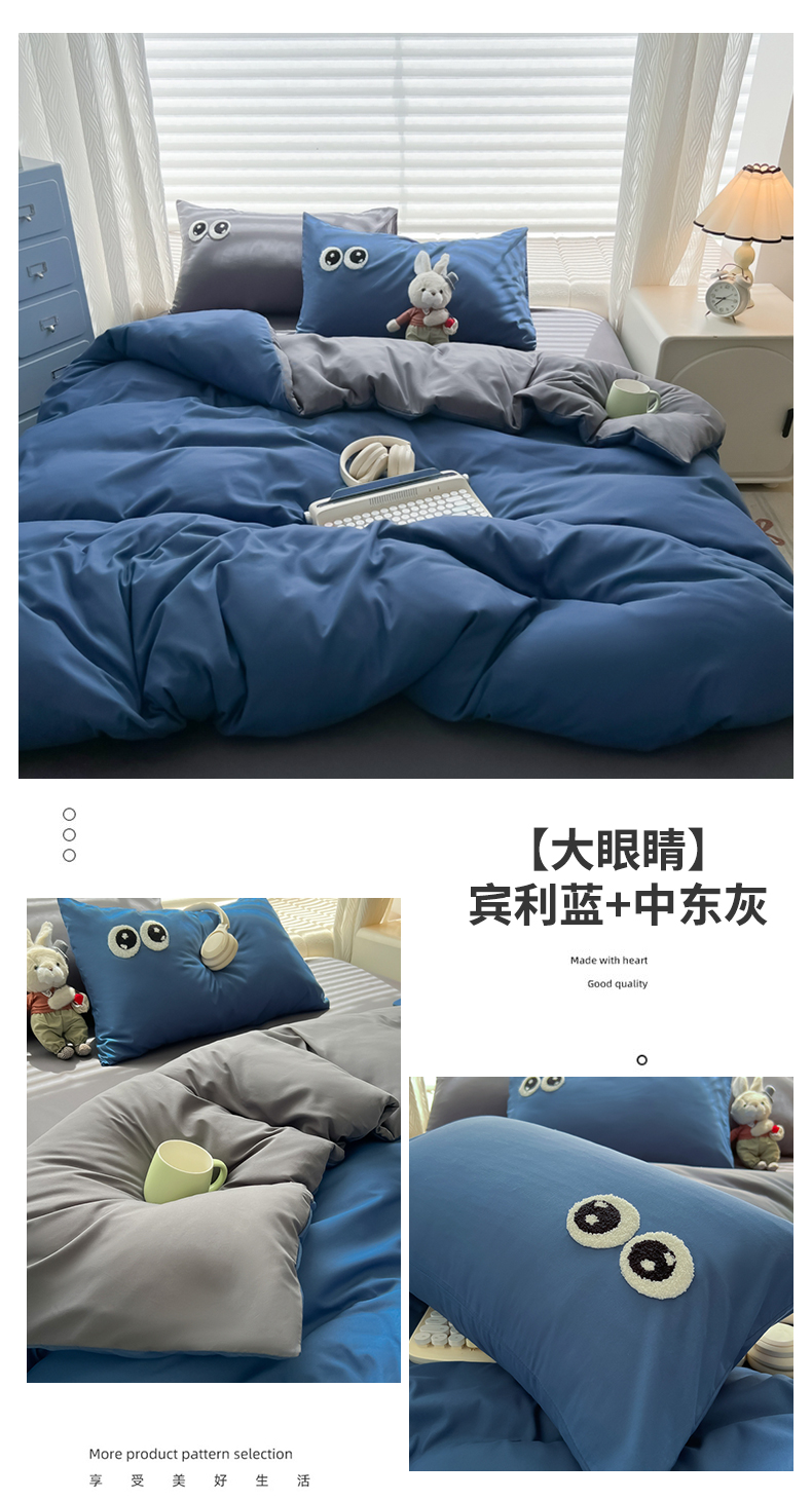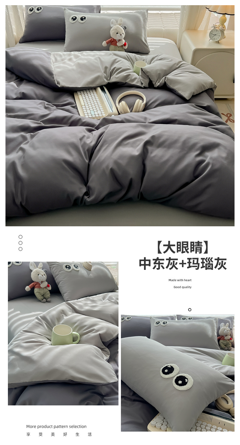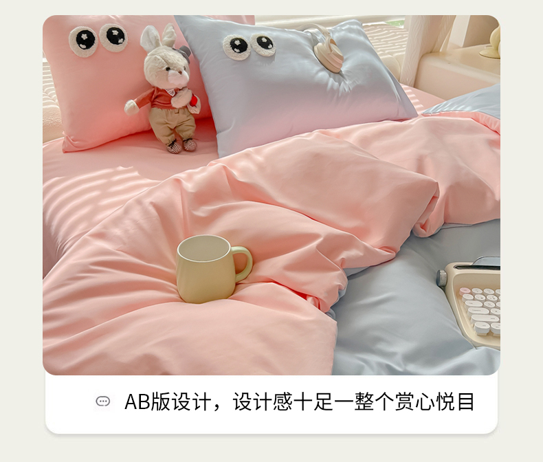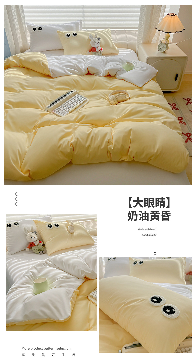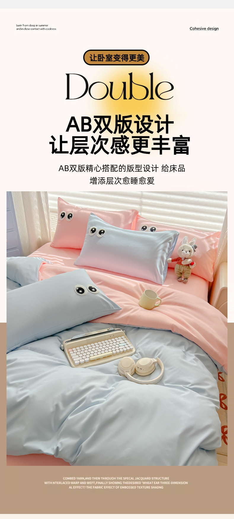 商品名称:(总)(有买家秀)2025新款大眼睛毛巾绣水洗棉纯色双拼四件套简约高级治愈风超柔舒适床上用品